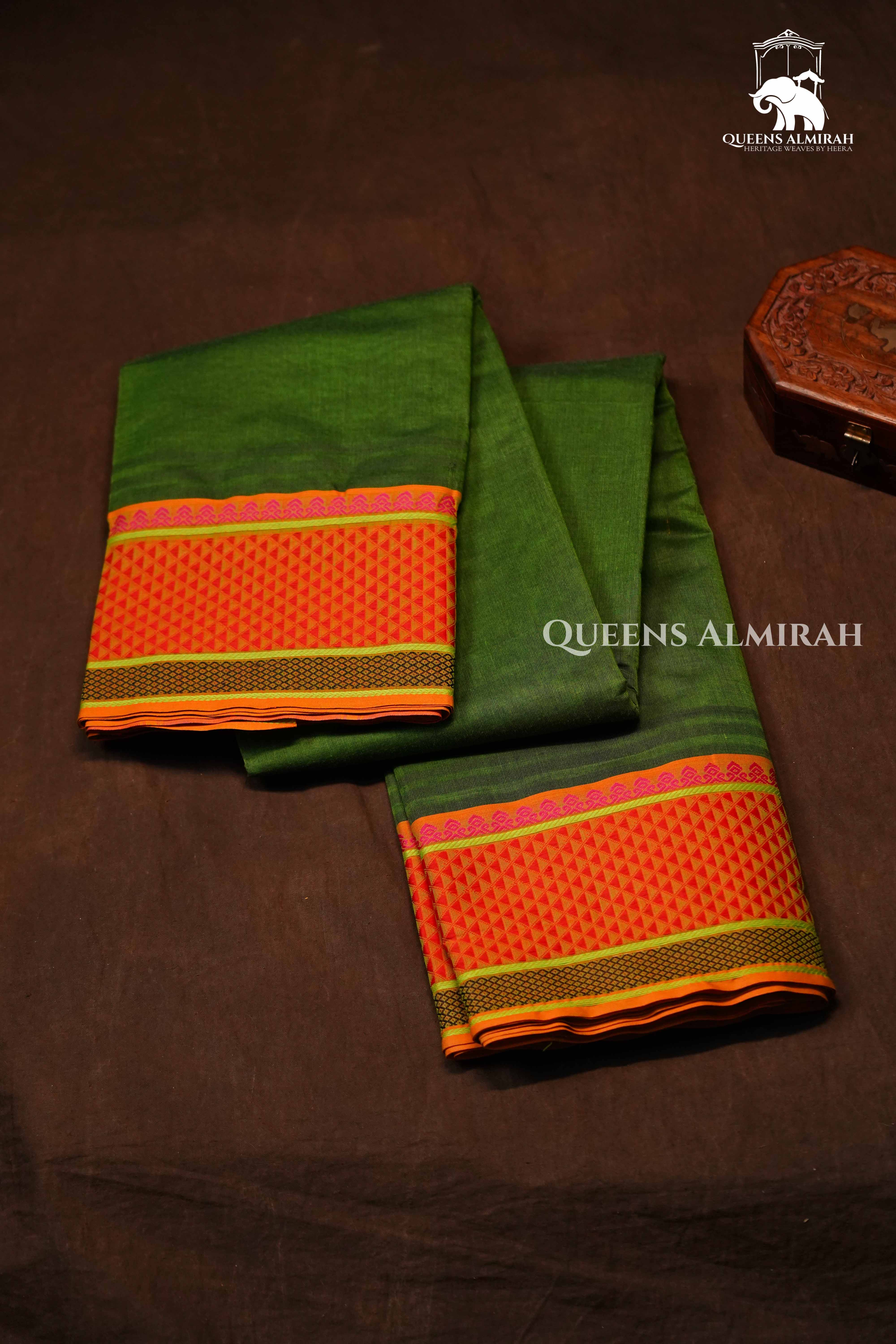 This exquisite Chettinad cotton saree features a rich parrot green body complemented by a vibrant dual-tone border in orange and pink. The border is adorned with a classic diamond pattern, enhancing its traditional appeal. Crafted in authentic handloom style, this saree is perfect for festive occasions, temple visits, and cultural celebrations.