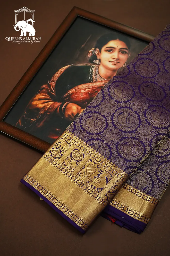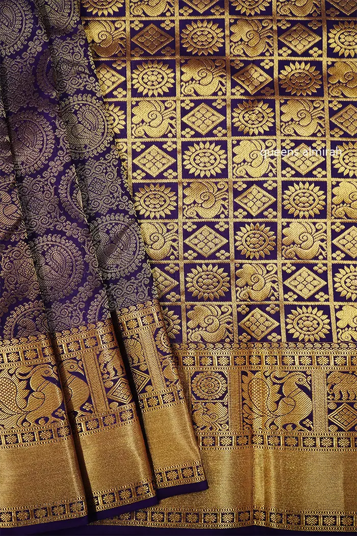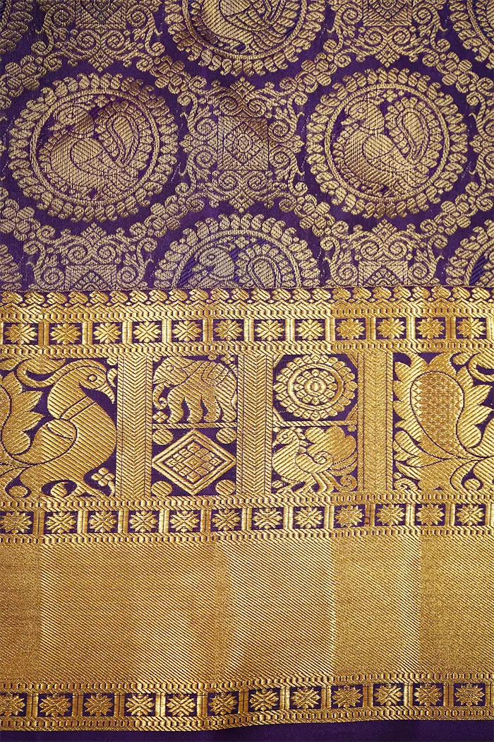 Discover the elegance and comfort of our Dark Purple with Golden Pure Kanchivaram Silk Saree. Made of soft and rich silk, its impeccable design exudes a royal feel. Perfect for any occasion, it's easy to wear and adds a touch of sophistication to your wardrobe.