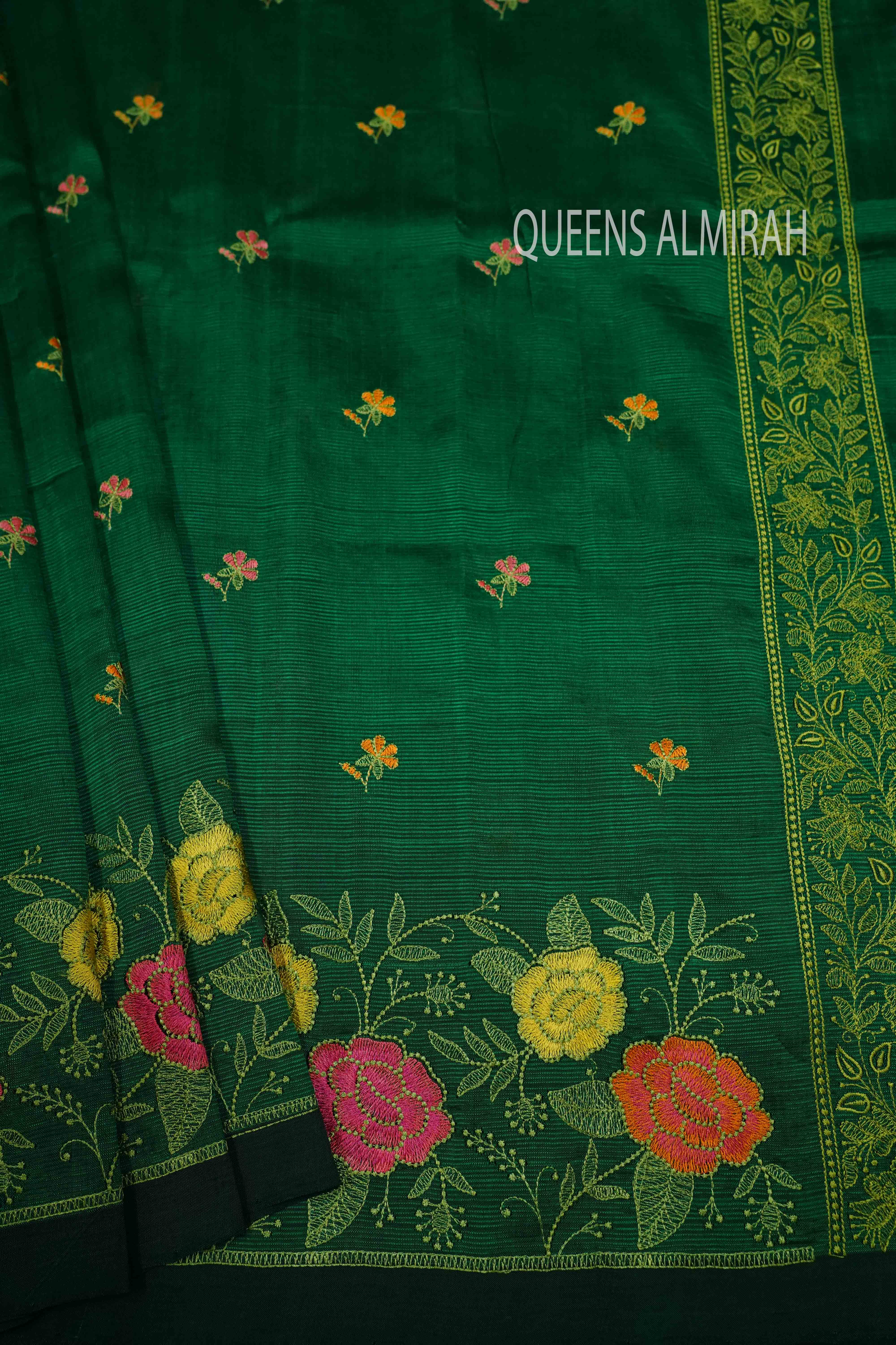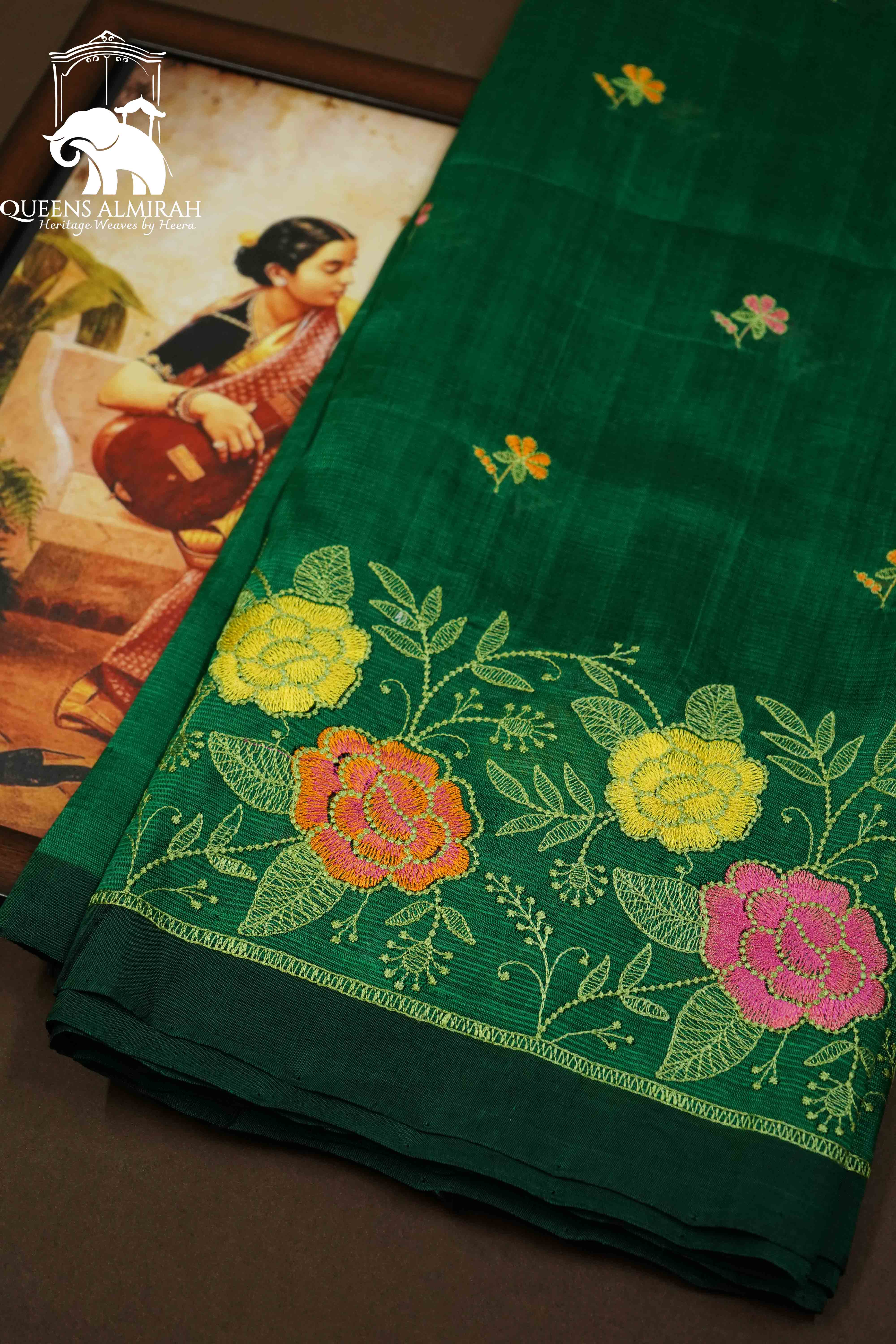 This dark spring green saree features intricate thread embroidery and a luxurious floral motif, adding a unique touch to your wardrobe. Made from high-quality Mangalgiri fabric, this saree is perfect for special occasions. Elevate your style with this elegant and one-of-a-kind piece.