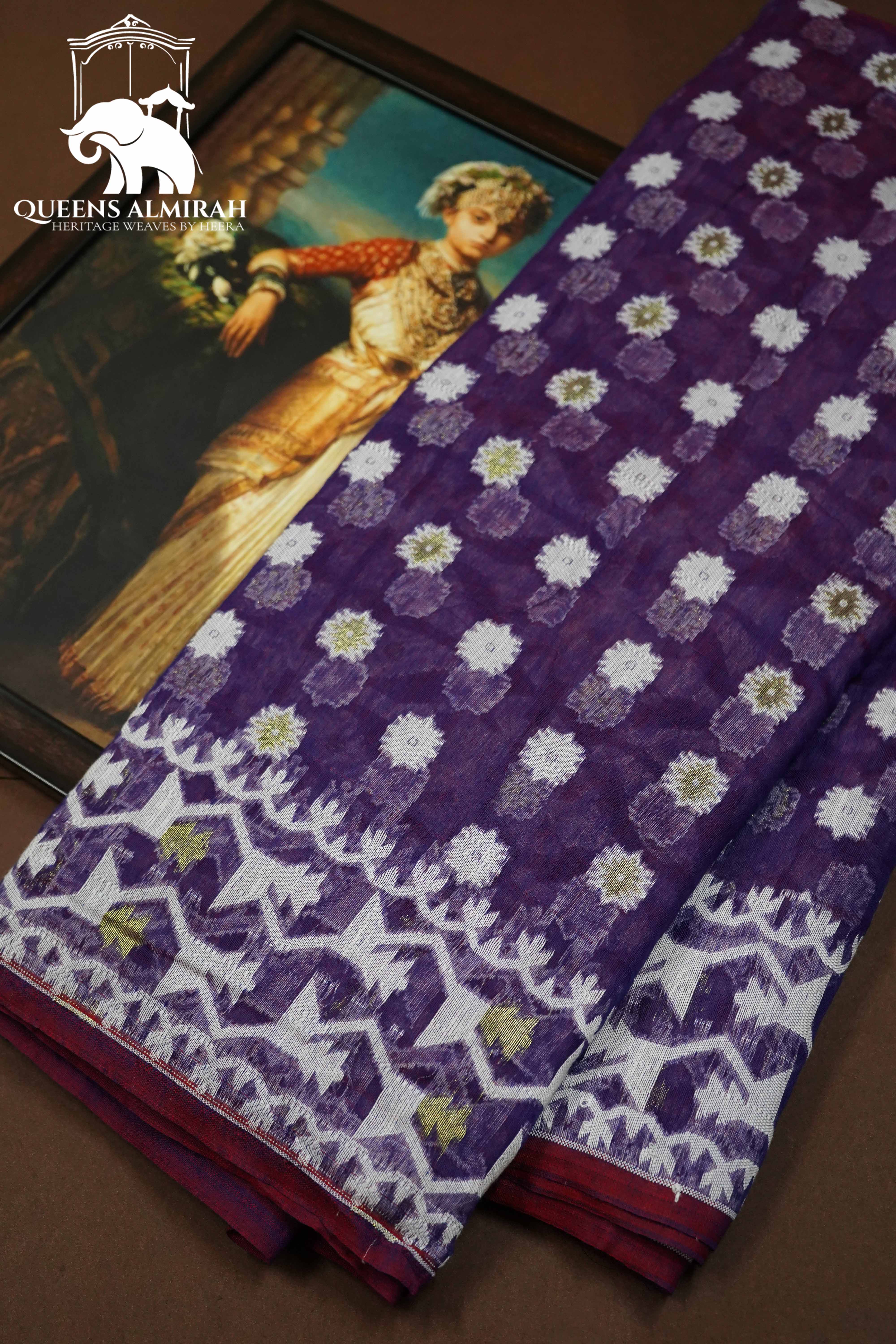 As a product expert, I present to you the DEEP PURPLE JAMDANI COTTON SAREE - the perfect combination of comfort, durability, and elegance. Made with high-quality cotton, it ensures a soft and breathable wear for any weather. The intricate Jamdani designs add a touch of sophistication, perfect for any occasion.
