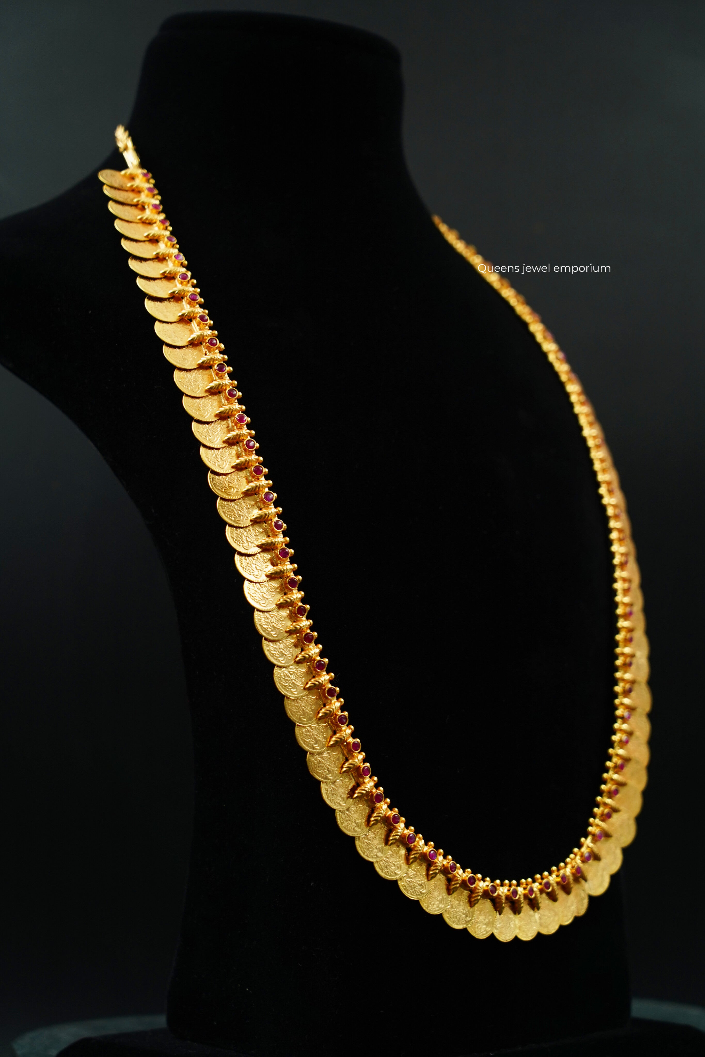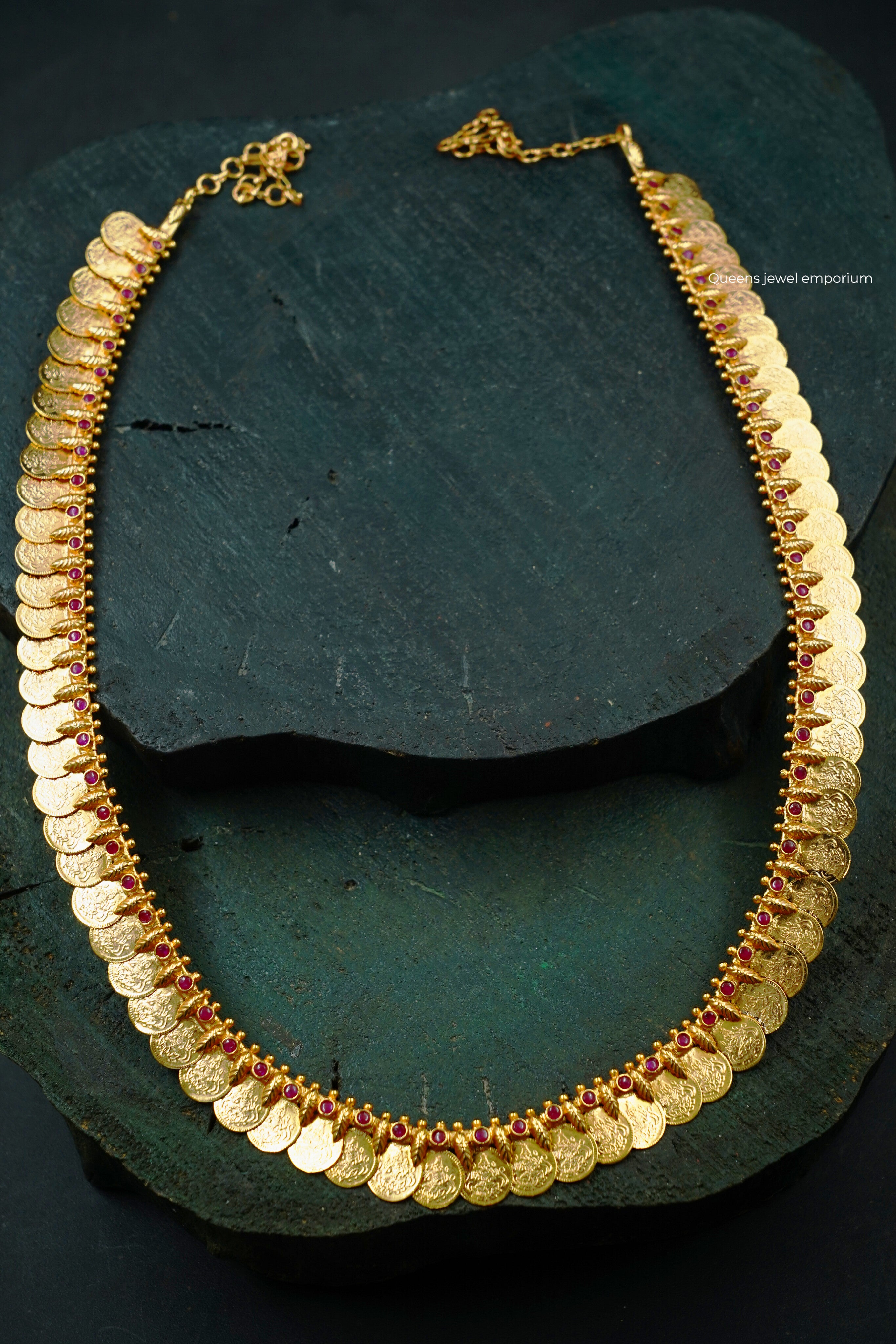 A stunning Nagas Lakshmi motif haram featuring intricate leaf designs and vibrant red kemp stones, perfect to elevate any traditional outfit. This heirloom-inspired piece brings timeless grace to every occasion. Truly a treasure to pass down for generations, handcrafted by our expert artisans at Queens Jewel Emporium.