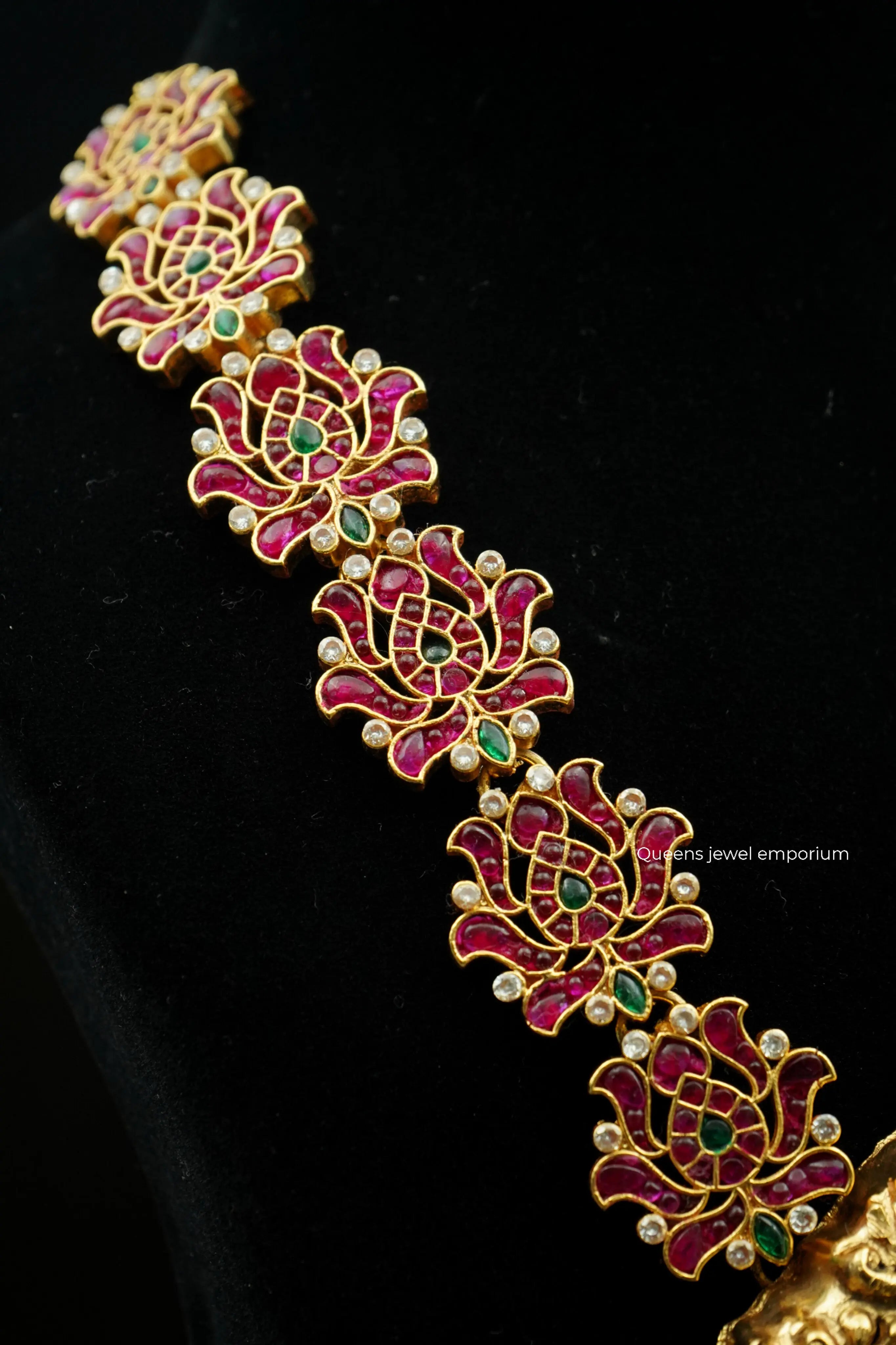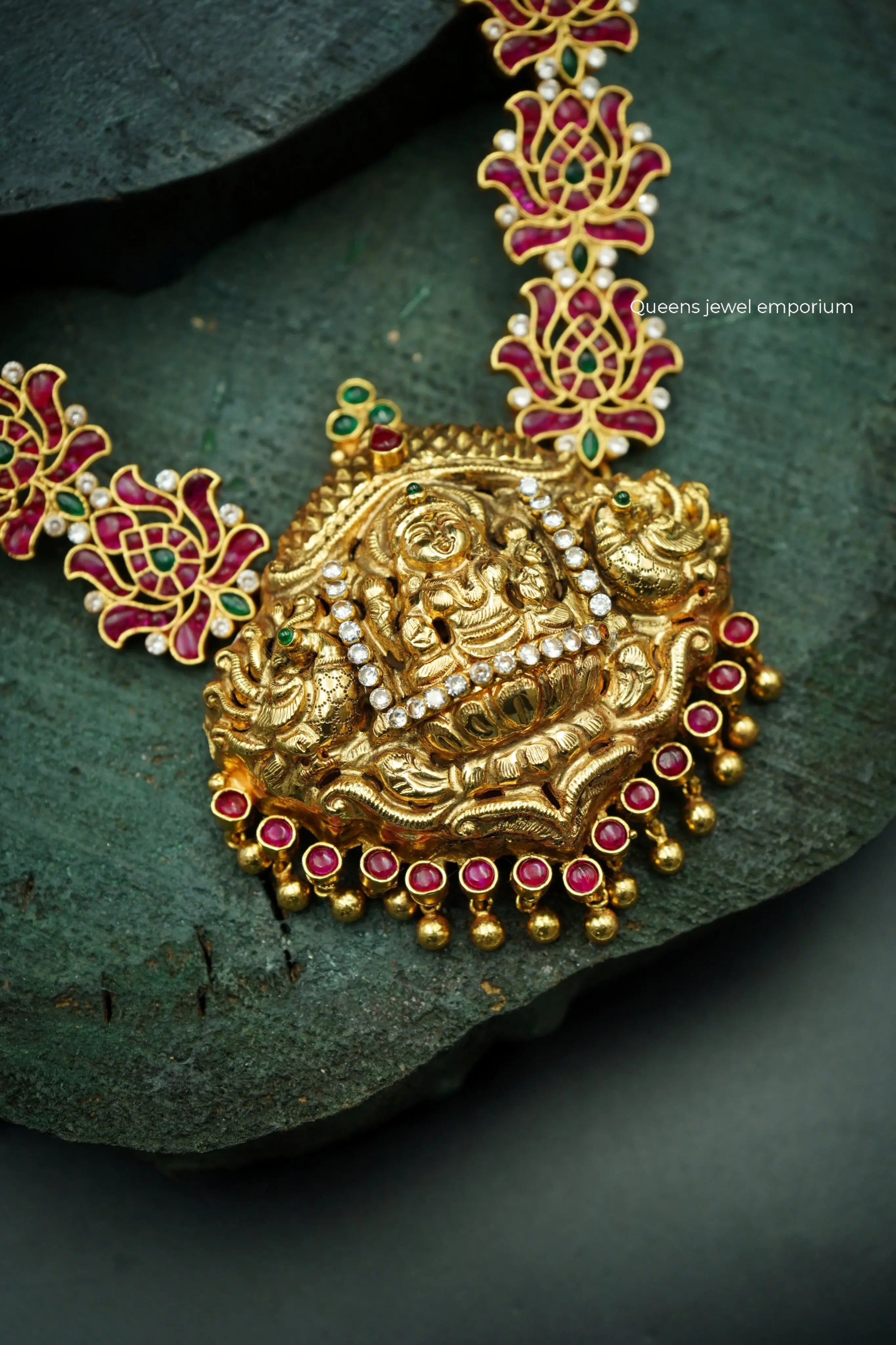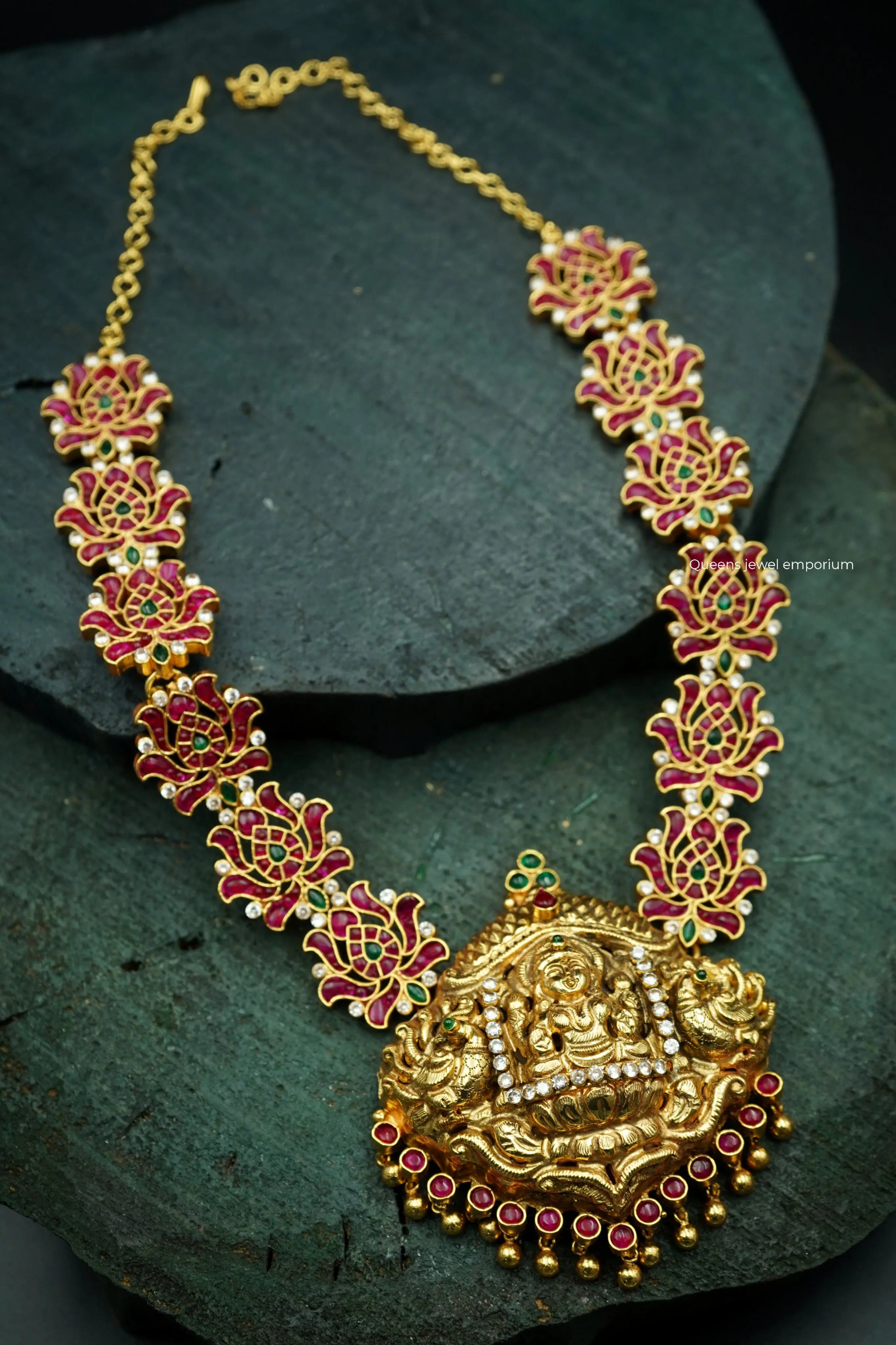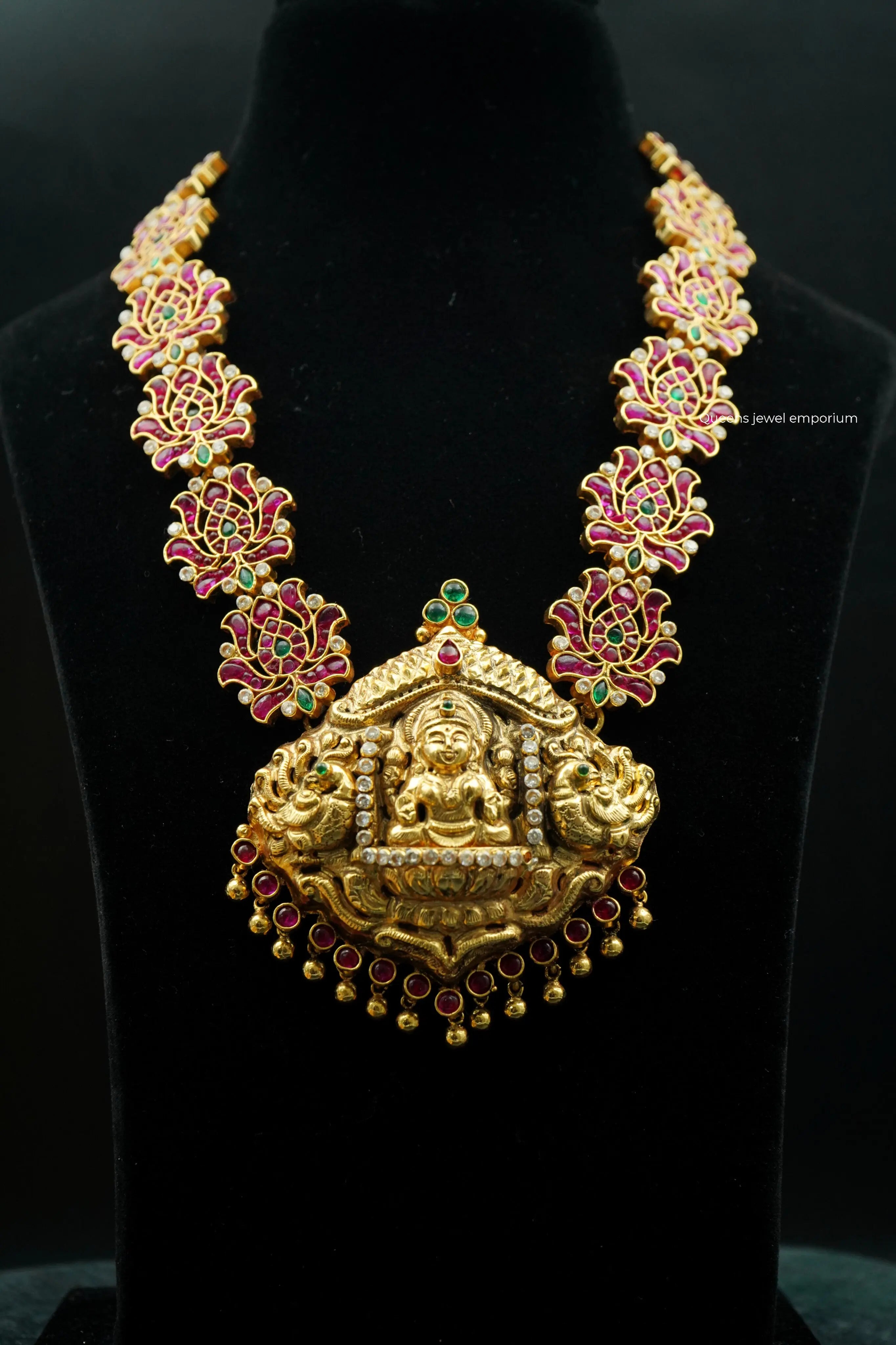 Introducing the DEVLAKSHMI HARAM, a stunning piece adorned with Nagas work and Lakshmi pendant. Kemp stones and a lotus design with gold balls add a touch of elegance. Made with gold plated and silver alloy, it's perfect for weddings and offers a gold-like appearance. Expertly crafted for a truly luxurious look.