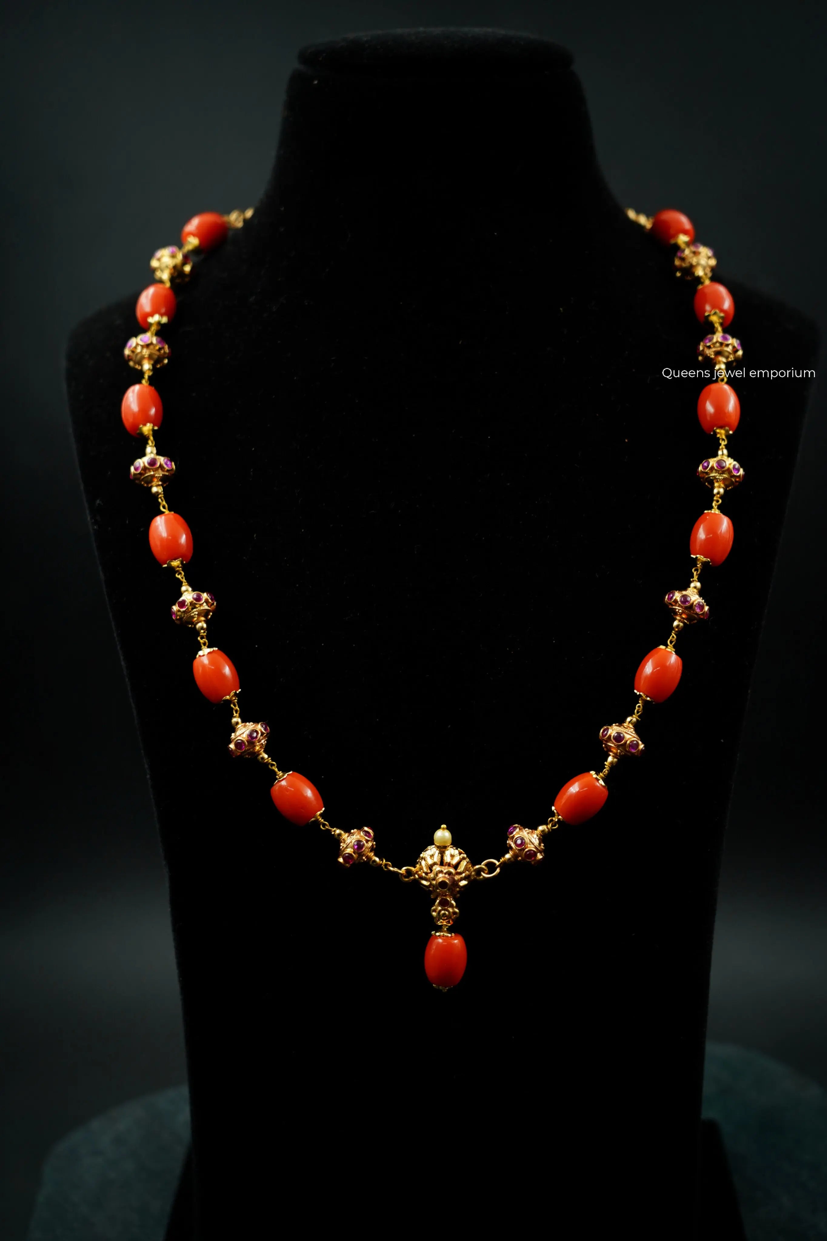 Add a touch of elegance and sophistication to your look with our beautiful coral bead and kemp stone haram. These intricately designed earrings are perfect for pairing with a grand maxi, making them the perfect choice for any special occasion. Their vibrant colors and regal appeal make them a must-have accessory.
