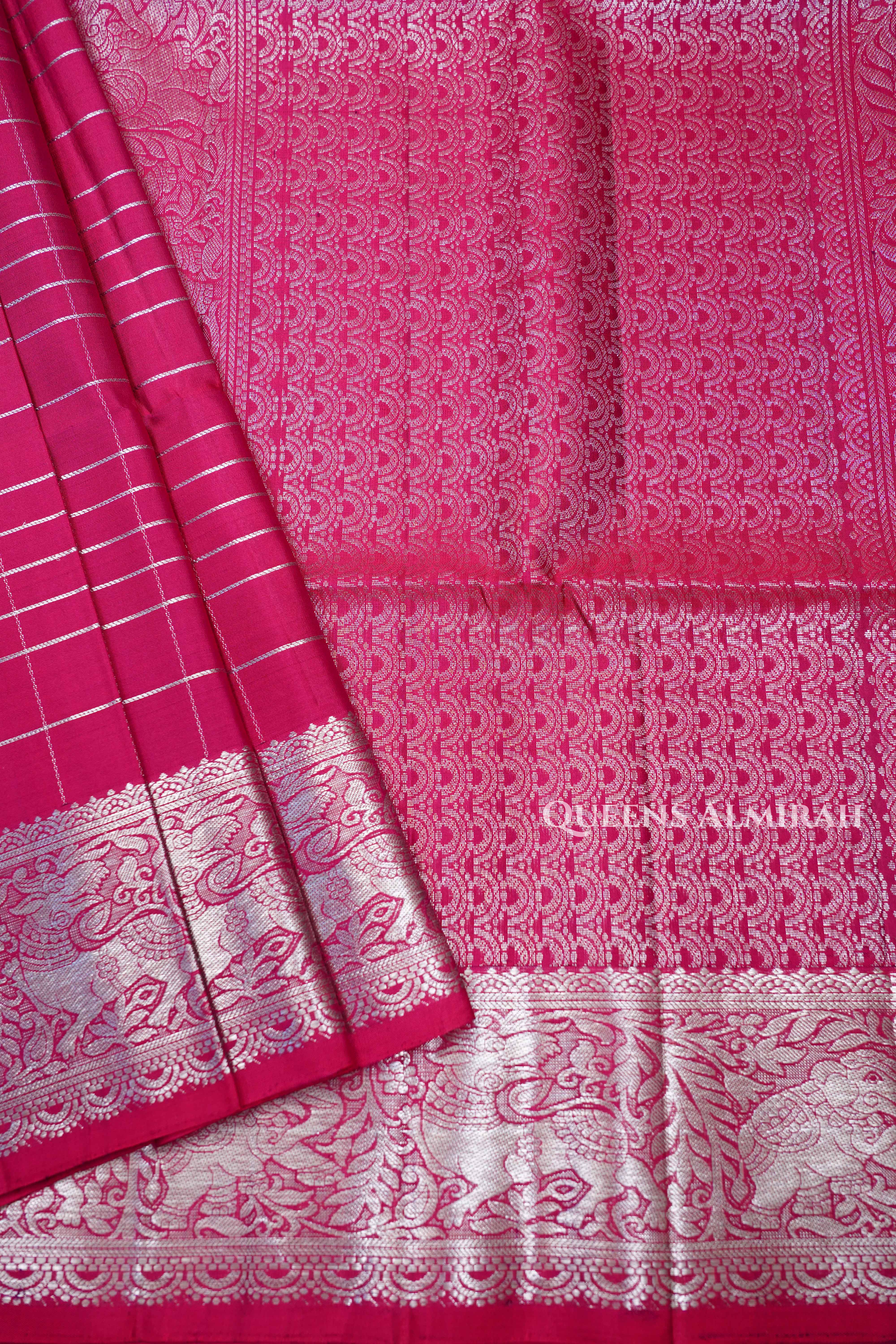 This vibrant pink Pure Kanchivaram soft Silk Saree from Queens Almirah is adorned with silver zari checks and richly woven motifs. The contrast zari pallu and border add a regal charm, making it a perfect drape for weddings, festivals, and grand celebrations. A timeless weave that blends tradition with elegance.