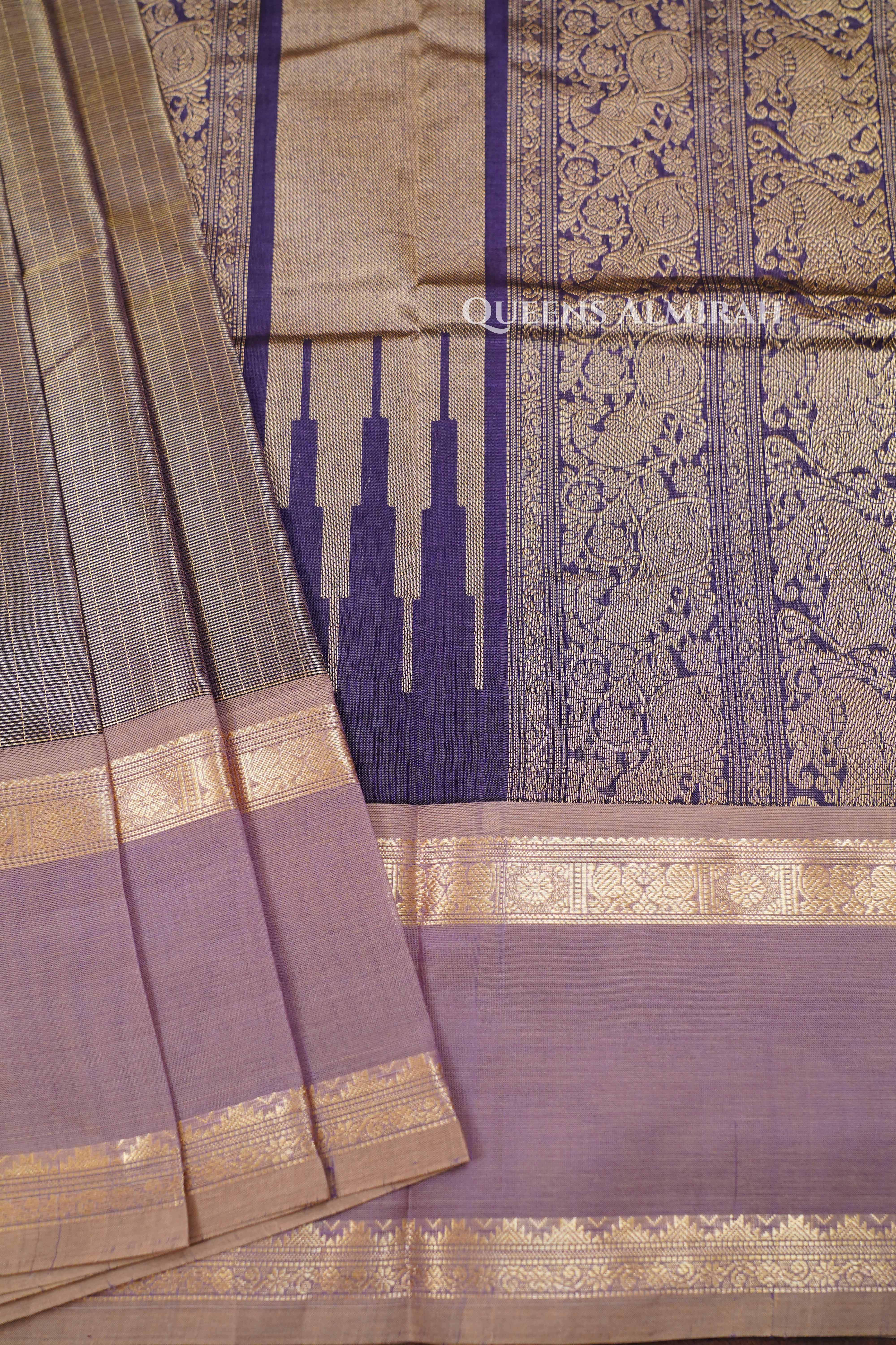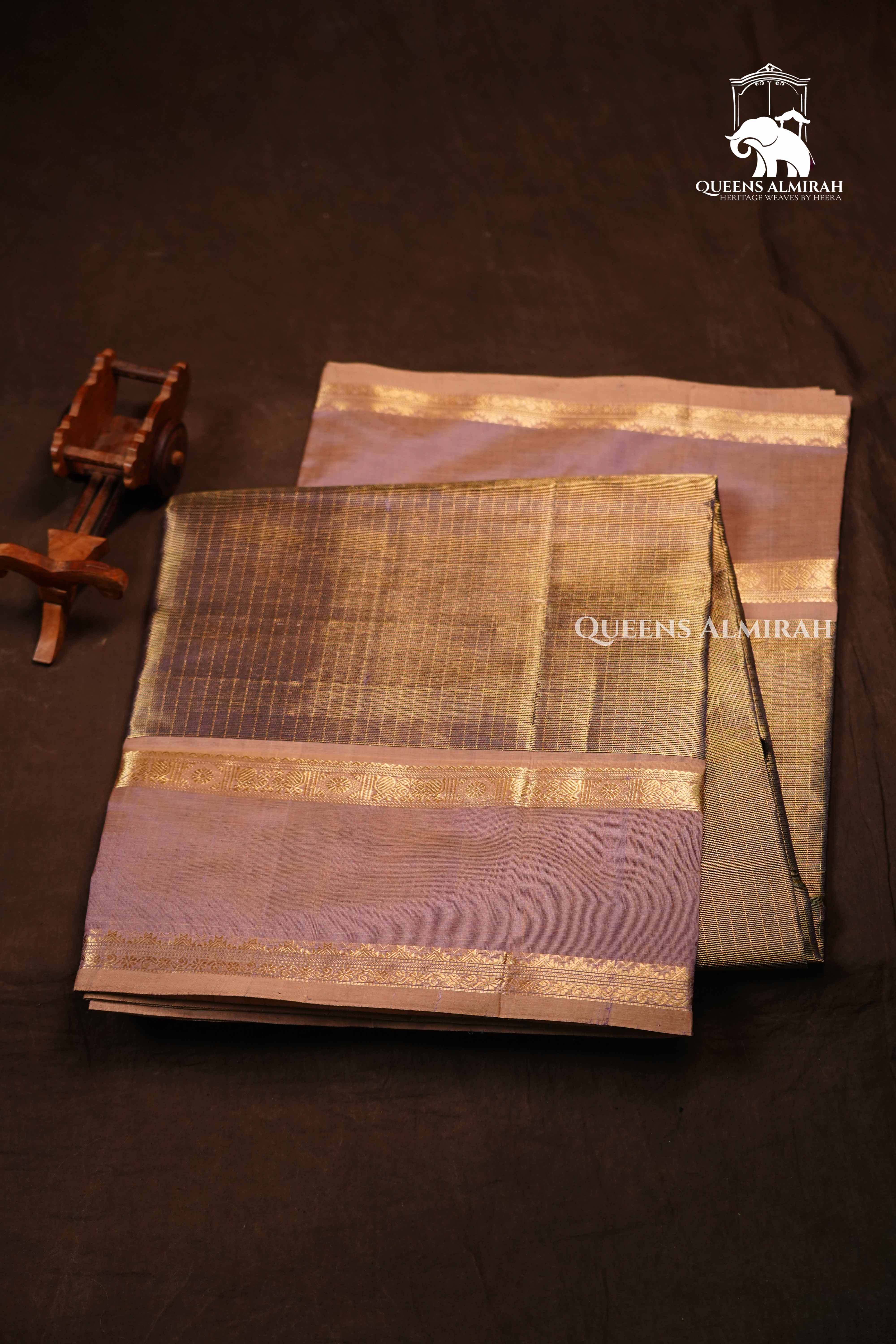 This isn’t your typical Kanchi silk cotton — it’s a rare Chettinadu masterpiece woven by traditional Karaikudi artisans and sourced directly from the weavers. The rich Dual Shade Of Brownish Purple saree tone, antique gold threadwork, and glistening grid-textured body come together in a saree that feels like silk and radiates quiet opulence. A timeless piece perfect for heirloom-worthy moments and graceful celebrations.