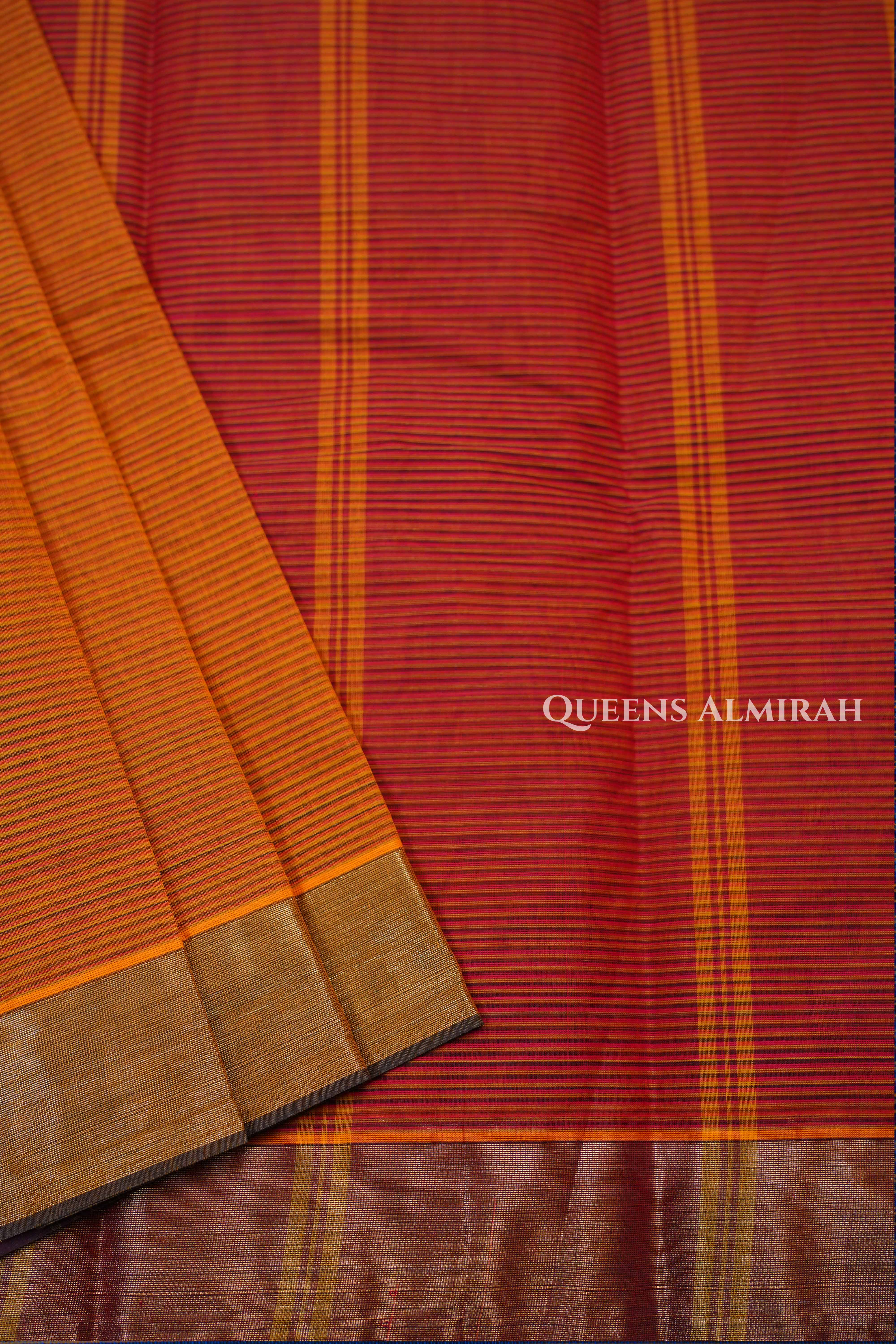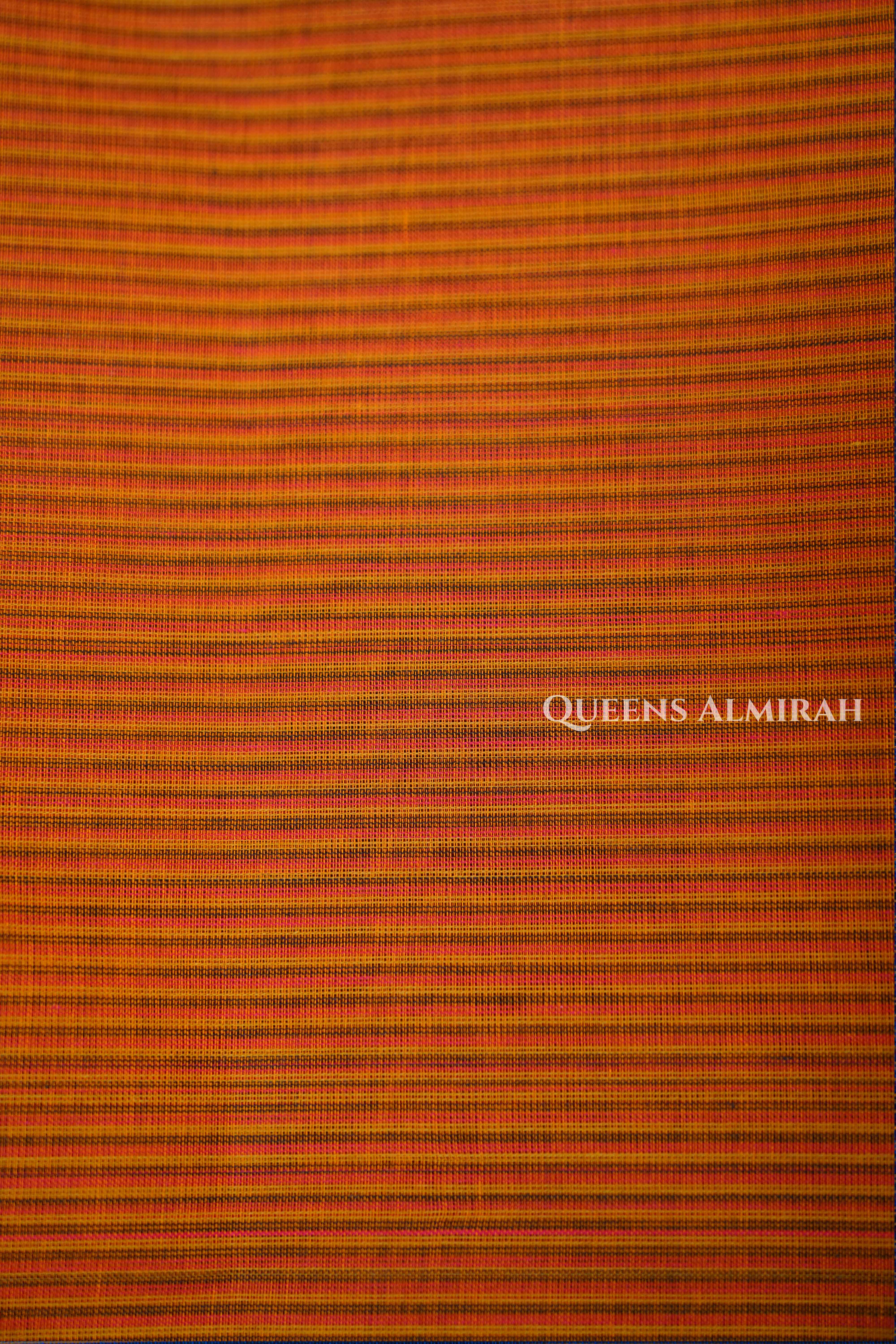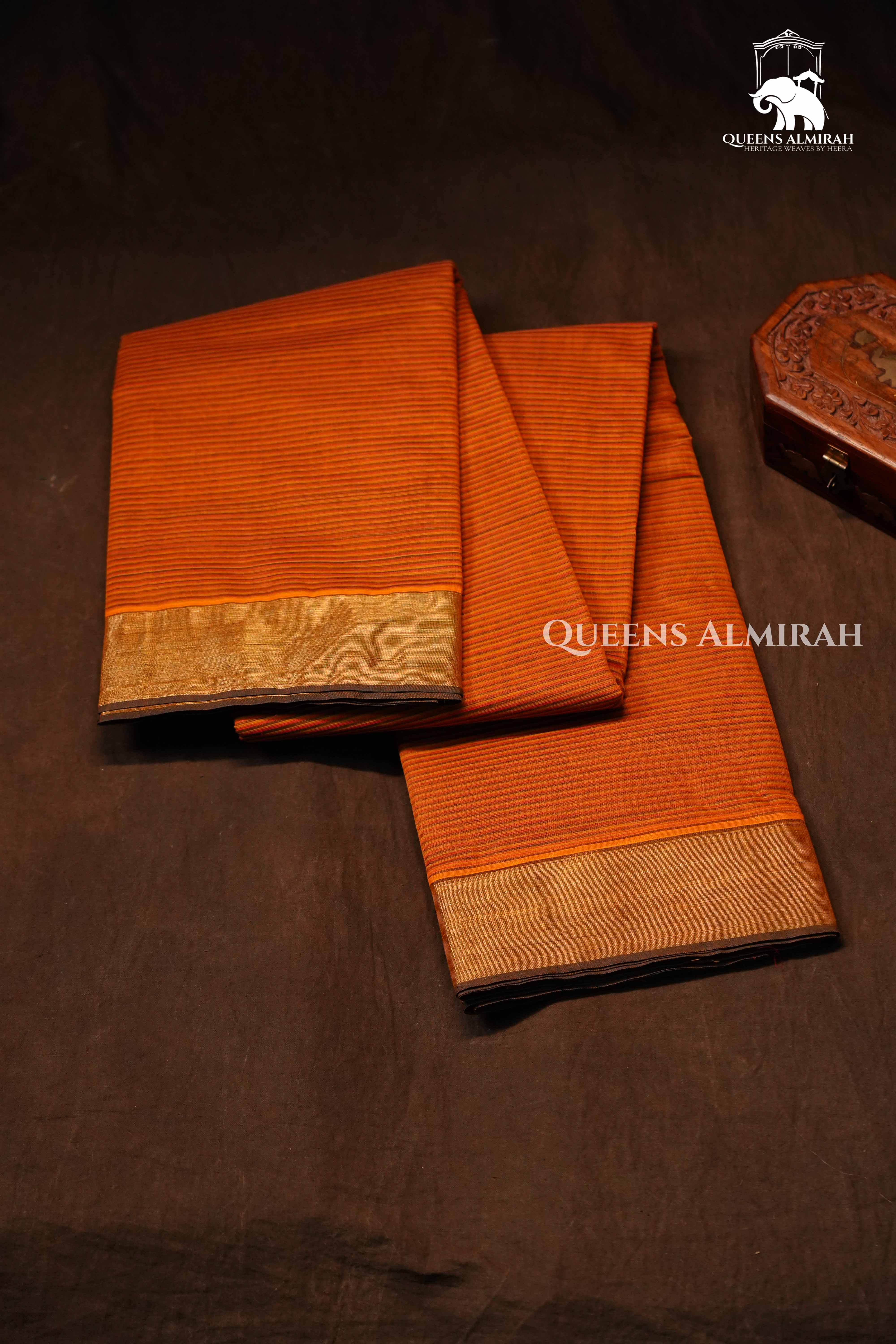 This striking Chettinad cotton saree features a vibrant burnt orange base with delicate pinstripes, reflecting the rich heritage of traditional weaving. The golden brown border adds a subtle shimmer, perfectly complementing the warm tone of the body. Lightweight, breathable, and easy to drape, this saree is ideal for festive gatherings, casual wear, and cultural occasions.