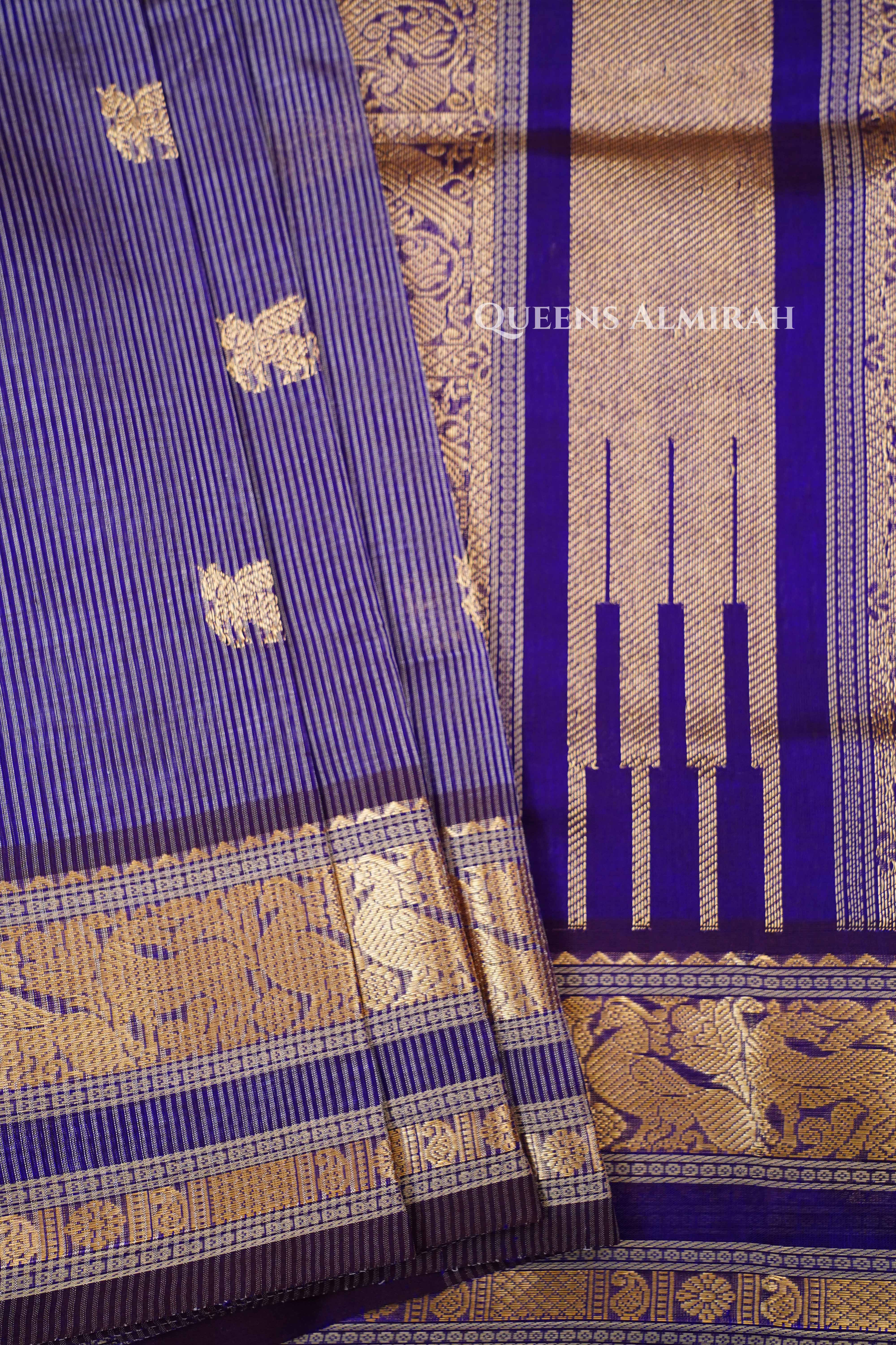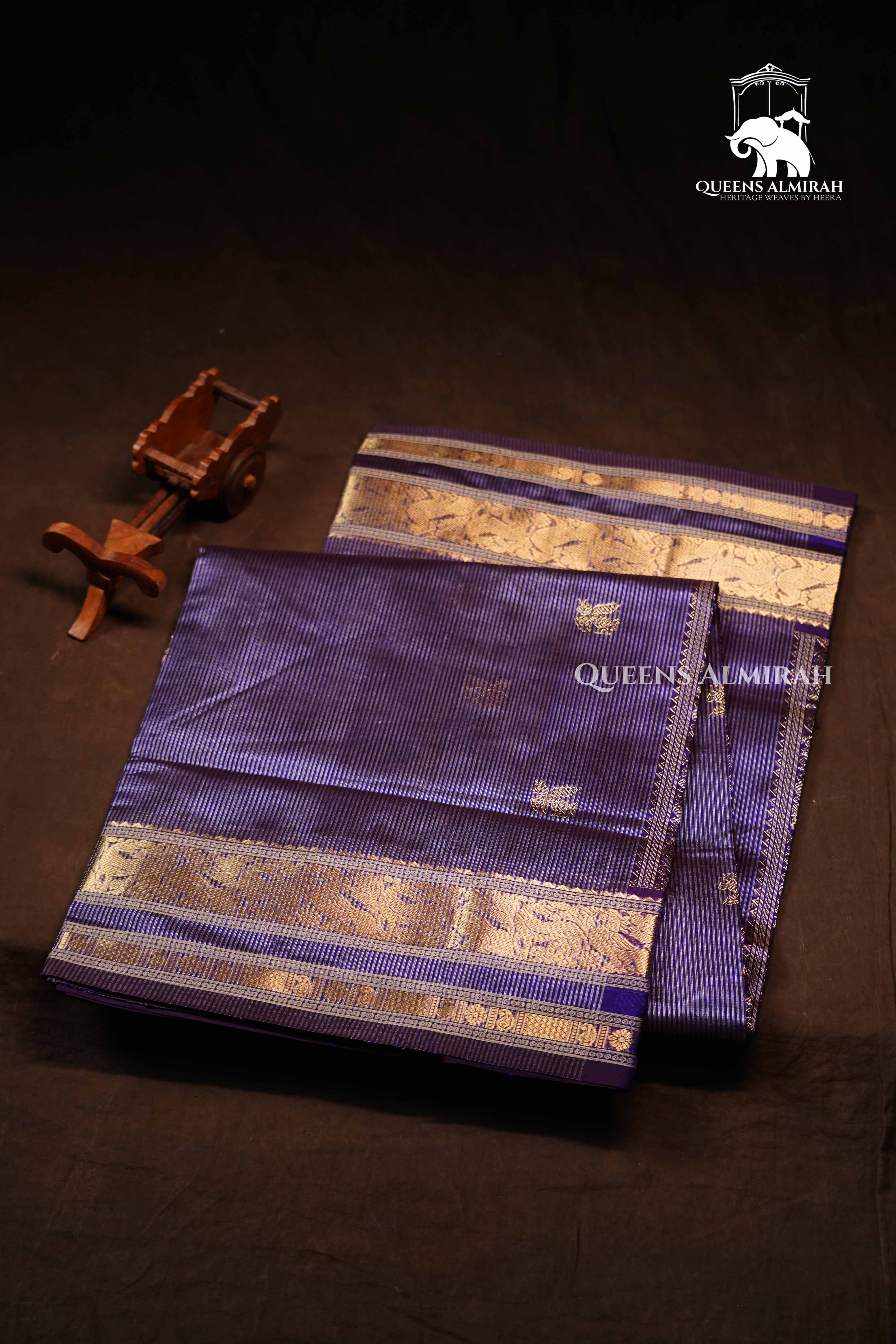 “A Dusky Purple Chettinad silk cotton saree adorned with subtle pinstripes and an opulent golden zari border featuring intricate floral motifs, exuding traditional grandeur and sophistication.”