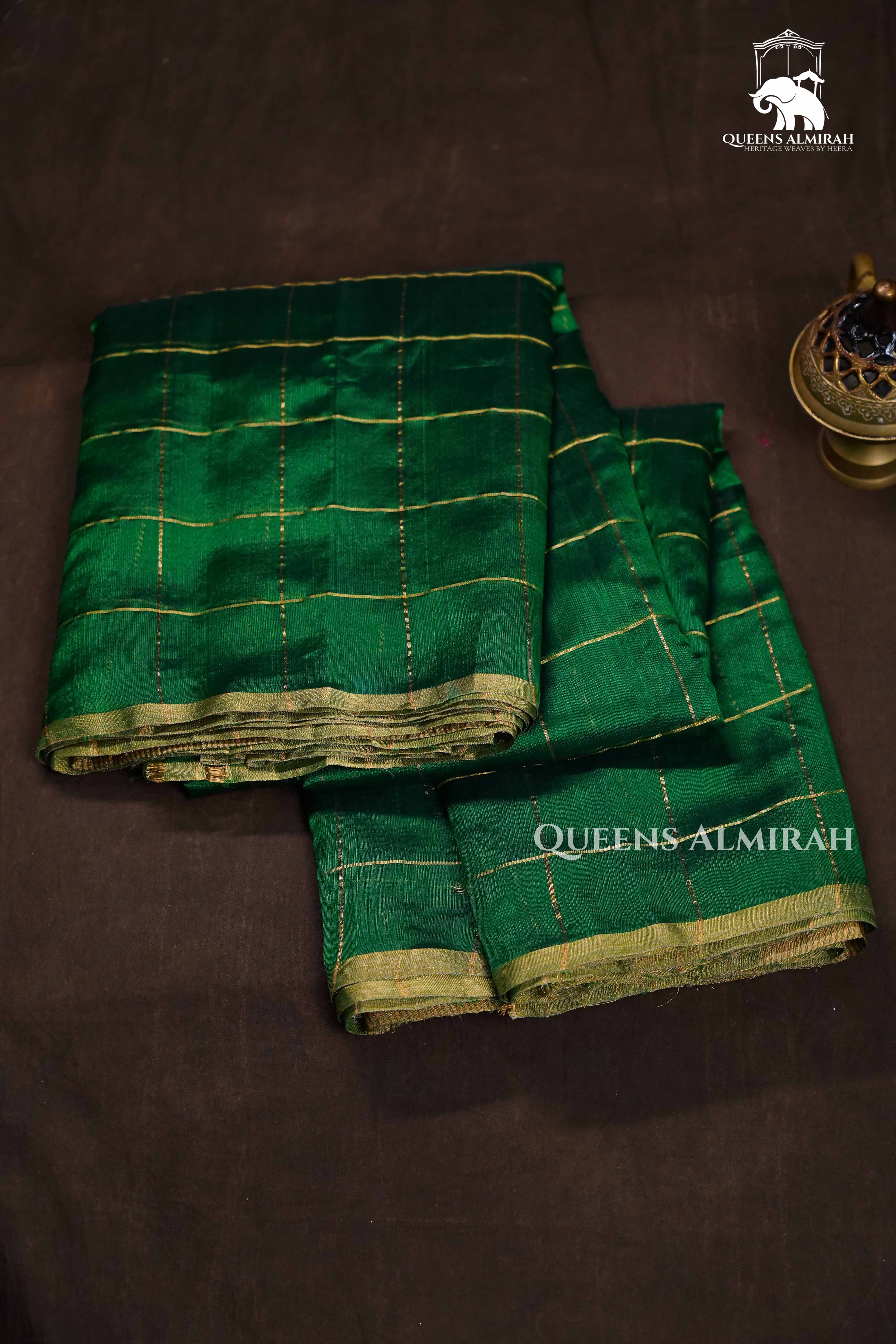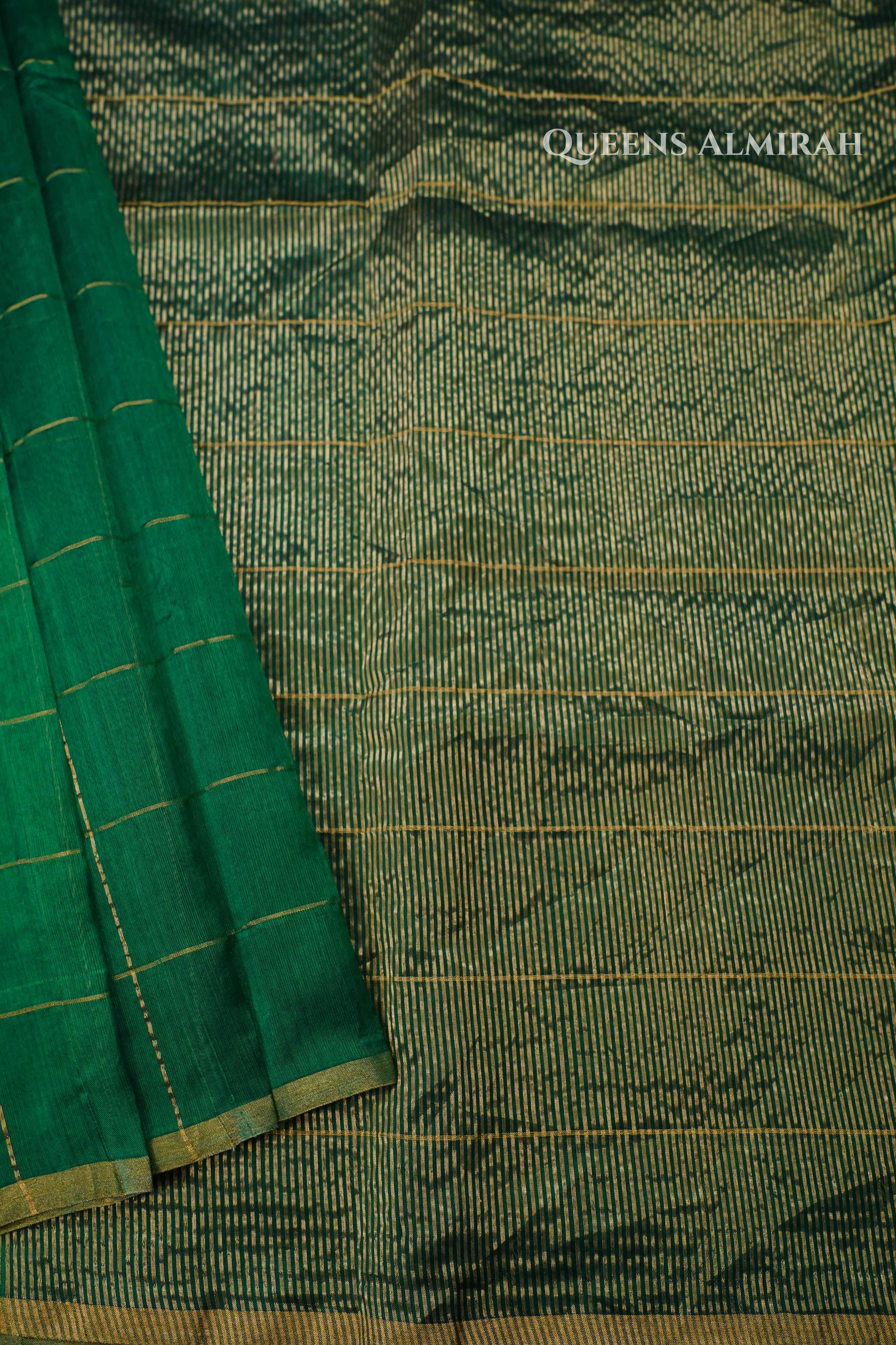 Elevate your ethnic wardrobe with this emerald green handloom chanderi silk saree, beautifully woven with golden zari checks across the body. The rich jewel-toned green base is complemented by a subtle sheen and a classic zari border, exuding elegance in every drape. Perfect for festive occasions, temple visits, or traditional events, this saree offers a lightweight feel and a graceful silhouette—ideal for women who adore timeless weaves with a contemporary flair.