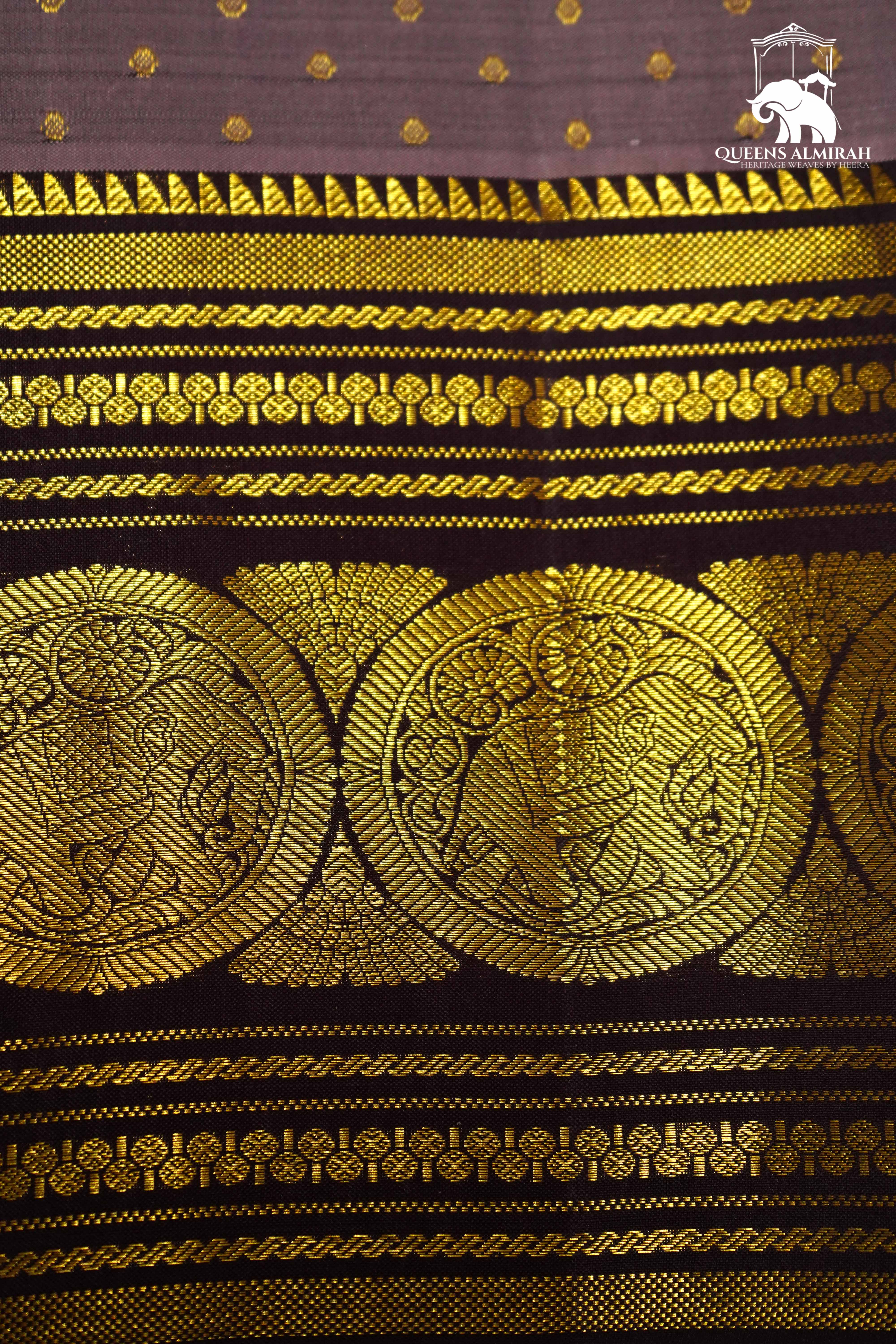 Inspired by Raja Ravi Varma's "Sri Krishna as a Young Child with Foster Mother Yashoda", this exquisite Kanjeevaram saree is crafted from high-quality silk. The faded purple and matte purple combination offers a unique and timeless elegance, making it a sophisticated addition to your wardrobe.