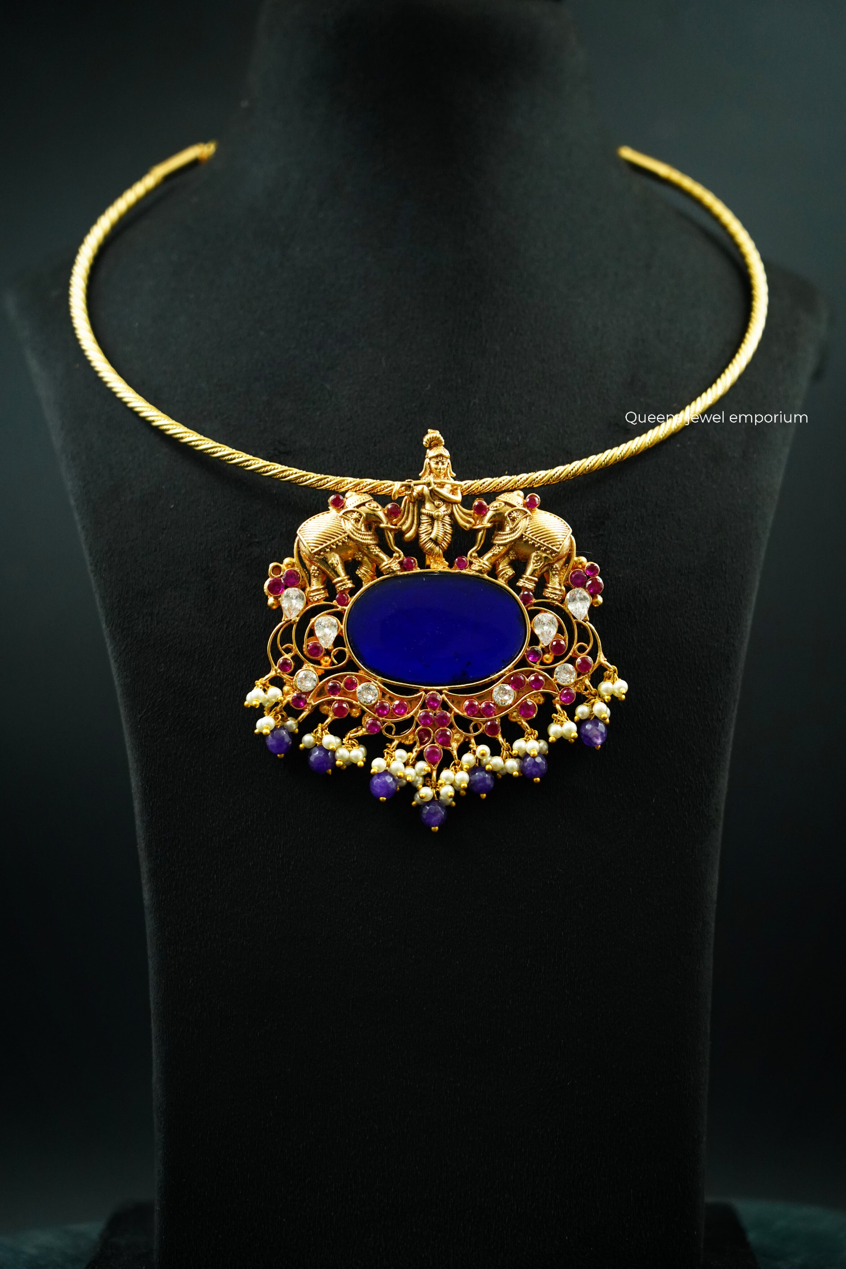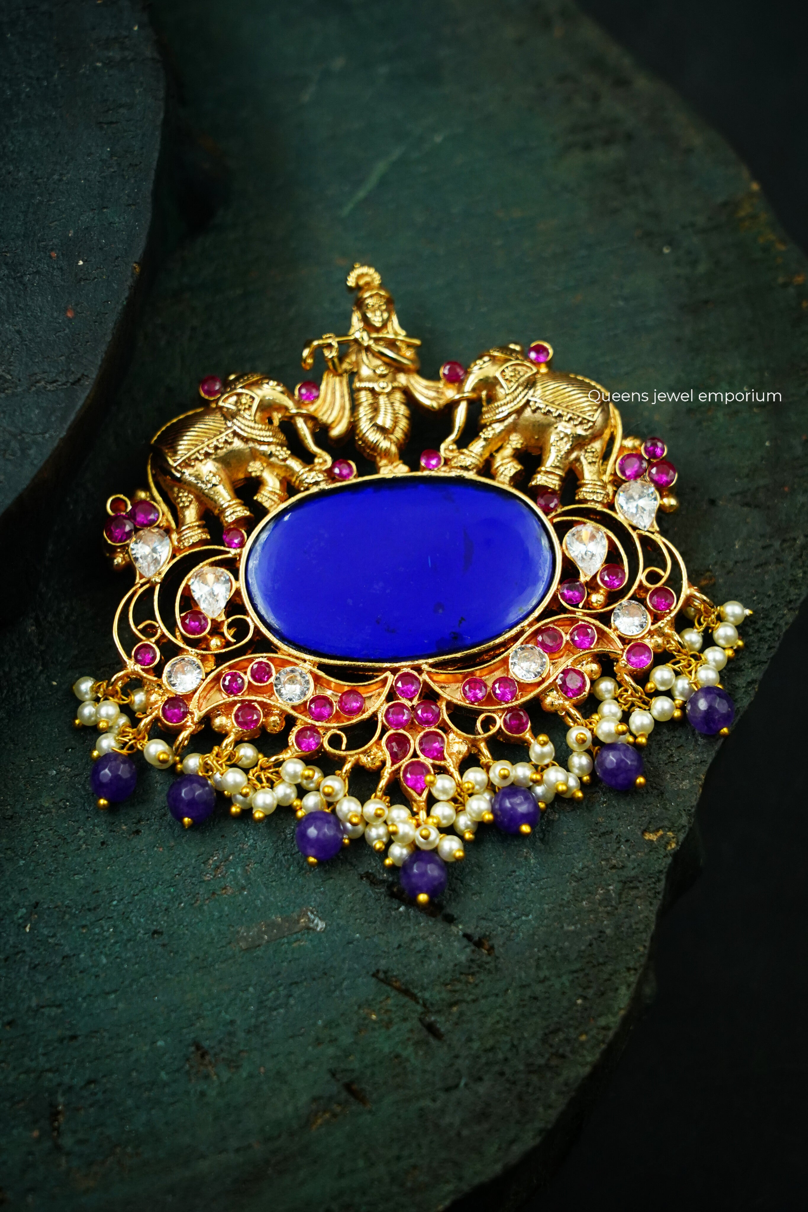 Oval blue onyx centerpiece with floral design, flanked by two elephant nagas motifs and Krishna nagas motif, adorned with Balaji pink and zircon stones, finished with purple beads and baby pearl hangings. A majestic pendant, handcrafted by Queens Jewel Emporium for regal elegance,at queens.Special occasion for onam.