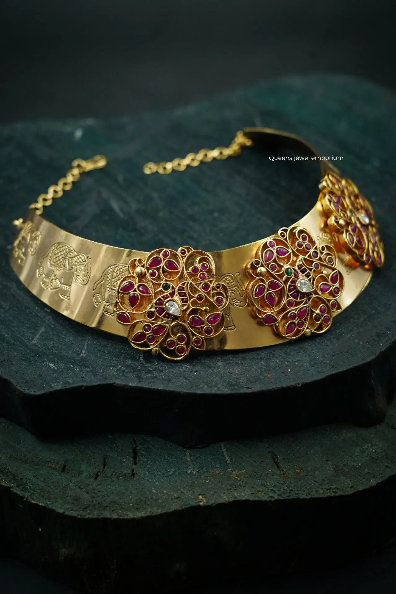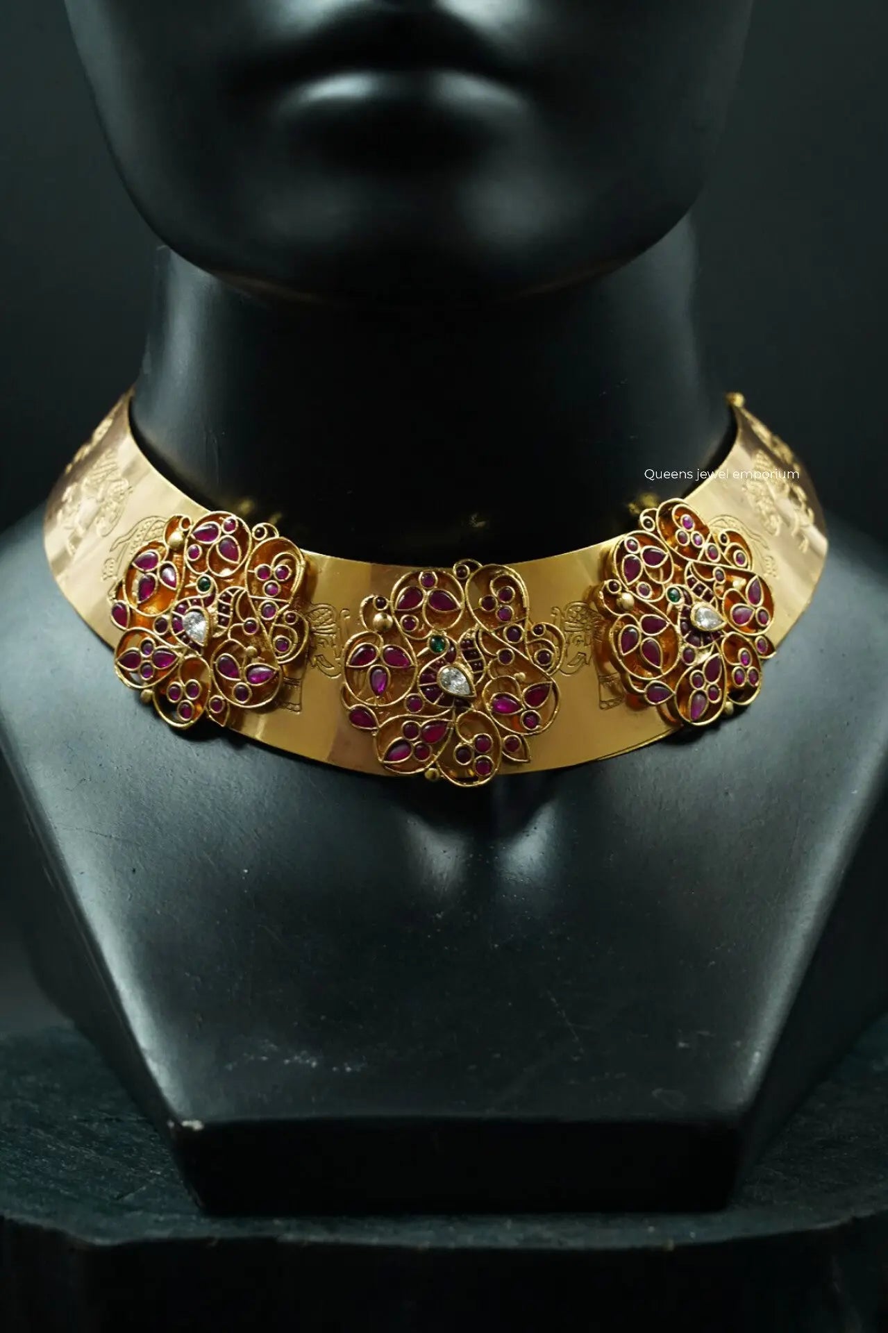 This elegant nagas hasli necklace features three small rakadai designs and intricate Nagas elephant motifs, with classic floral patterns embedded on a traditional beaten sheet finish. Accented with deep red kemp stones, it embodies rich South Indian heritage.Tradition woven into every detail—handcrafted by our expert artisans.