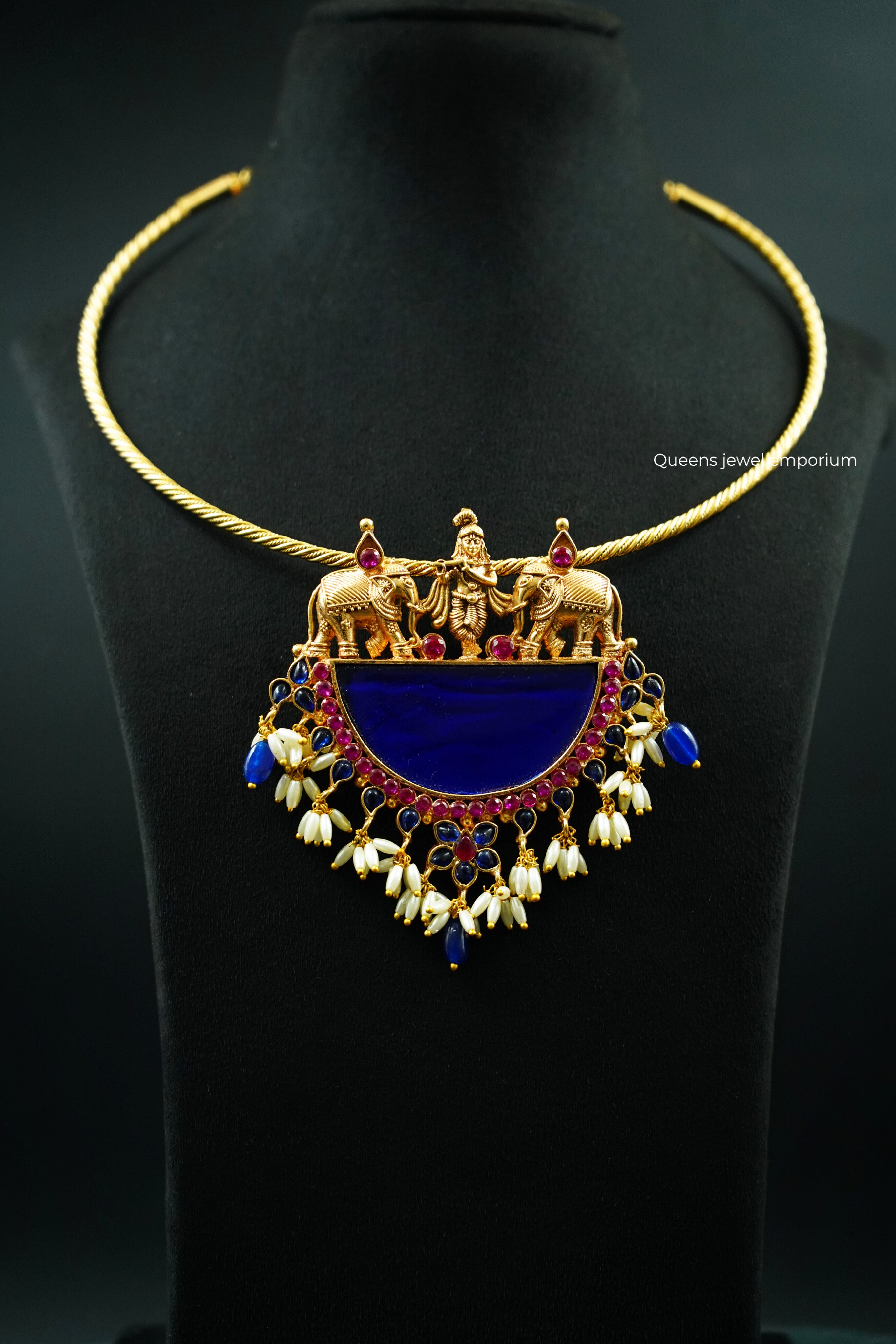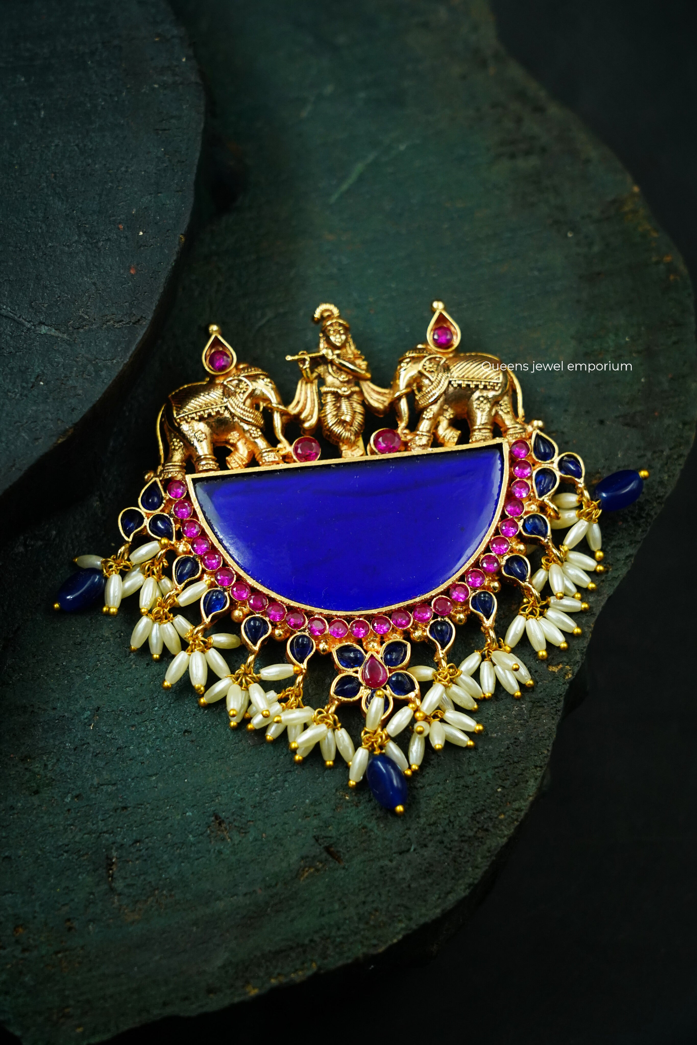 Half-circle blue onyx stone with two elephant nagas motifs and Krishnar nagas motif at center, in floral design adorned with Balaji pink and blue kemp stones, finished with onyx blue beads and rice pearl hangings. A majestic pendant, handcrafted by Queens Jewel Emporium for royal elegance.