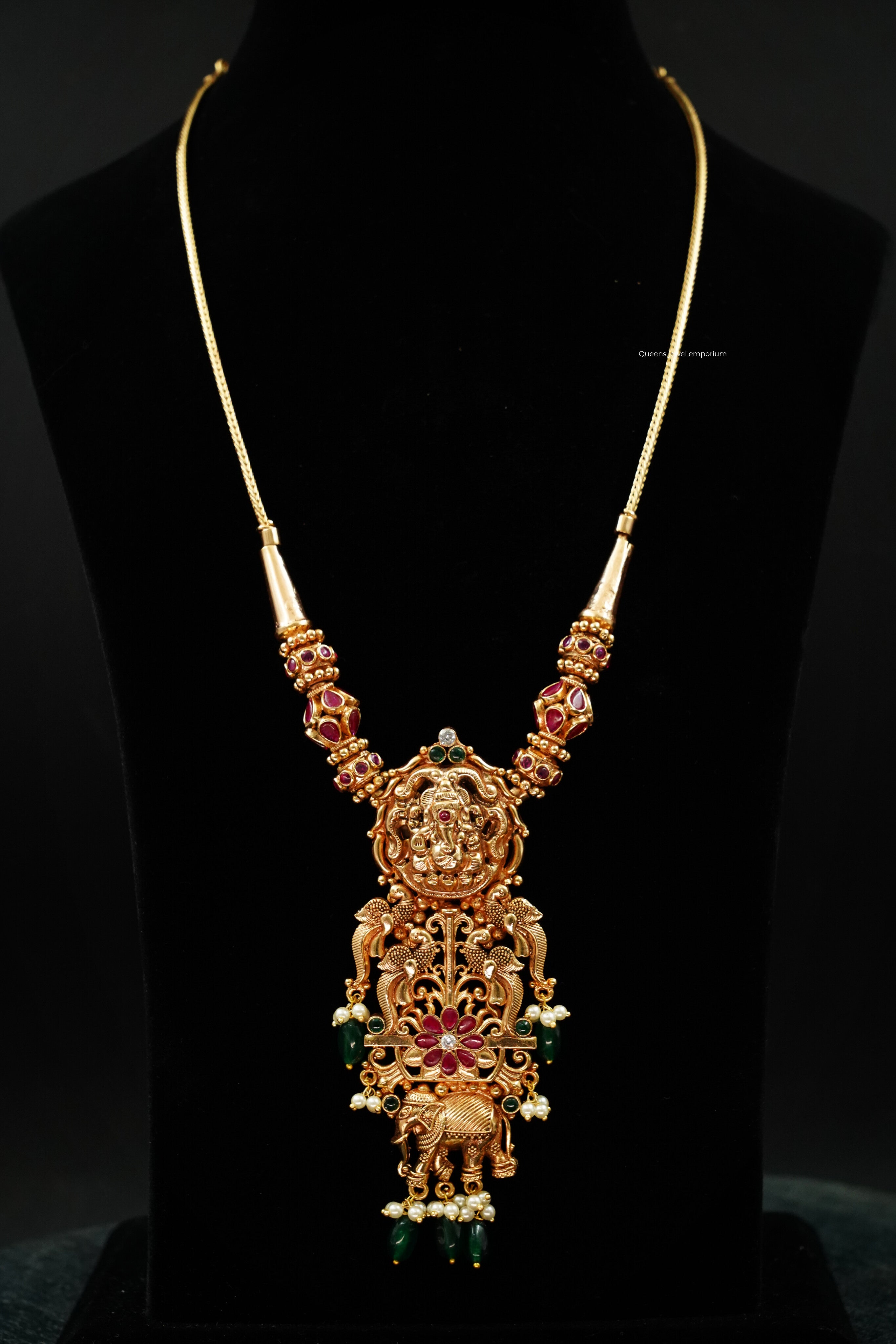 Grand gnanabal Kodi necklace in Karaikudi style featuring Vinayagar nagas motif, four nagas kizhi accents, floral and nagas elephant details, finished with green beads and baby pearl hangings for a rich heritage look.Ideal for bridal and festive wear, this piece reflects Queens Jewel Emporium’s signature craftsmanship and refined lasting elegance.