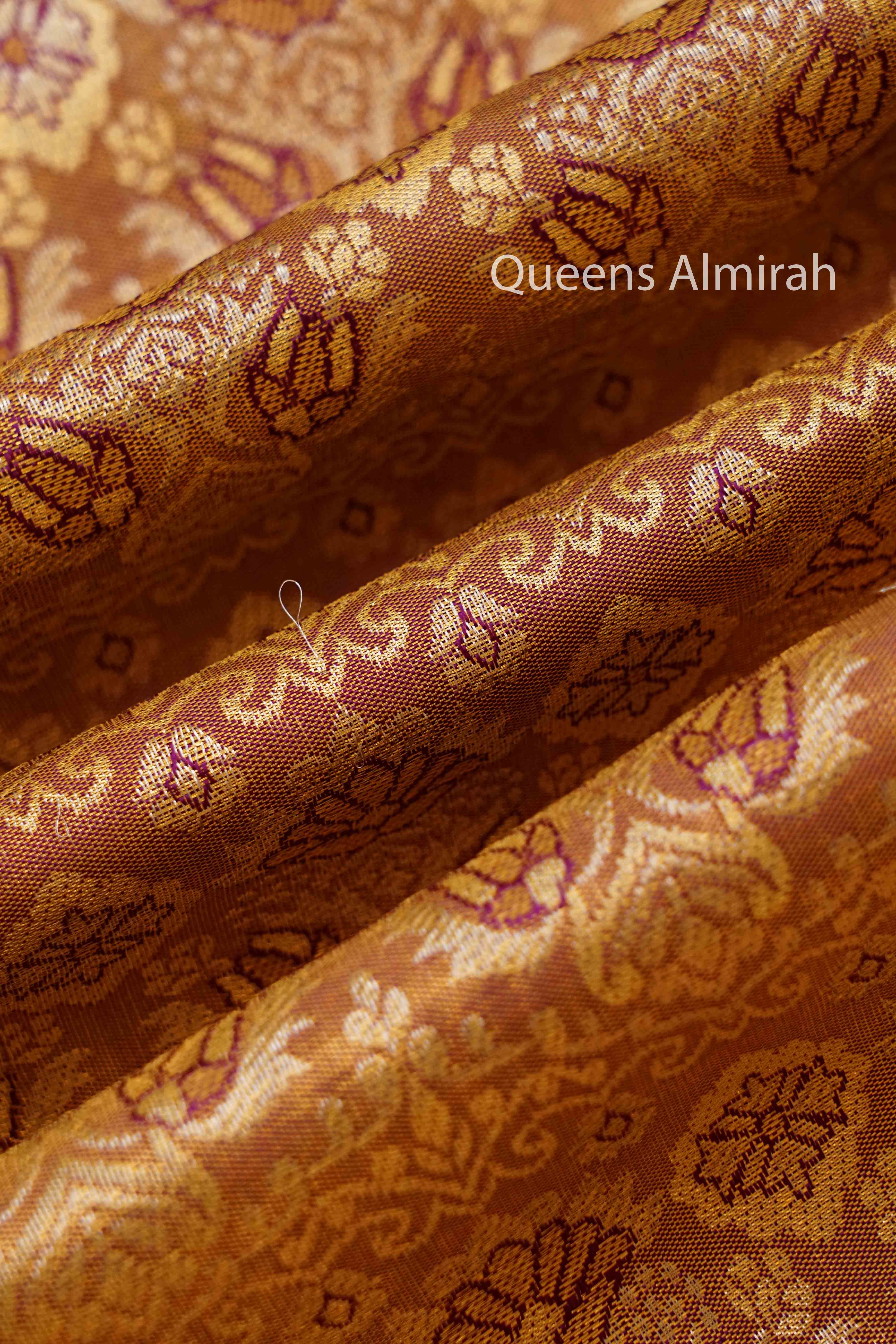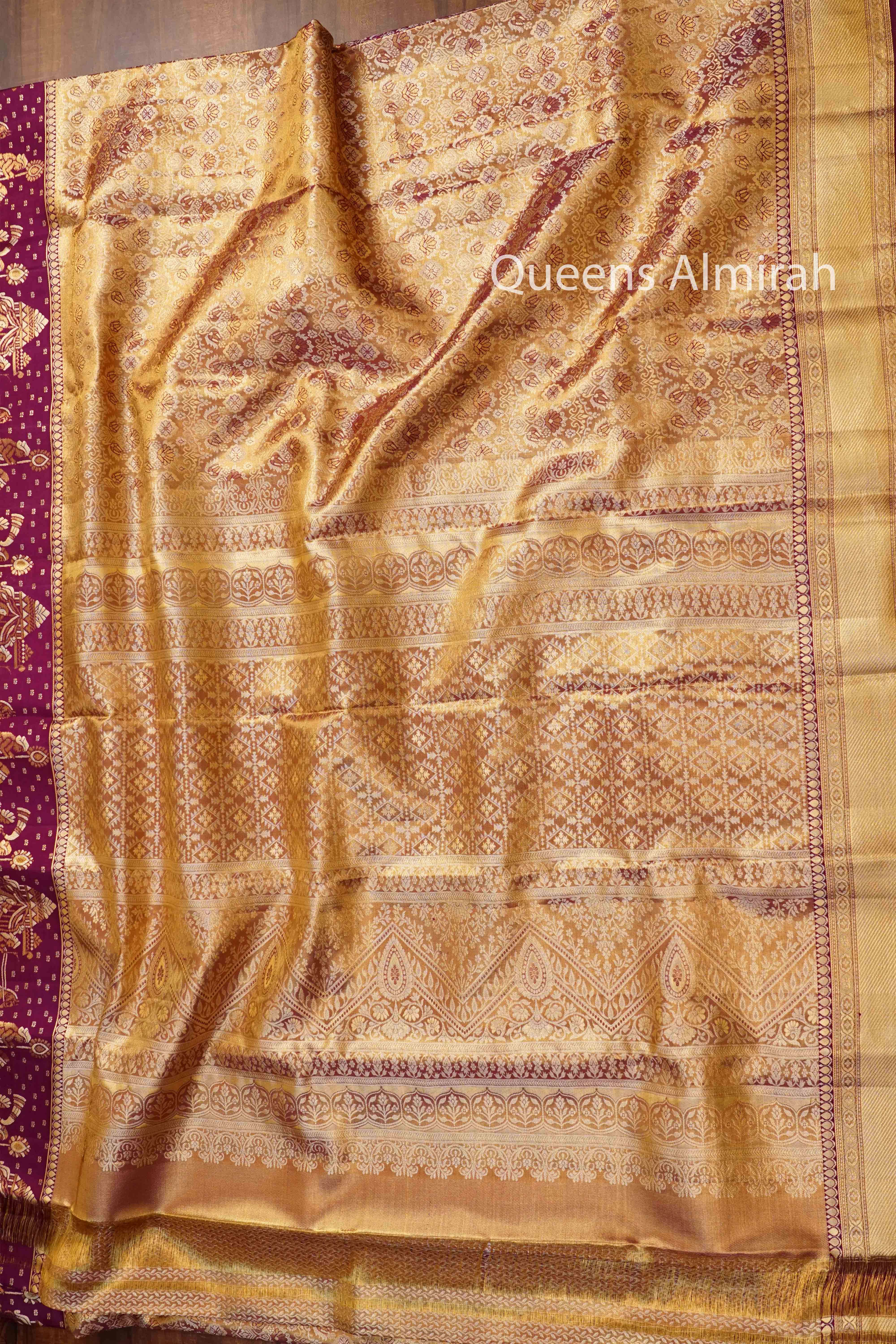 Elevate your look with our Gold With Wine Berry Pure Kanchivaram Silk Saree. The traditional border and brocade work add an elegant touch to the rich pure silk fabric. Perfect for weddings, the luxurious pallu adds a touch of opulence to any special occasion.
