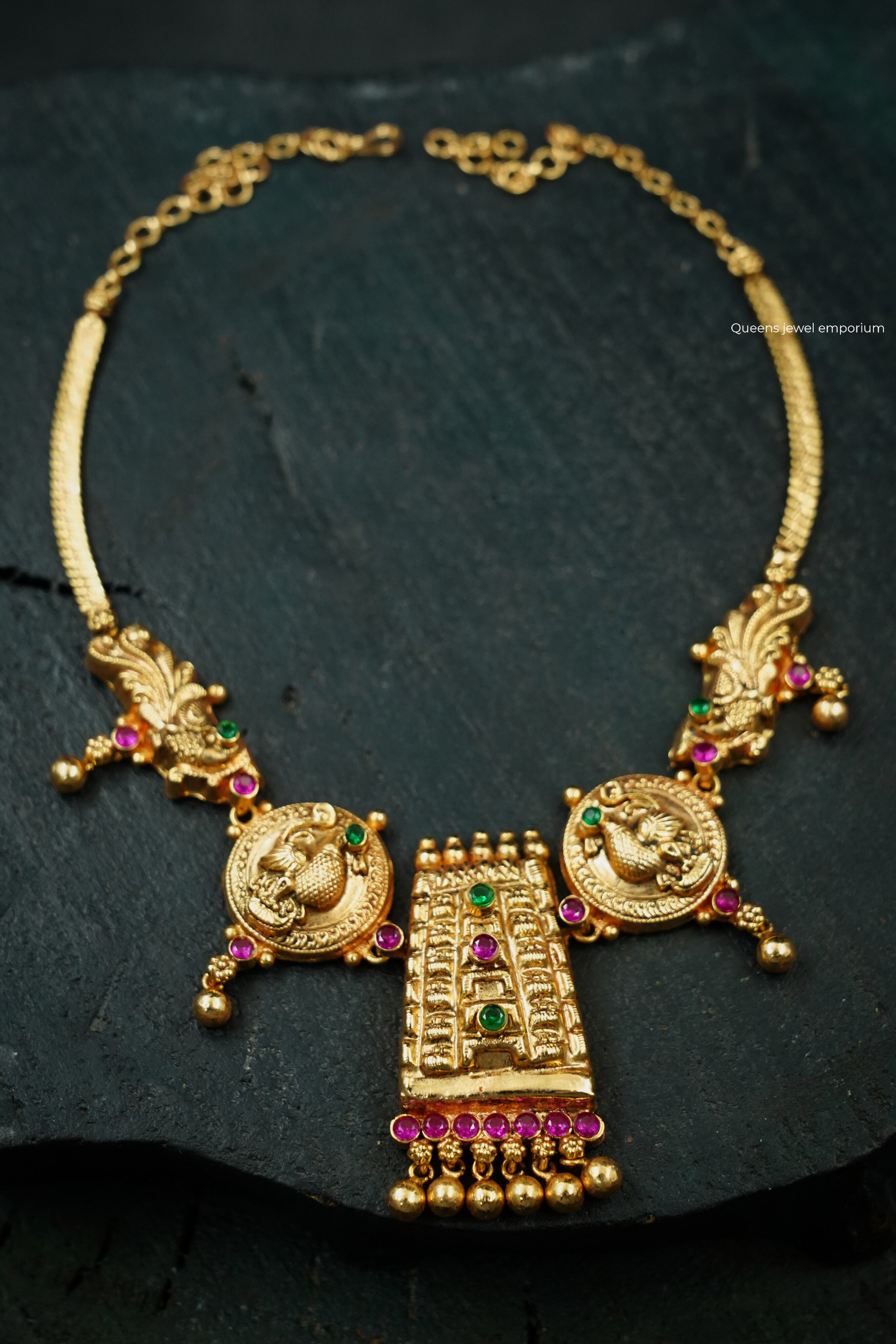 A statement temple necklace showcasing Gopuram Nagas craftsmanship, flanked by peacocks and enhanced with a flat patta chain.