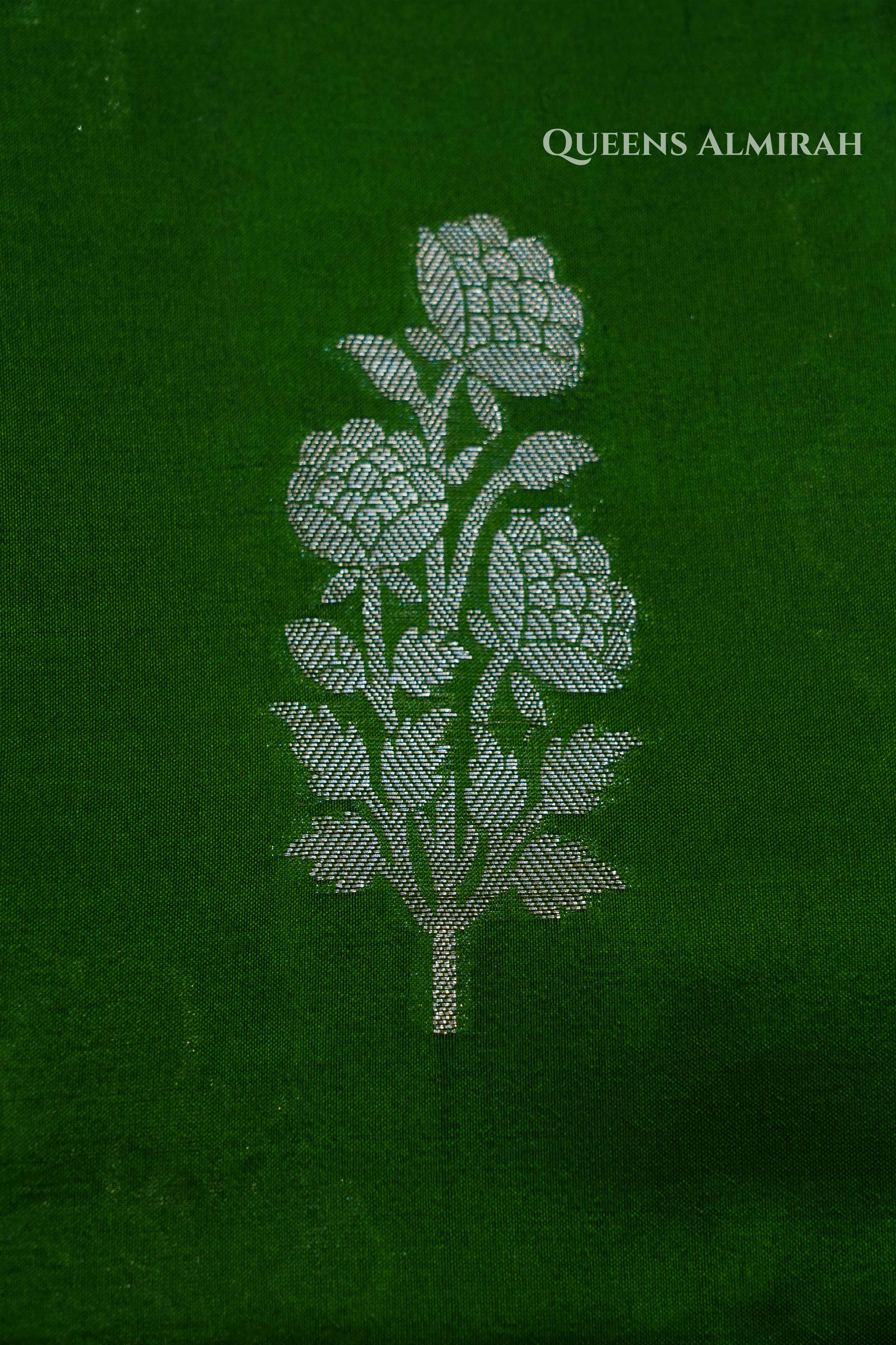 Elevate your ethnic wardrobe with this regal Green Raw RawMango Silk Saree, adorned with elegant silver zari floral buttas and a grand woven border. The luxurious mango silk drapes beautifully, making it a perfect pick for weddings, receptions, or festive occasions. A timeless blend of tradition and sophistication, this saree brings grace to every step.