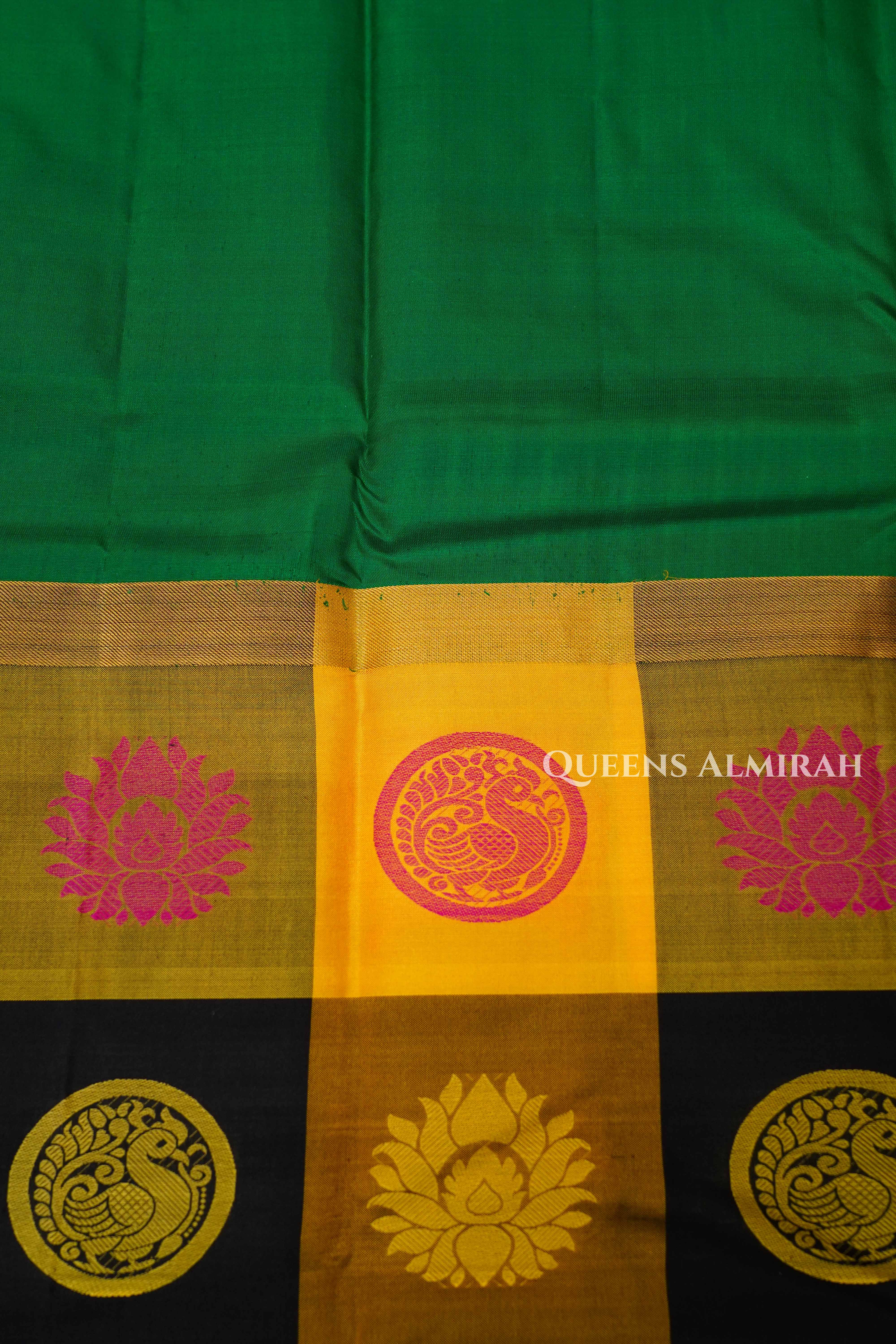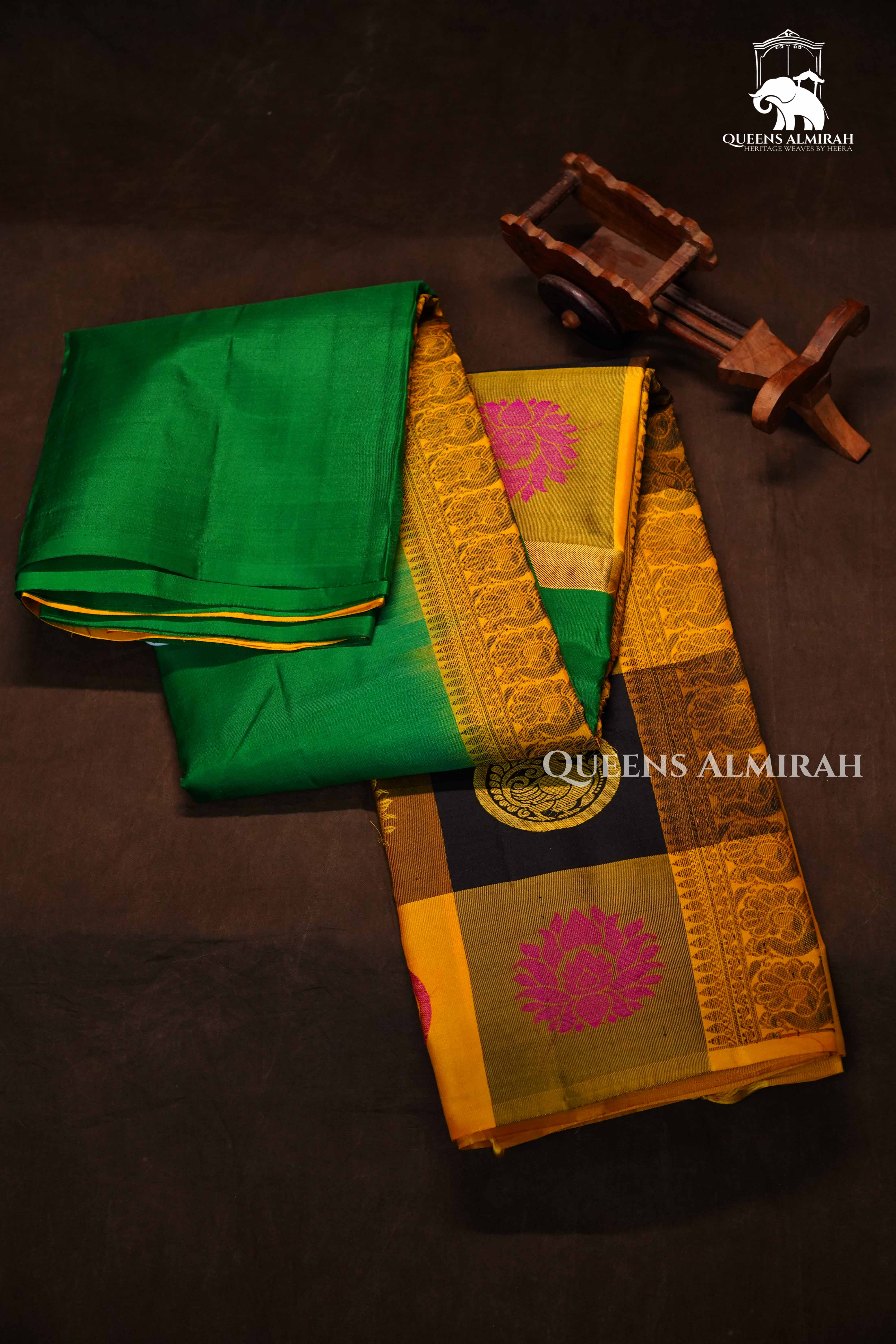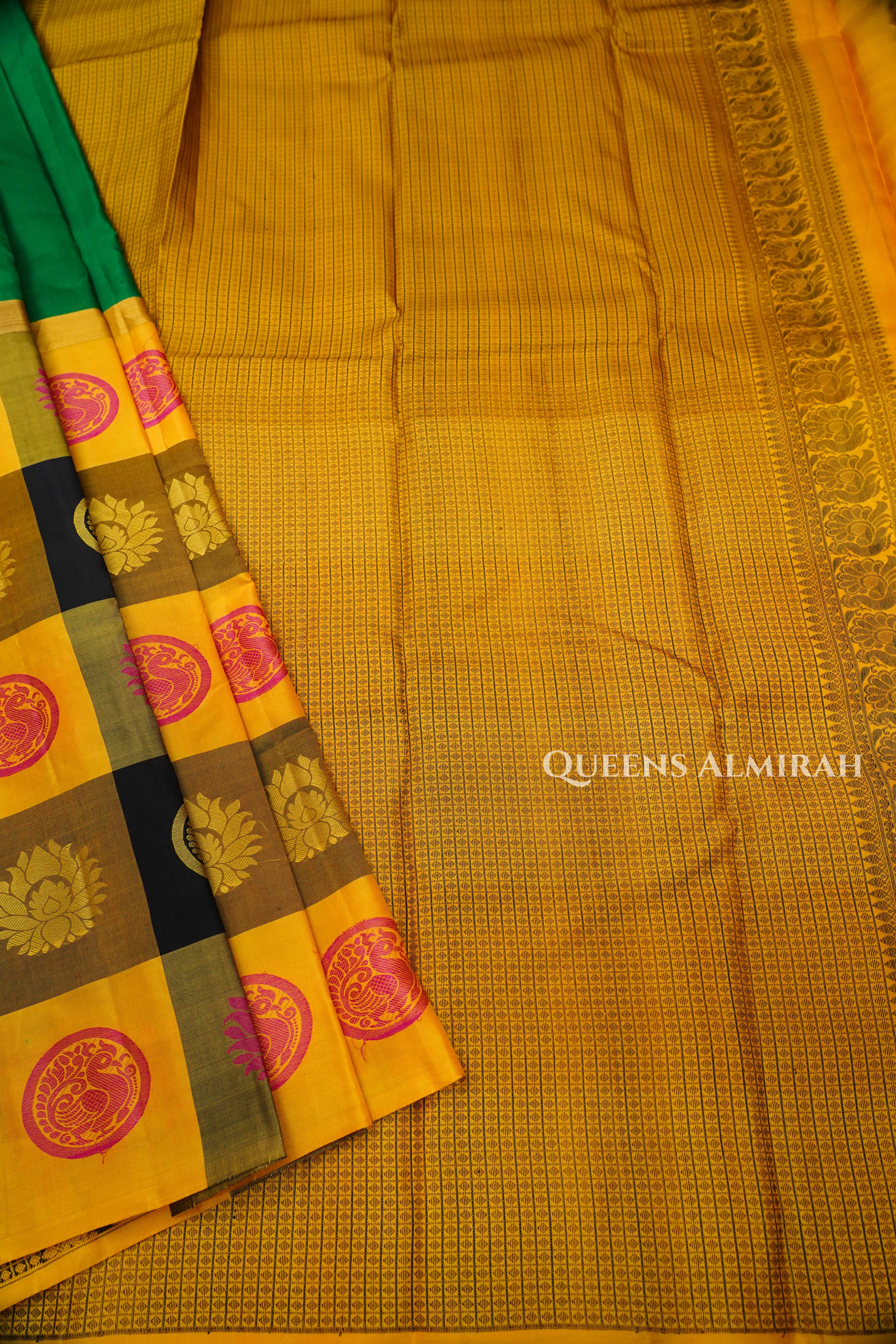 "Elegant Kuravanji silk saree in off-and-on checks of Green and mustard, highlighted with vibrant floral and paisley motifs, paired with a striking green body — perfect for weddings, festive occasions, and cultural celebrations."