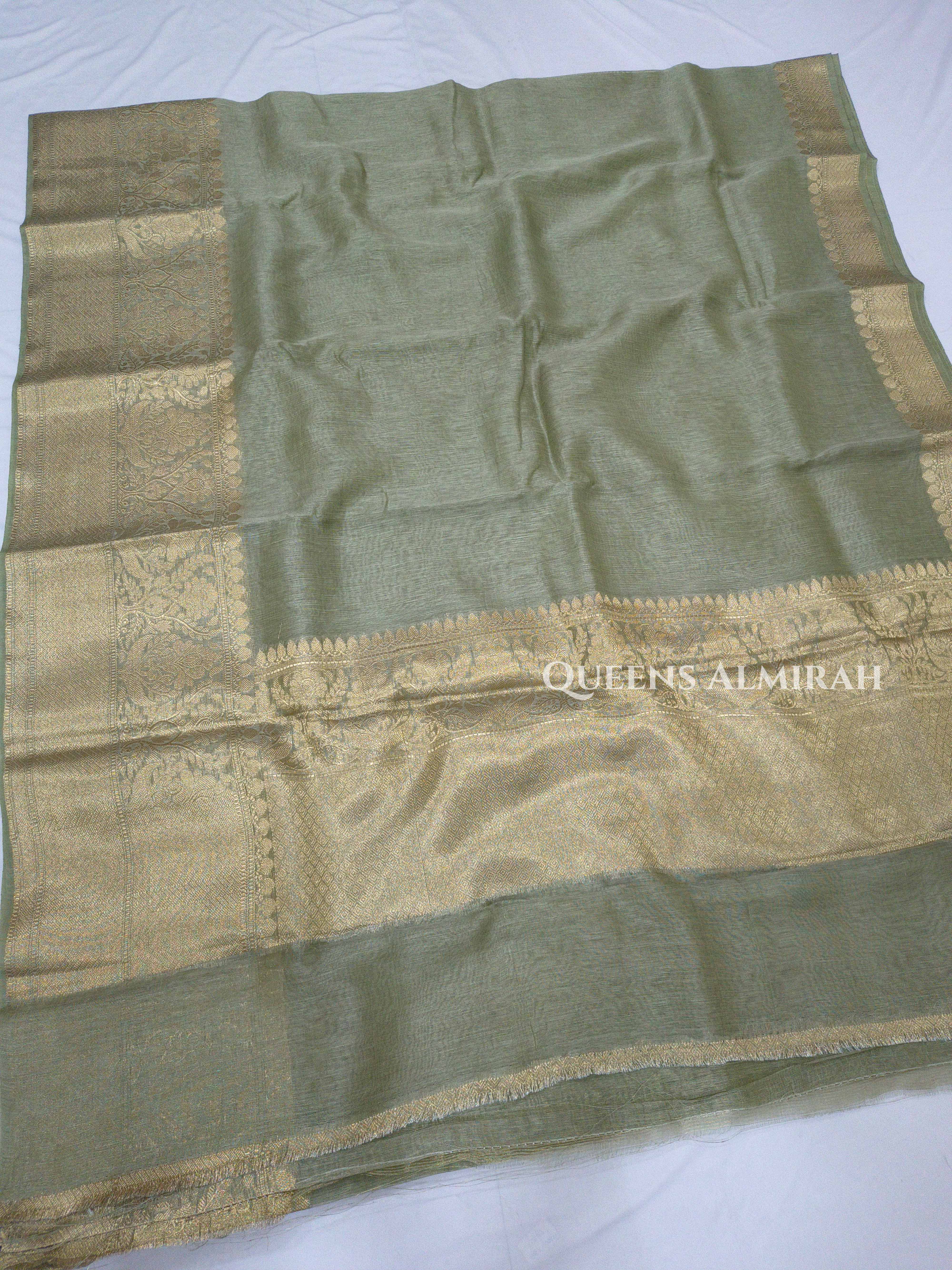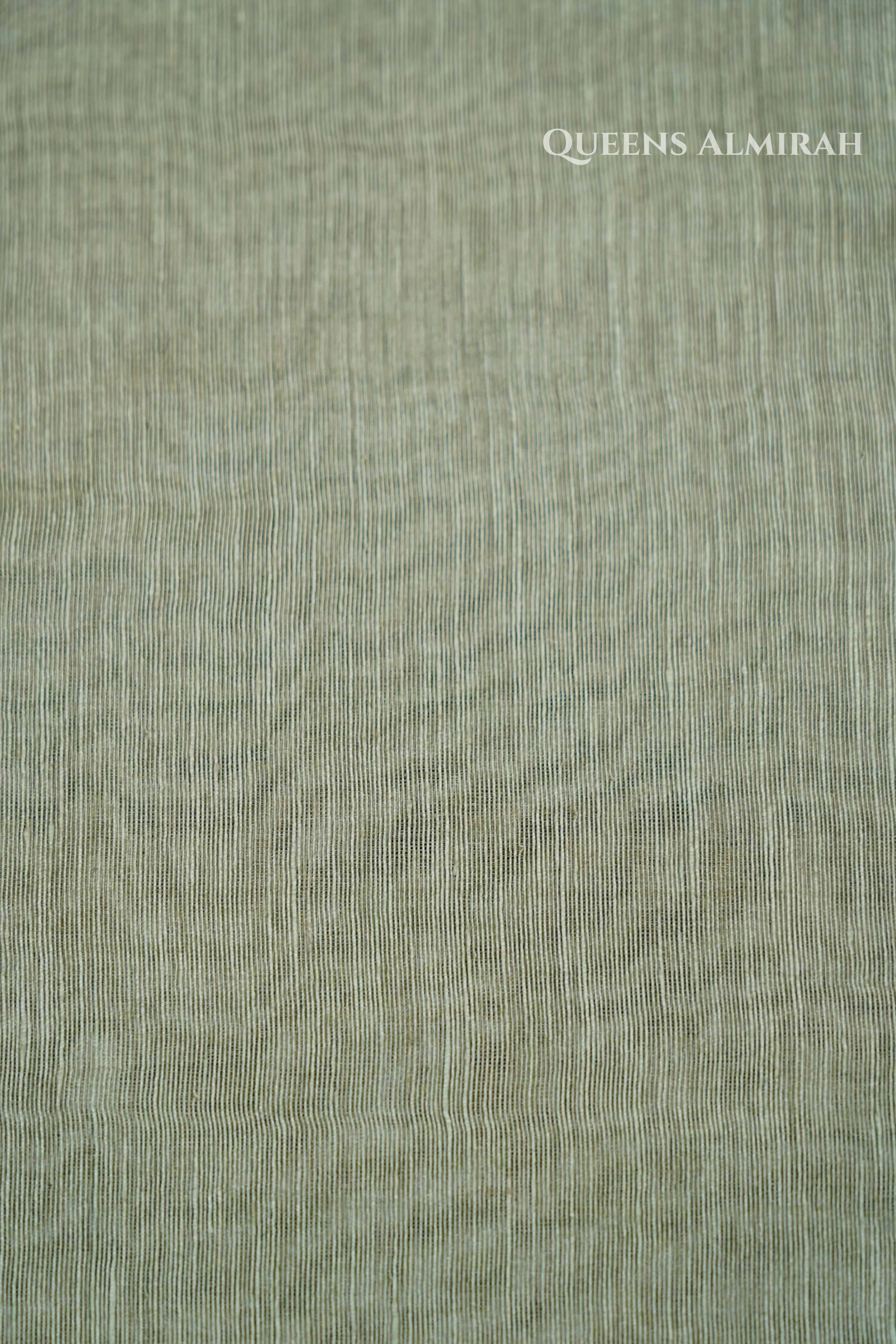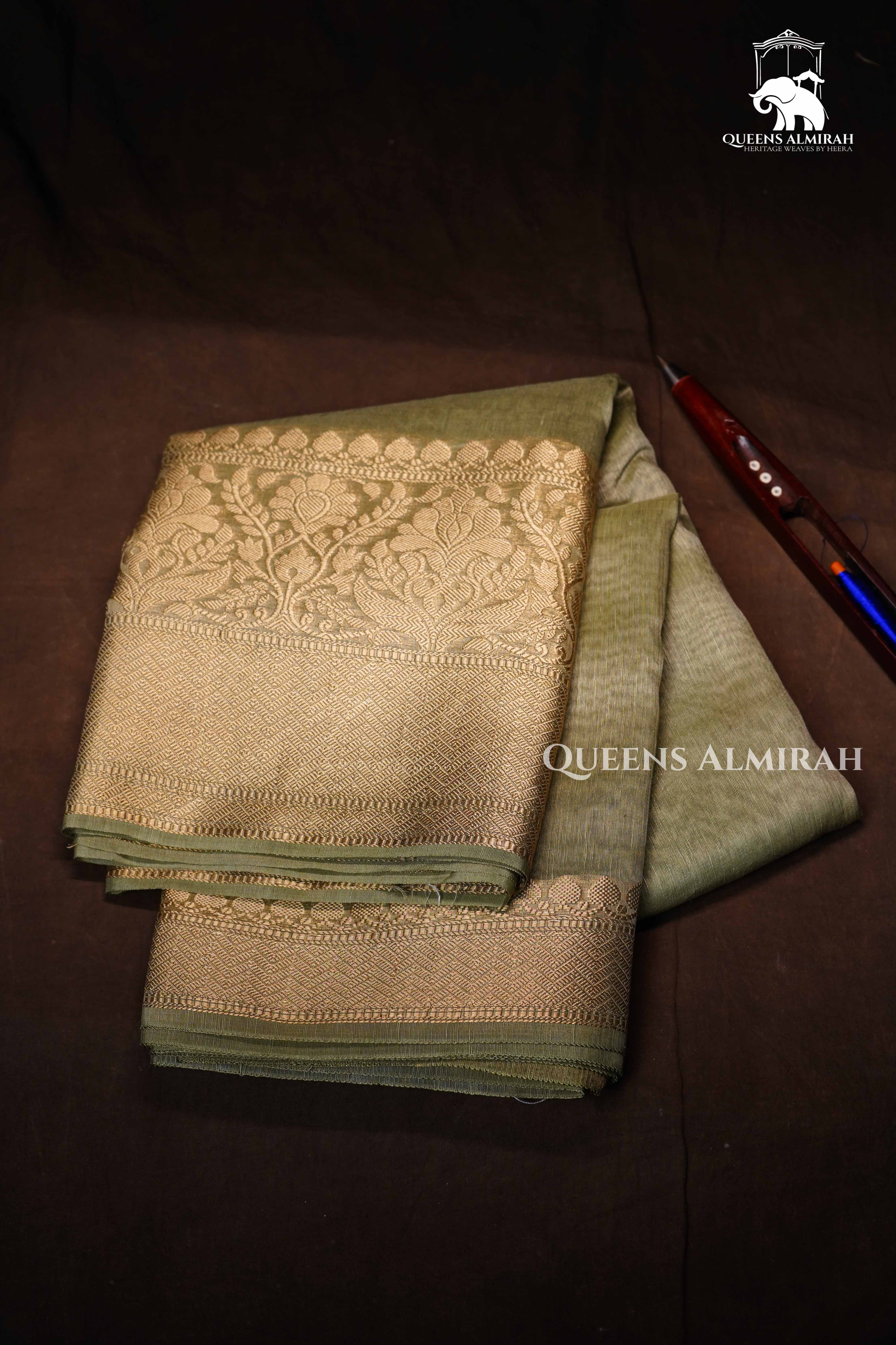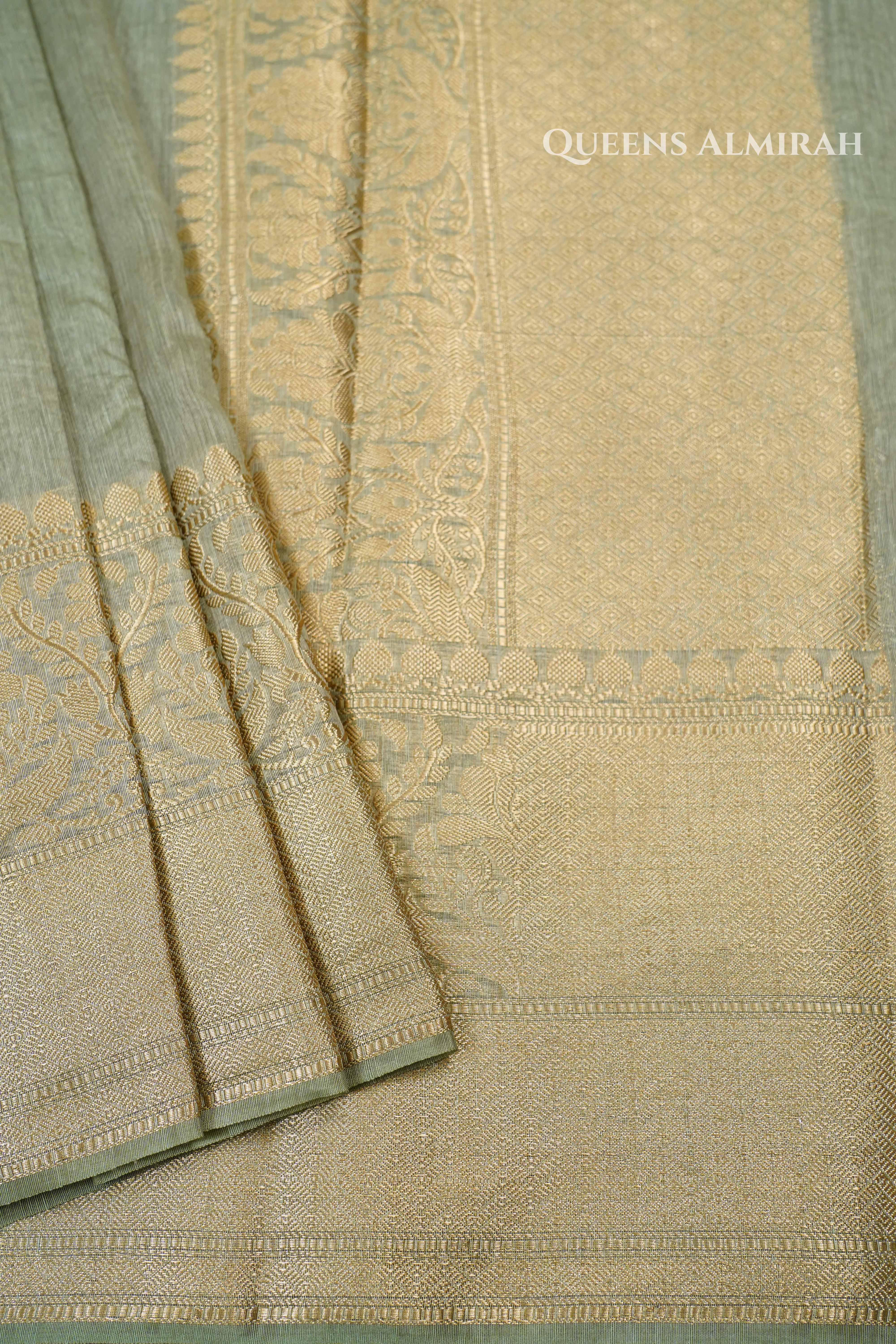 Understated yet effortlessly regal — this Grey Olive Banarasi Linen Saree is adorned with delicate antique zari motifs and a finely woven pallu. The earthy grey-olive hue adds a touch of sophistication, making it perfect for both formal gatherings and festive celebrations. Lightweight, breathable, and timelessly elegant.