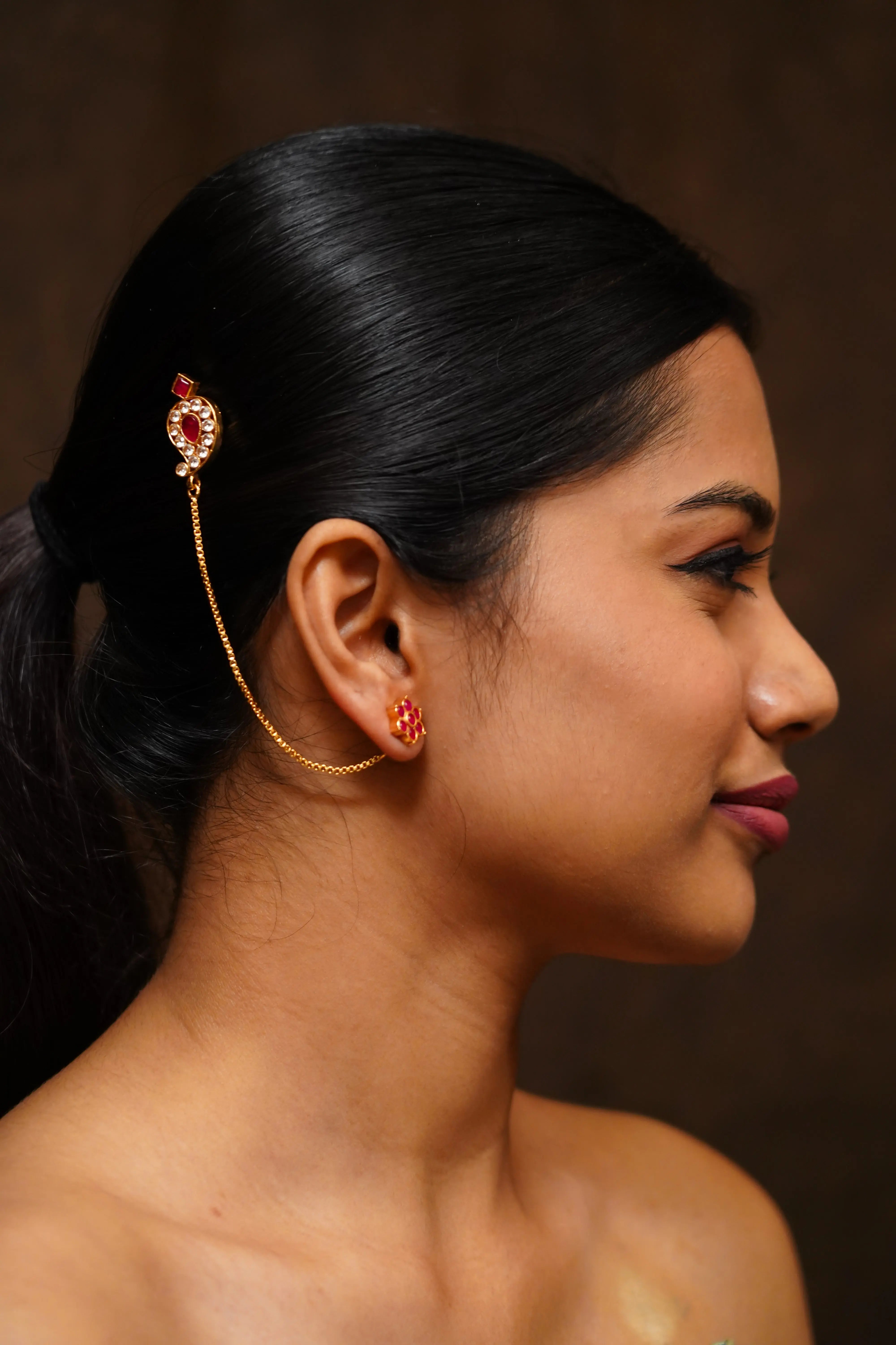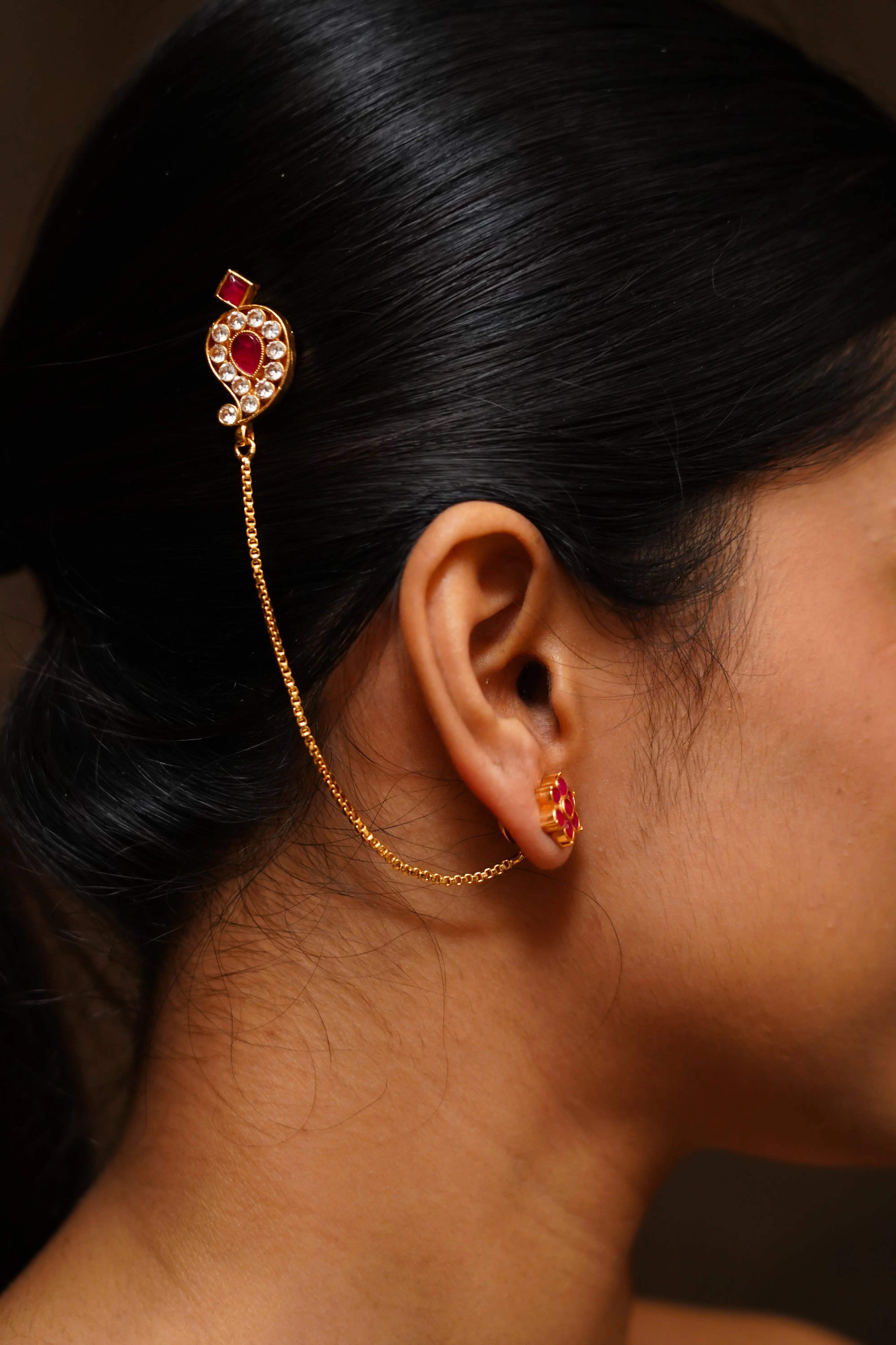 Expertly made with 24CT gold-plated silver alloy using a thick gold sheet forming method, this ear chain features a beautiful mango motif design. A perfect blend of style and functionality, this piece is a must-have for contemporary women who appreciate traditional elements with a modern flair. Elevate your look and radiate with confidence wherever you go.