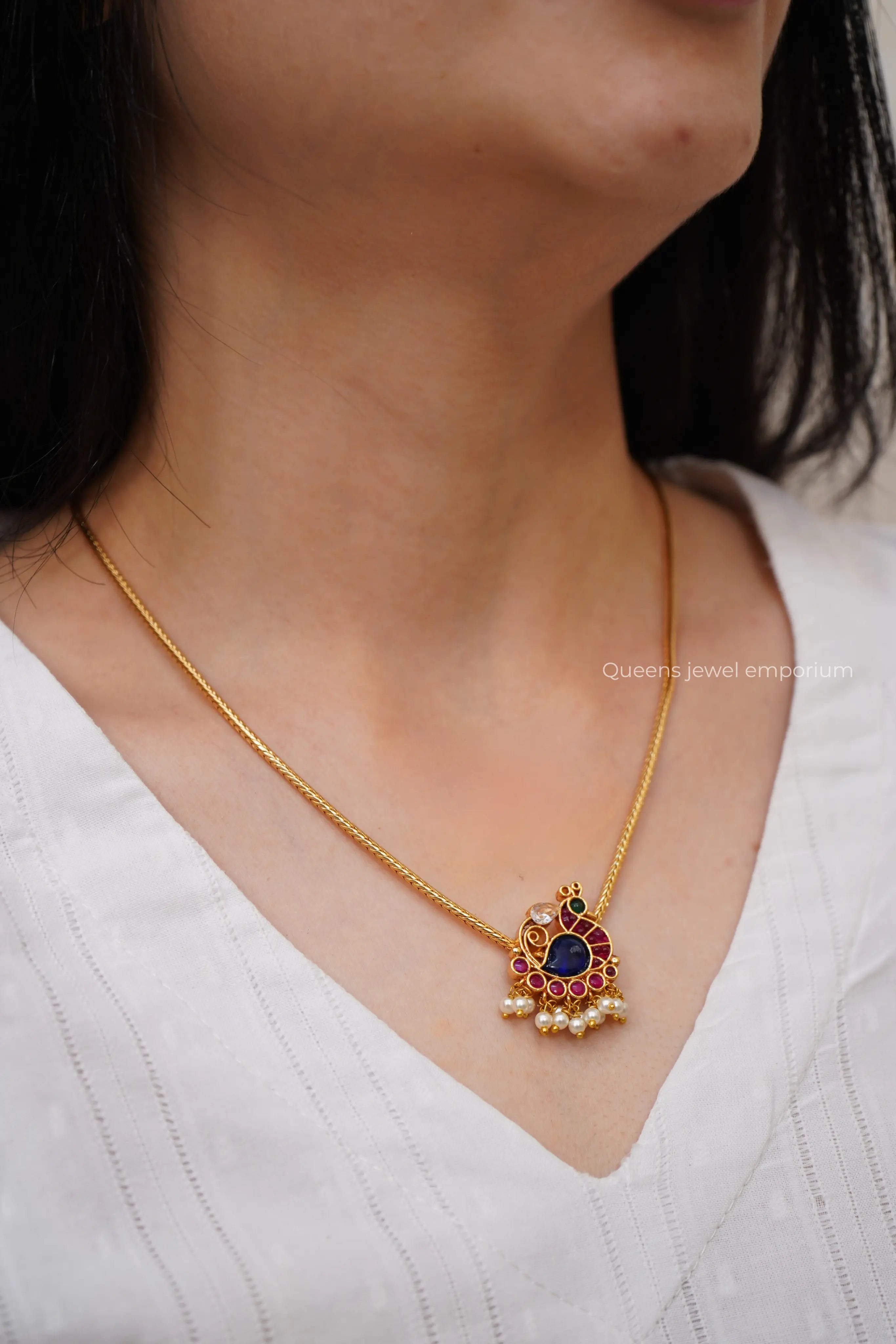 Enhance your traditional South Indian look with our HANSA necklace, handcrafted in gold plated and silver alloy. Featuring a beautiful ANNAM motif and blue kemp stones, its simple yet stunning design adds a touch of elegance to any outfit. Elevate your style with this exquisite, handmade piece.