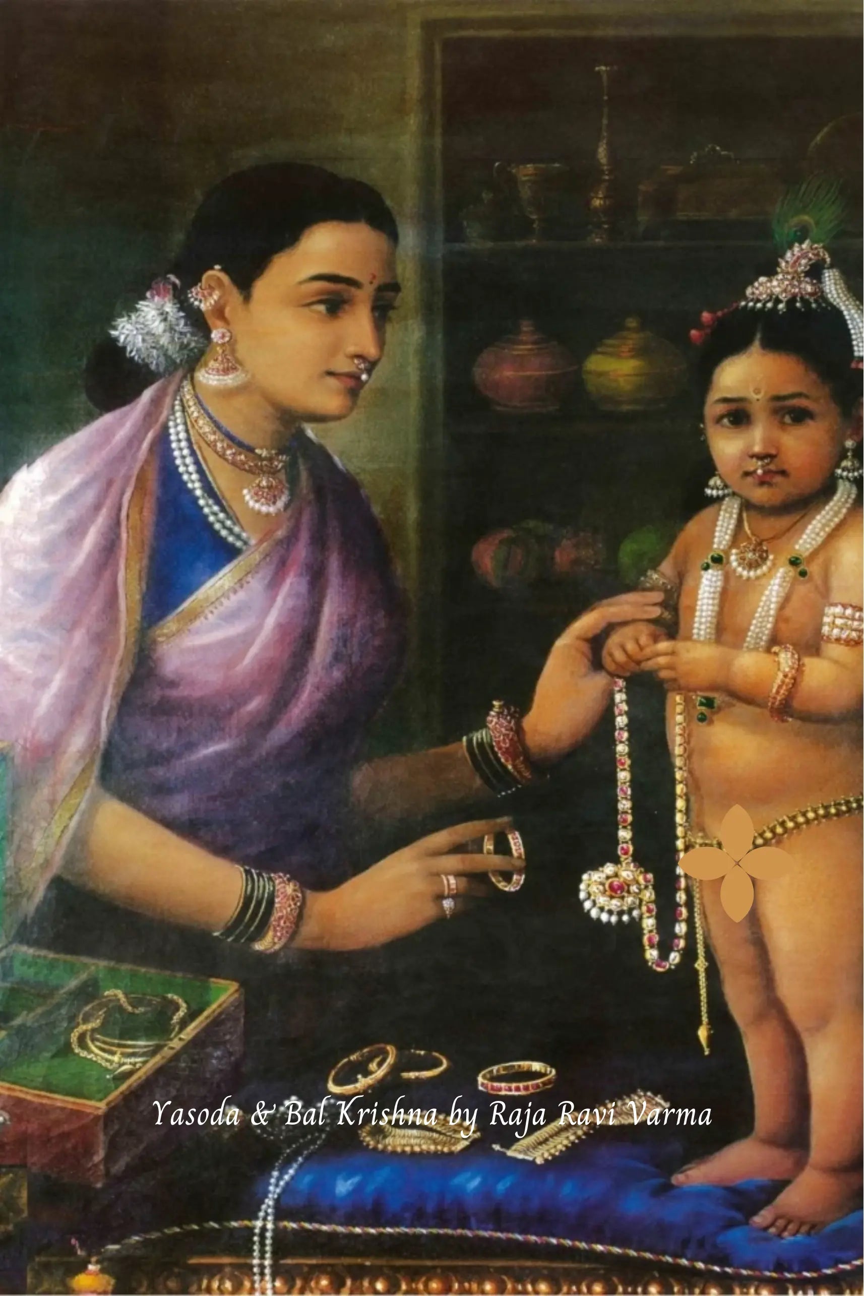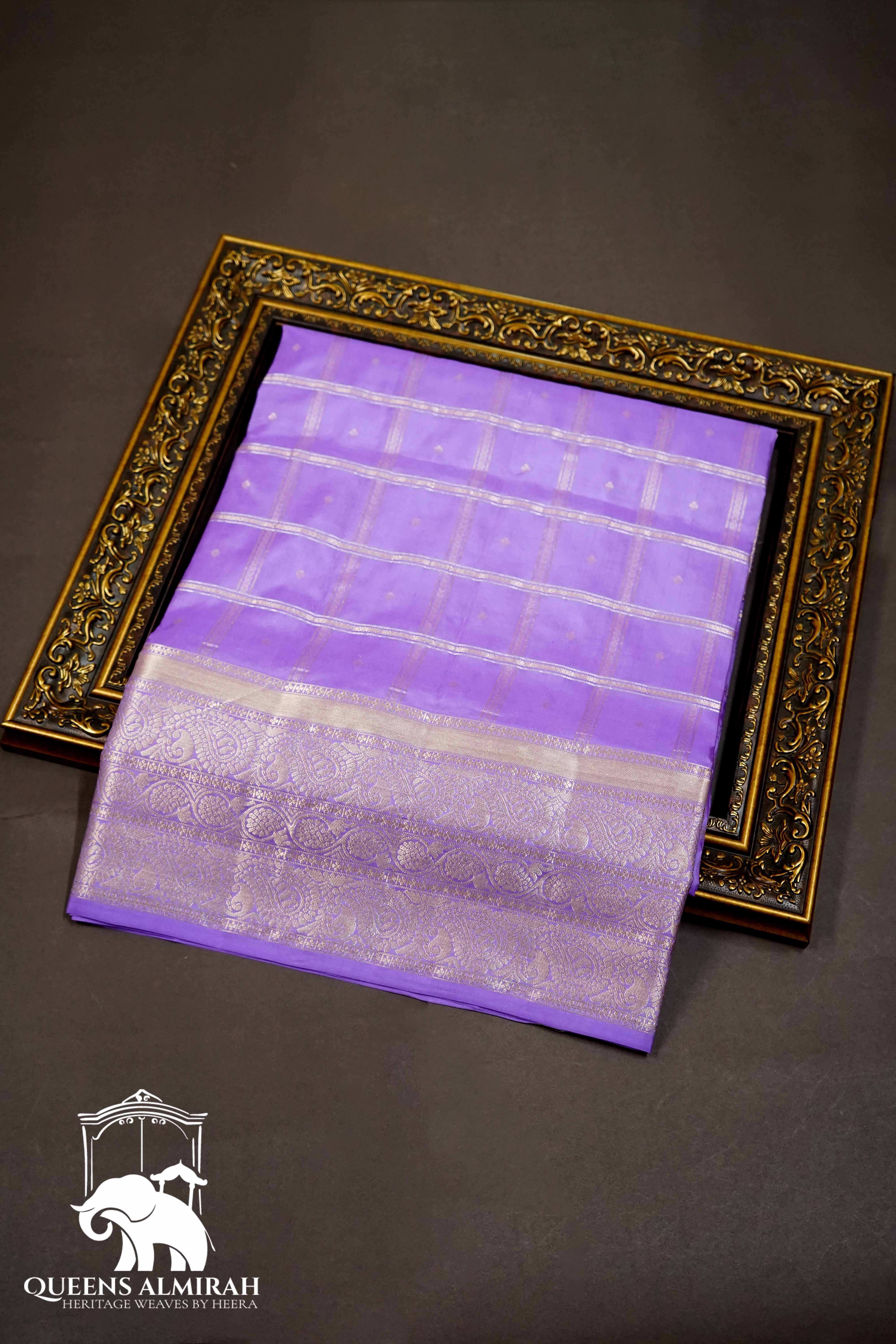 Inspired by Raja Ravi Varma's "Yasoda & Bal Krishna", this heather purple saree is crafted from the finest quality silk. Featuring a beautifully woven border and a striking big checked pattern, it adds elegance and visual appeal to your wardrobe, making it a must-have piece for any occasion.