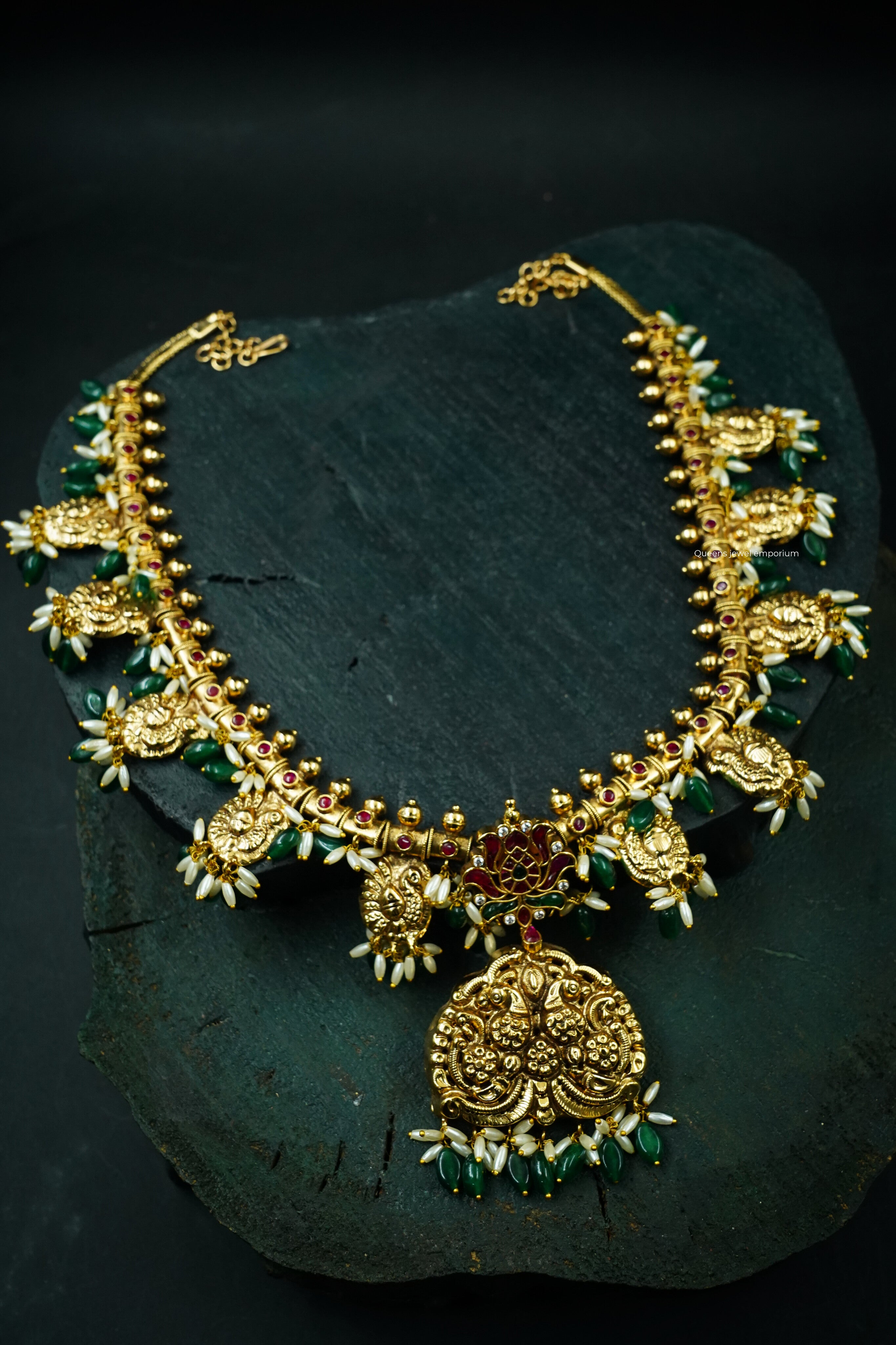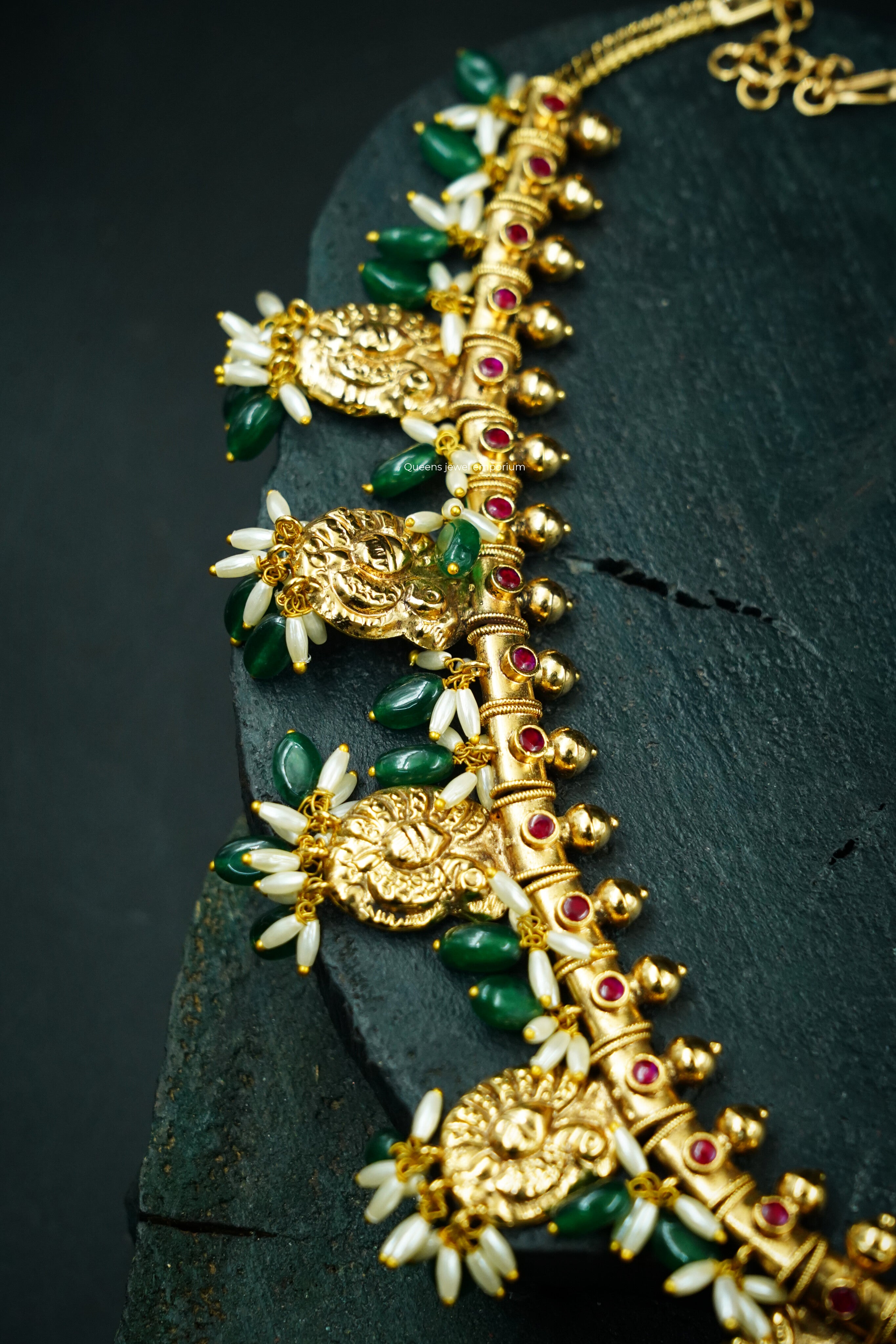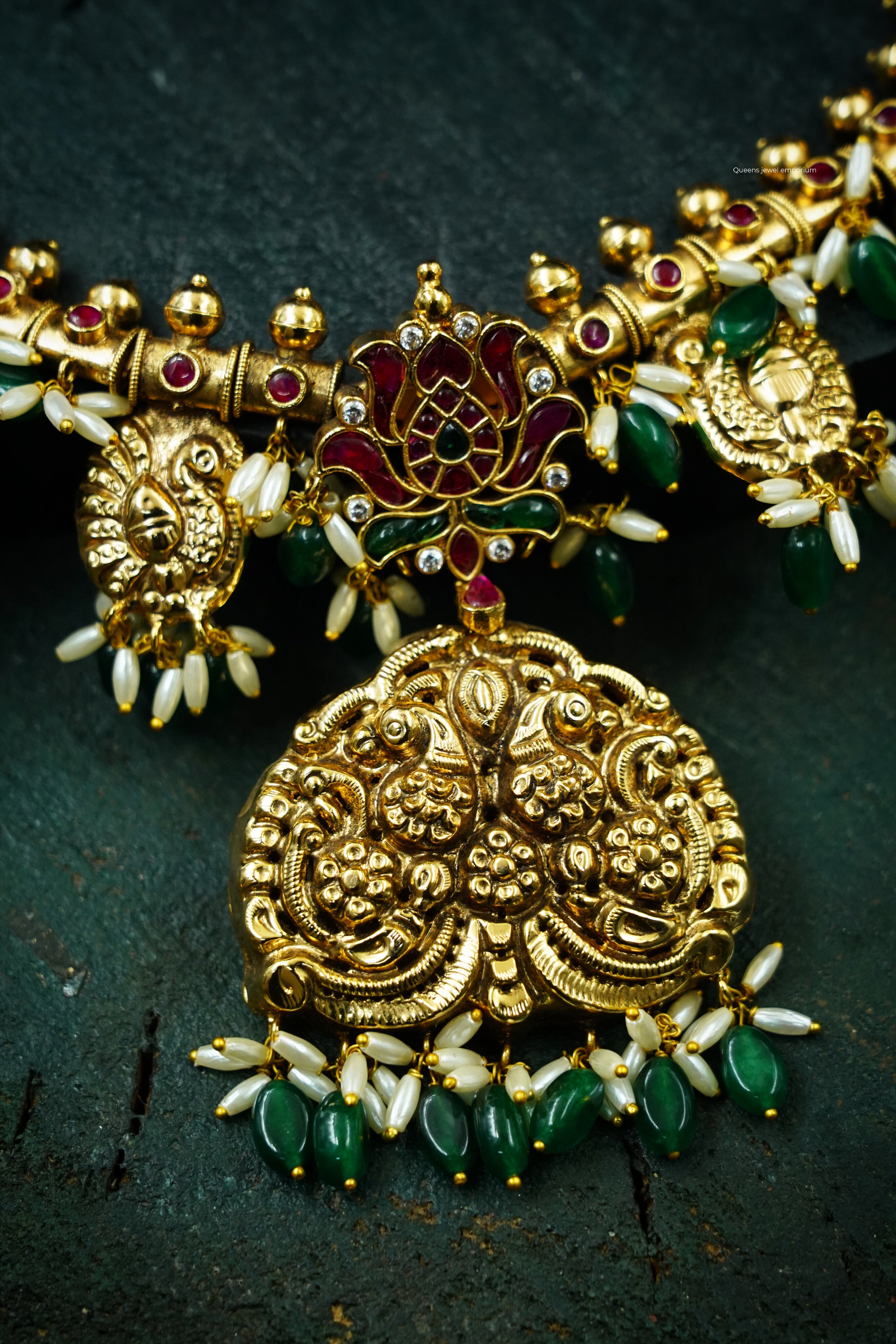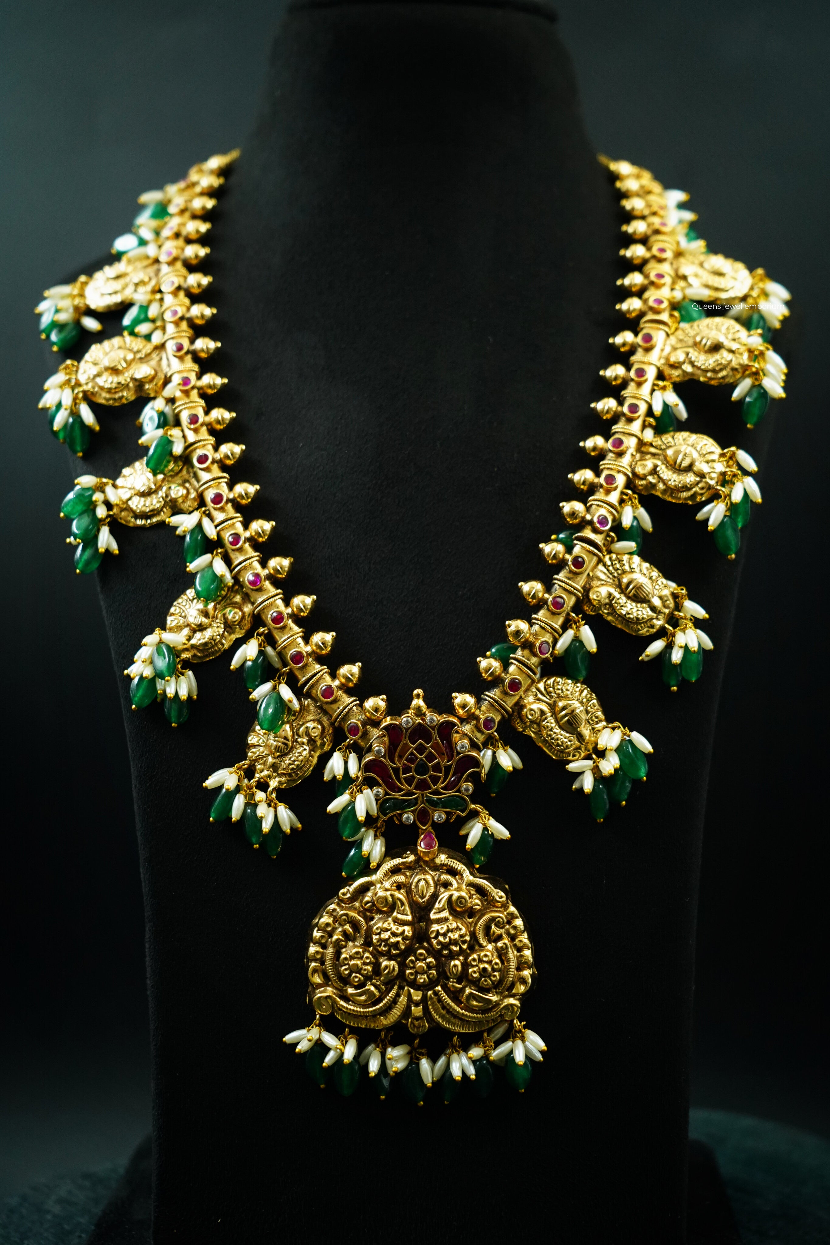 Nagas haram with peacock nagas and lotus motifs, embellished with red and green kemp stones, finished in gutta pusalu style with rice pearl and green beads hangings. Crafted in 24CT gold-plated silver alloy using multiple thick gold sheet forming technique, this grand design is handcrafted by our expert artisans at Queens Jewel Emporium for timeless tradition.