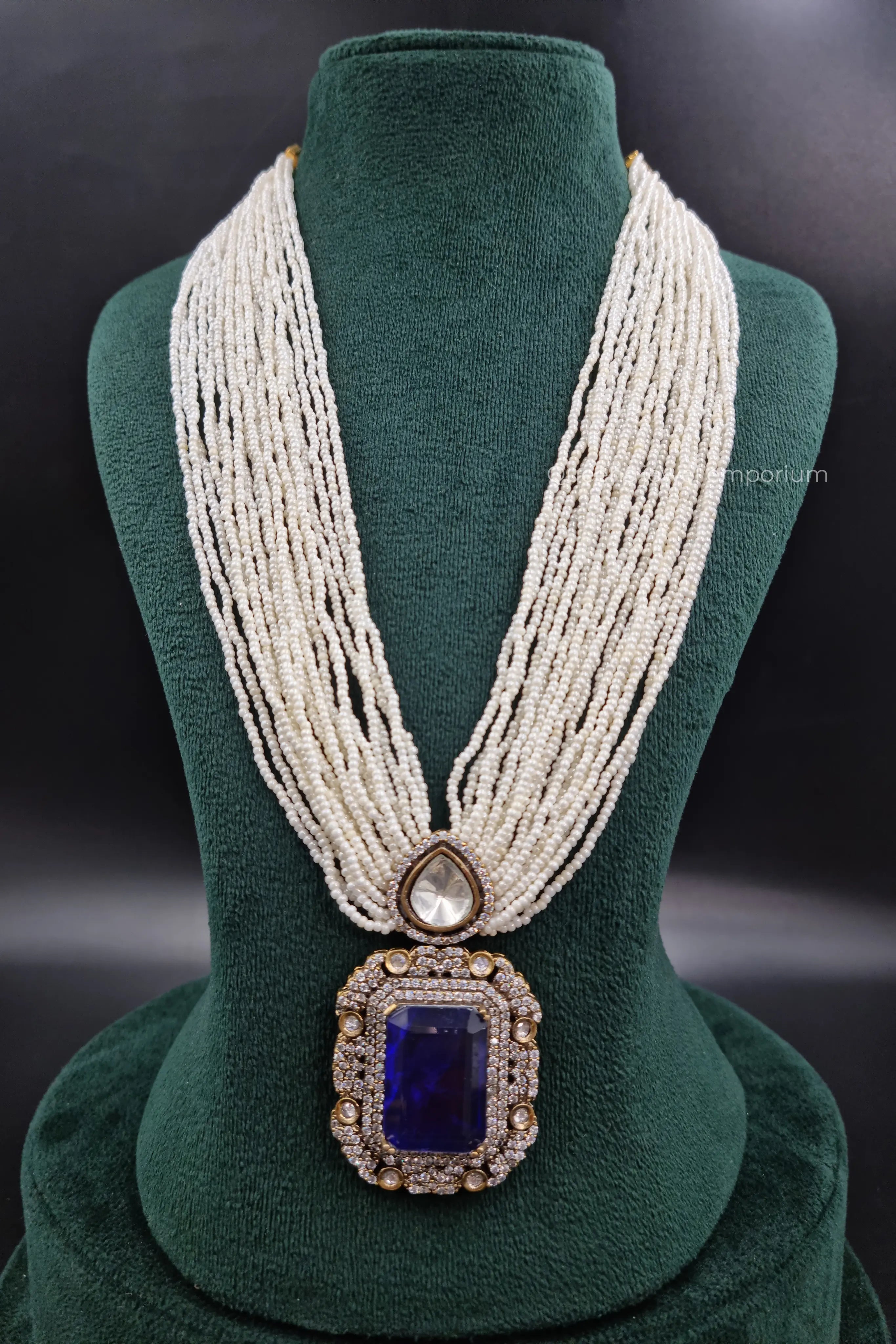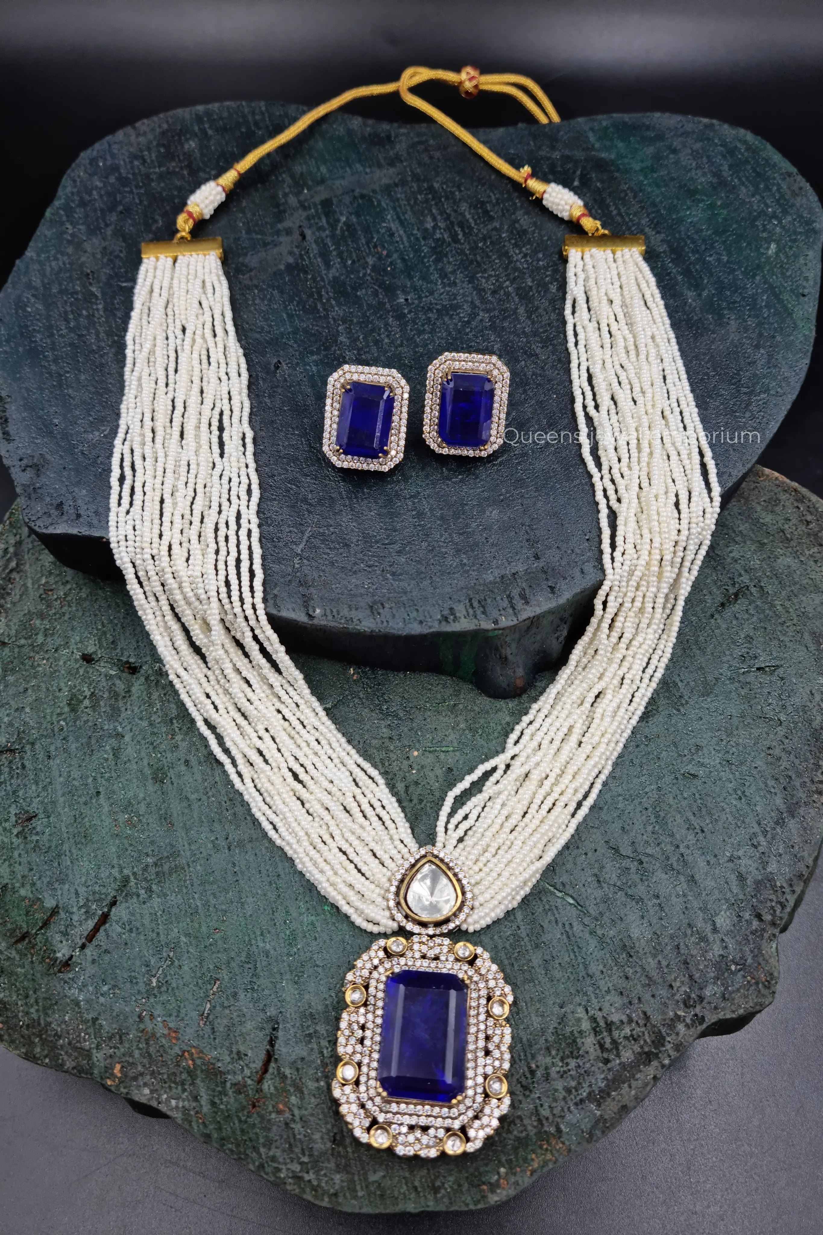 Enhance your jewelry collection with the stunning IKSHITHA HARAM . It features a bunch of pearl beads, bold blue stones, and zircon stones, complete with a matching pair of earrings. Made with premium quality materials, this set is perfect for any formal occasion.