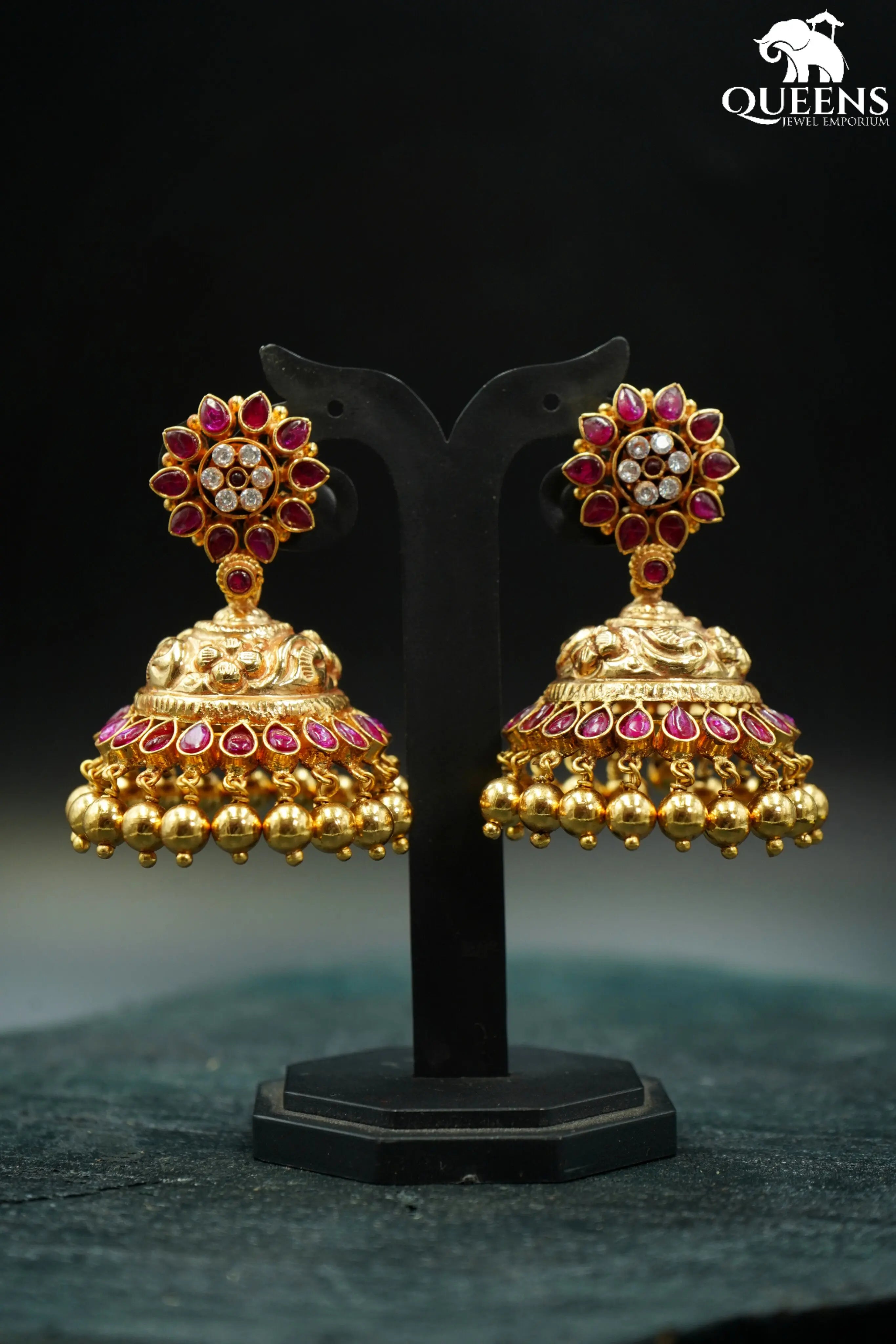 Add a touch of traditional South Indian elegance to your look with the Indumathi Jhumka earrings. Featuring handcrafted Kemp stones, gold ball accents, and a screw back for a secure fit, these gold-plated earrings are perfect for all your wedding functions. Enjoy the luxurious look of gold.