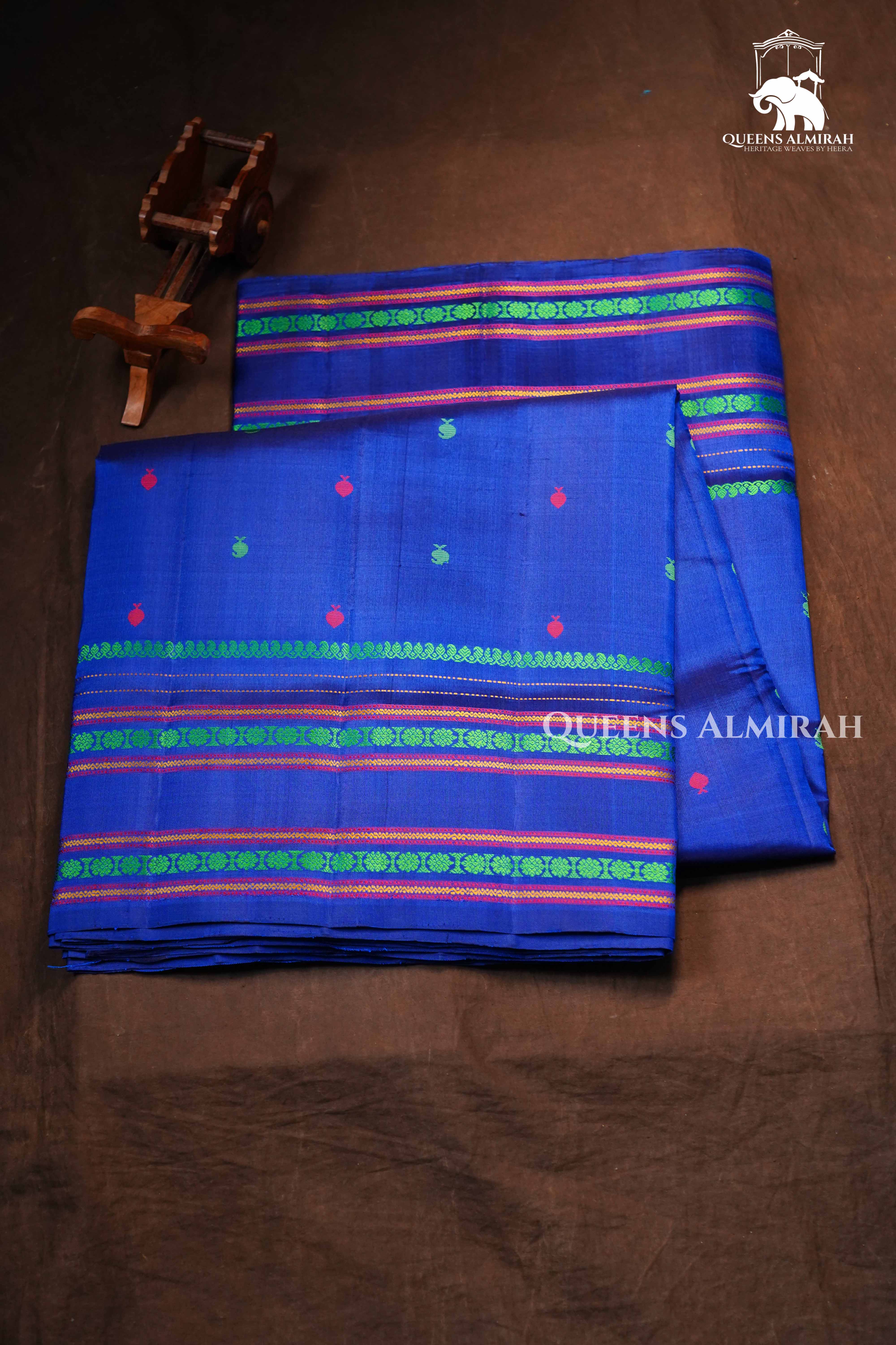 This Ink Blue with Green Kanchivaram soft silk Saree is a stunning expression of traditional craftsmanship. The rich purple body is adorned with charming multi-colored buttas, while the contrasting green pallu features intricate diamond patterns and bold zari-inspired weaves. Accentuated with green and red striped borders, this saree beautifully balances vibrance and elegance. Lightweight and breathable, it is perfect for festive occasions, cultural gatherings, and everyday traditional wear.