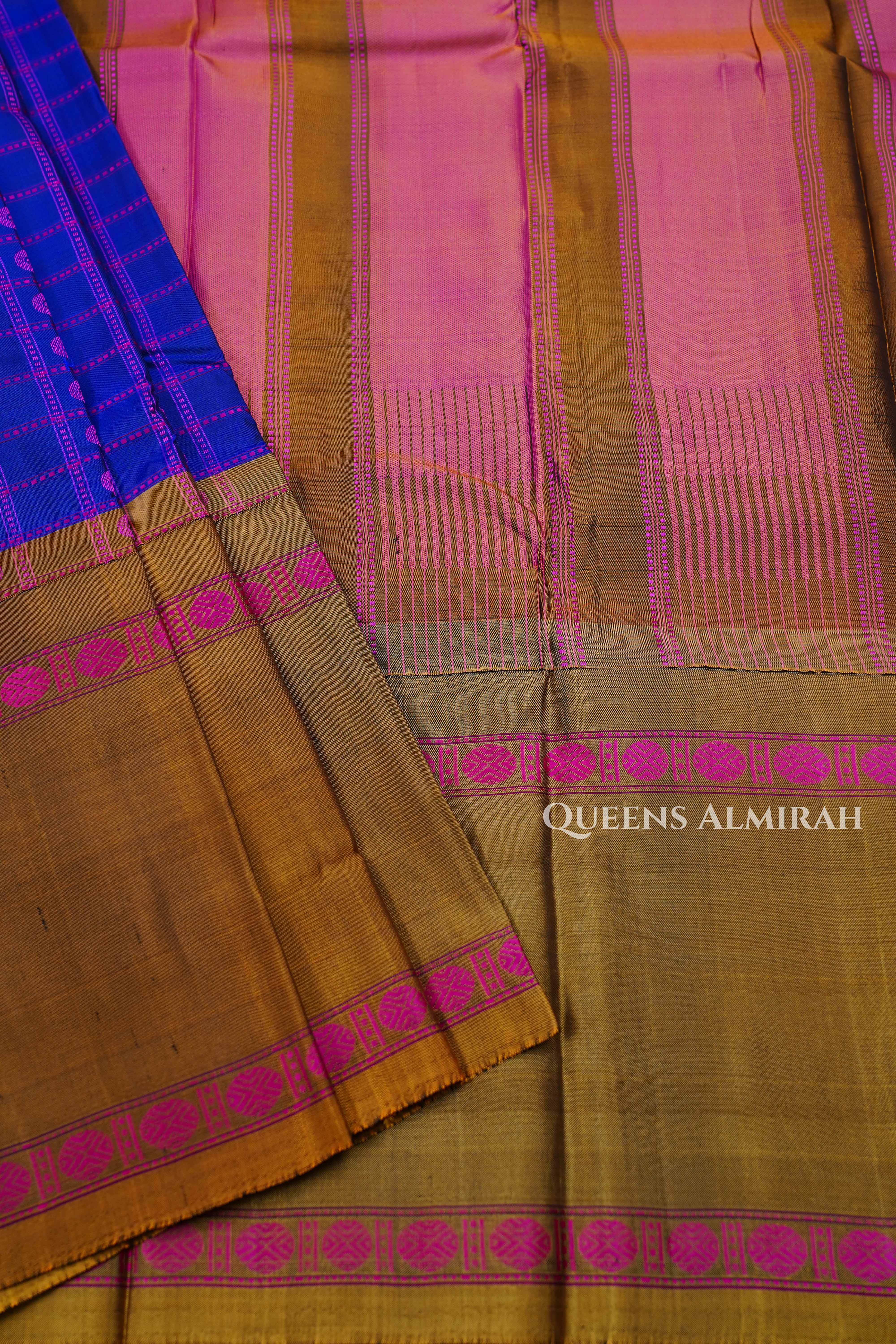 Elevate your ethnic wardrobe with our Ink Blue With Mehandhi Green Pure Kanchivaram Silk Saree, a true masterpiece of South Indian handloom craftsmanship. Woven from 100% pure silk, this saree features traditional thread work, intricate thousand butta and checks pattern, and rich Rudraksha silk thread detailing.Perfect for weddings, festivals, and special occasions, this Kanchipuram silk saree combines classic style with luxurious texture.