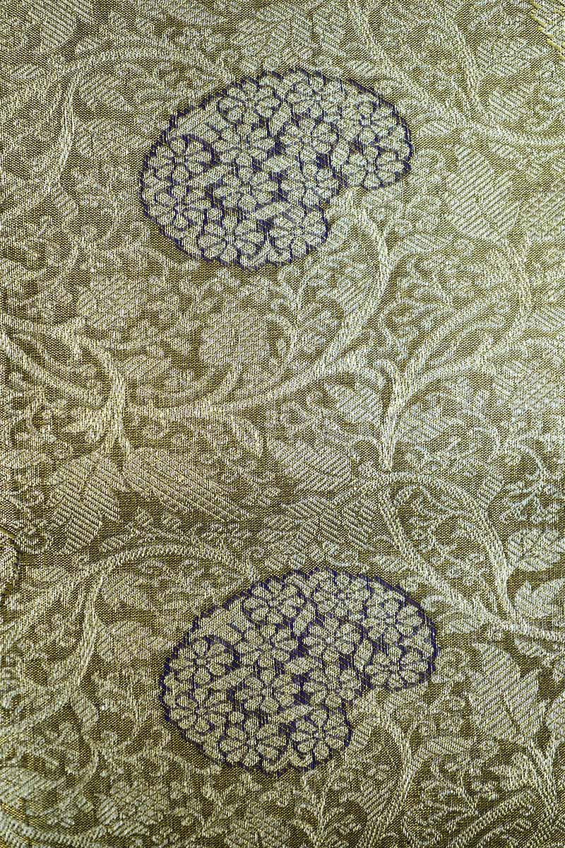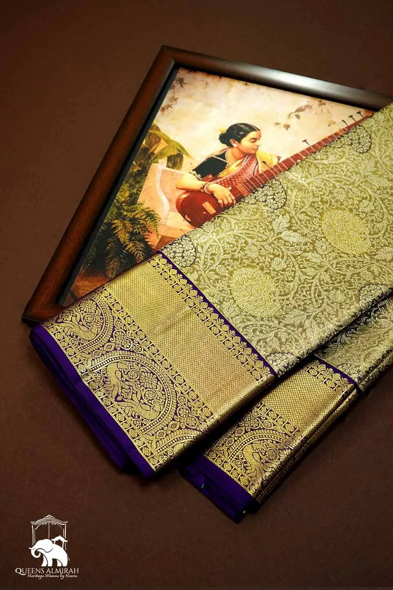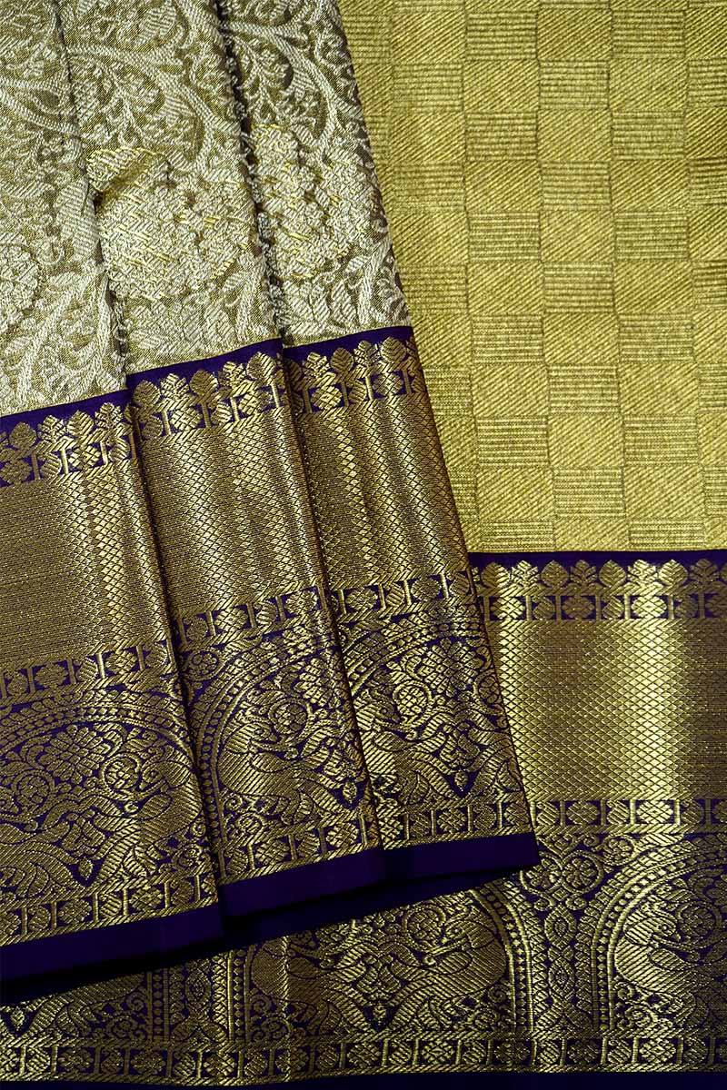 As a traditional border and brocade work adorn the ivory gold and violet silk saree, it creates an elegant and rich look. Perfect for wedding functions, the saree is made from pure silk and has a rich pallu, making it a must-have for any special occasion.