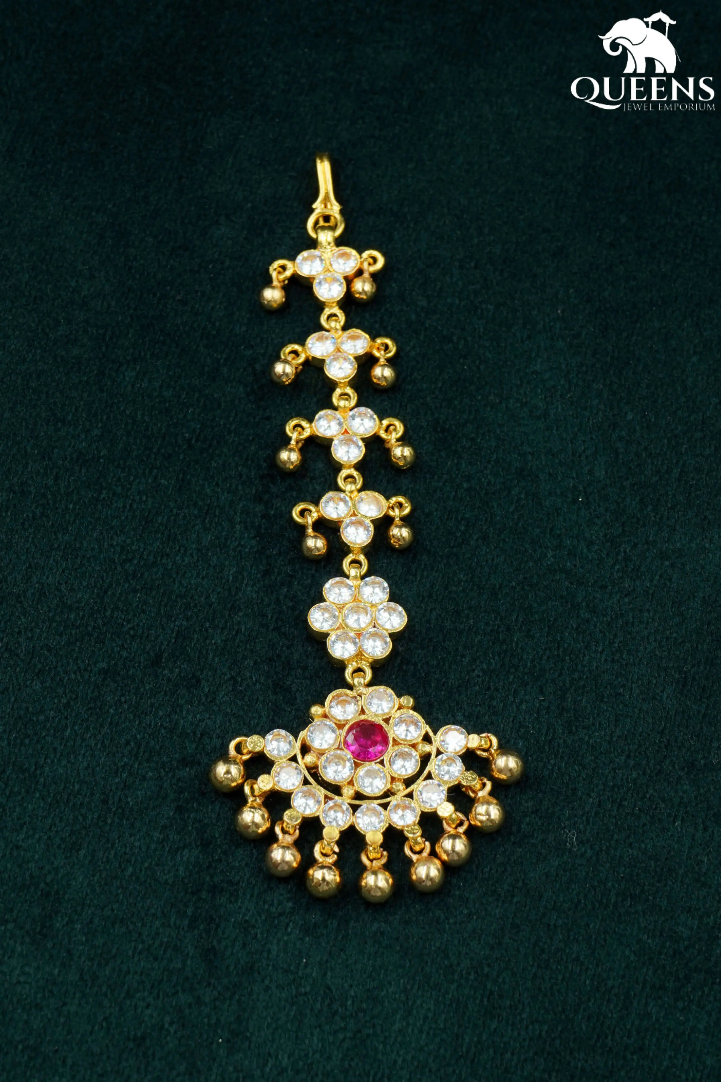 Elevate your cultural connection with this captivating zircon nethichutti, meticulously crafted in gleaming gold-plated silver alloy. Inspired by South Indian jewelry traditions, this tikka features a mesmerizing central pink stone surrounded by sparkling zircons, culminating in a delicate gold ball hanging below.
