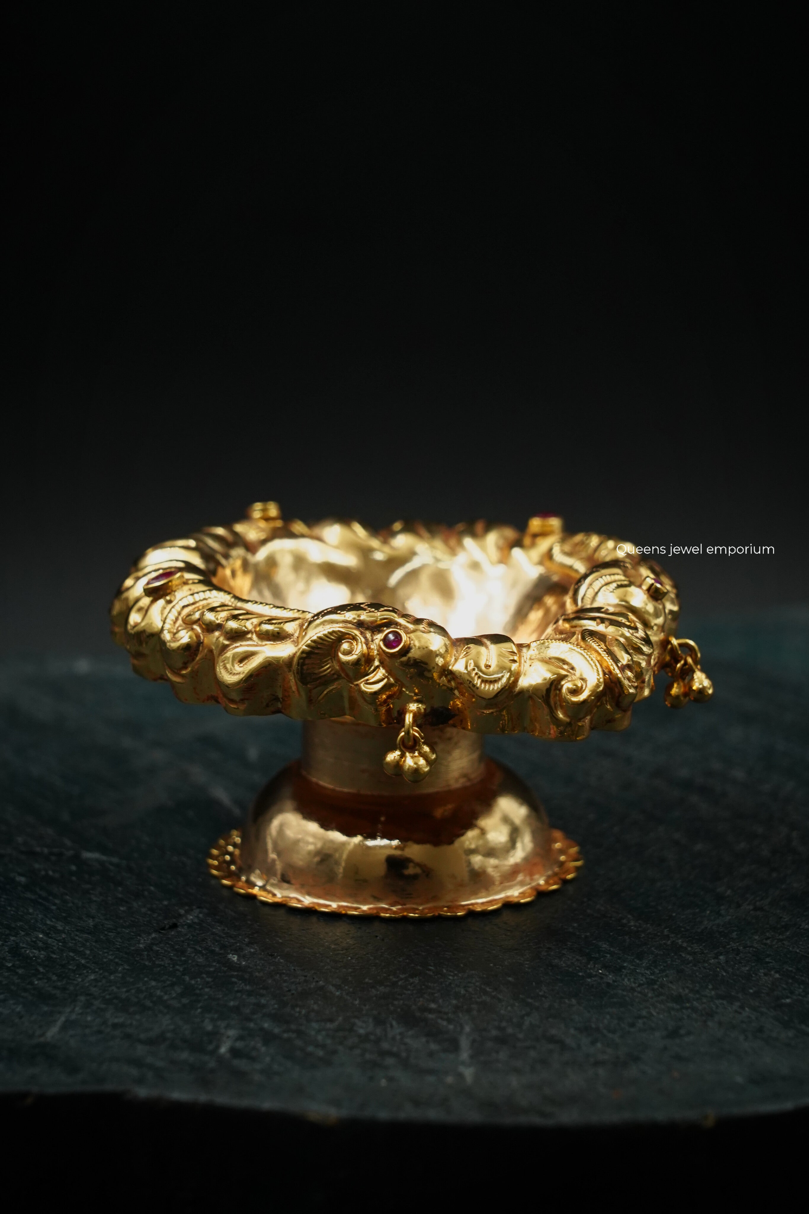 A divine Karthigai nagas vilakku featuring intricate Nagas motifs, symbolizing the goddess of wealth, power, beauty, fertility, and prosperity. Revered as one of the Tridevi, this sacred piece radiates spiritual energy while embodying traditional artistry. Truly a treasure to grace your home and rituals, handcrafted by our expert artisans at Queens Jewel Emporium.