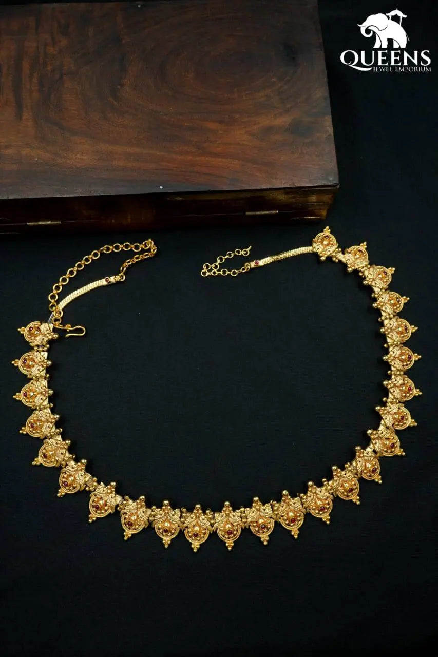Tharagai hip chain features antique work and is adjustable, making it suitable to be worn as a haram as well. It exudes elegance and traditional charm.