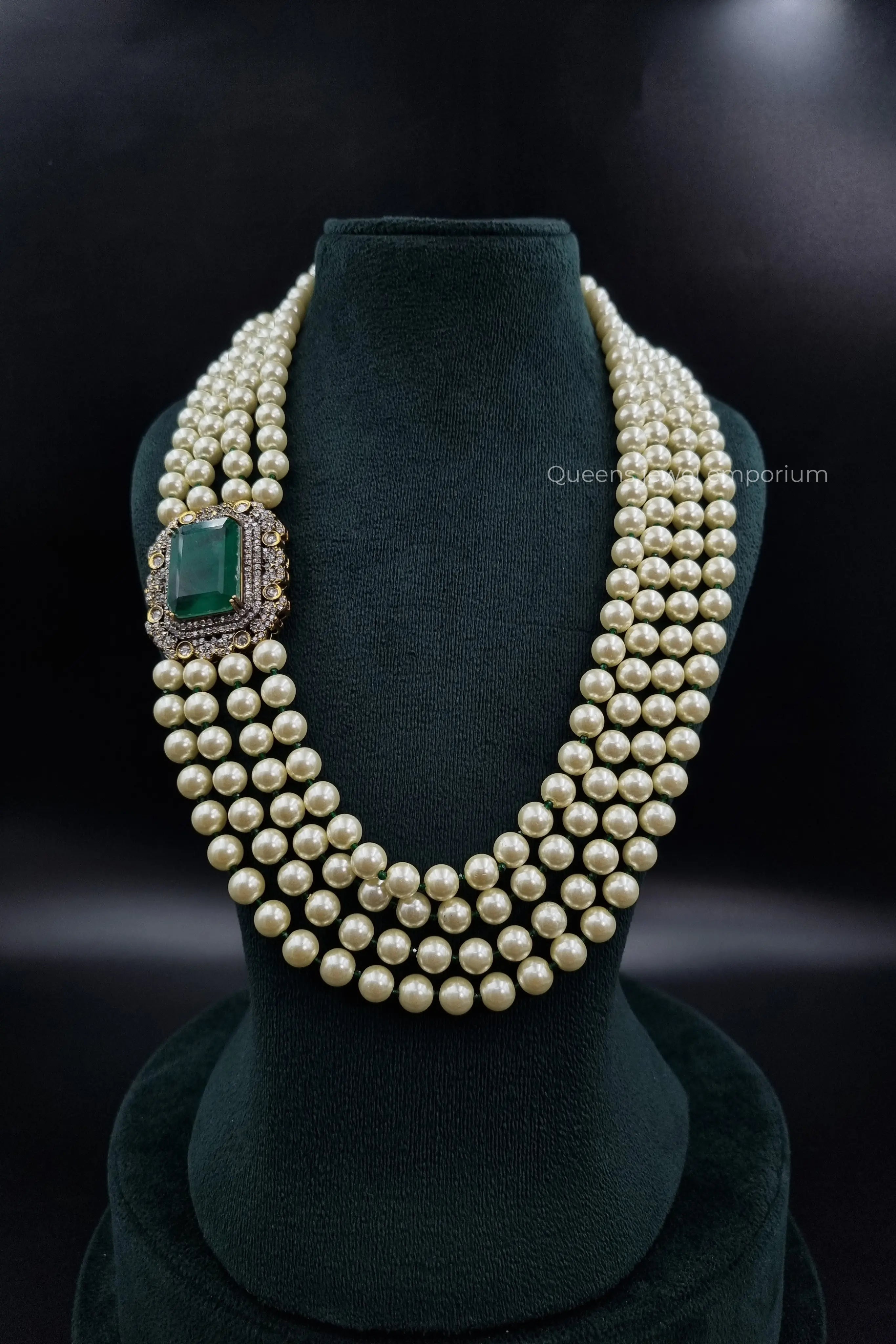 Experience elegance and sophistication with LAHARIKA HARAM. This premium quality accessory features a bold green stone haram and matching earrings embellished with zircon stones. The mugappu style pearl ball chain adds a touch of traditional charm. Elevate any outfit with this statement piece.