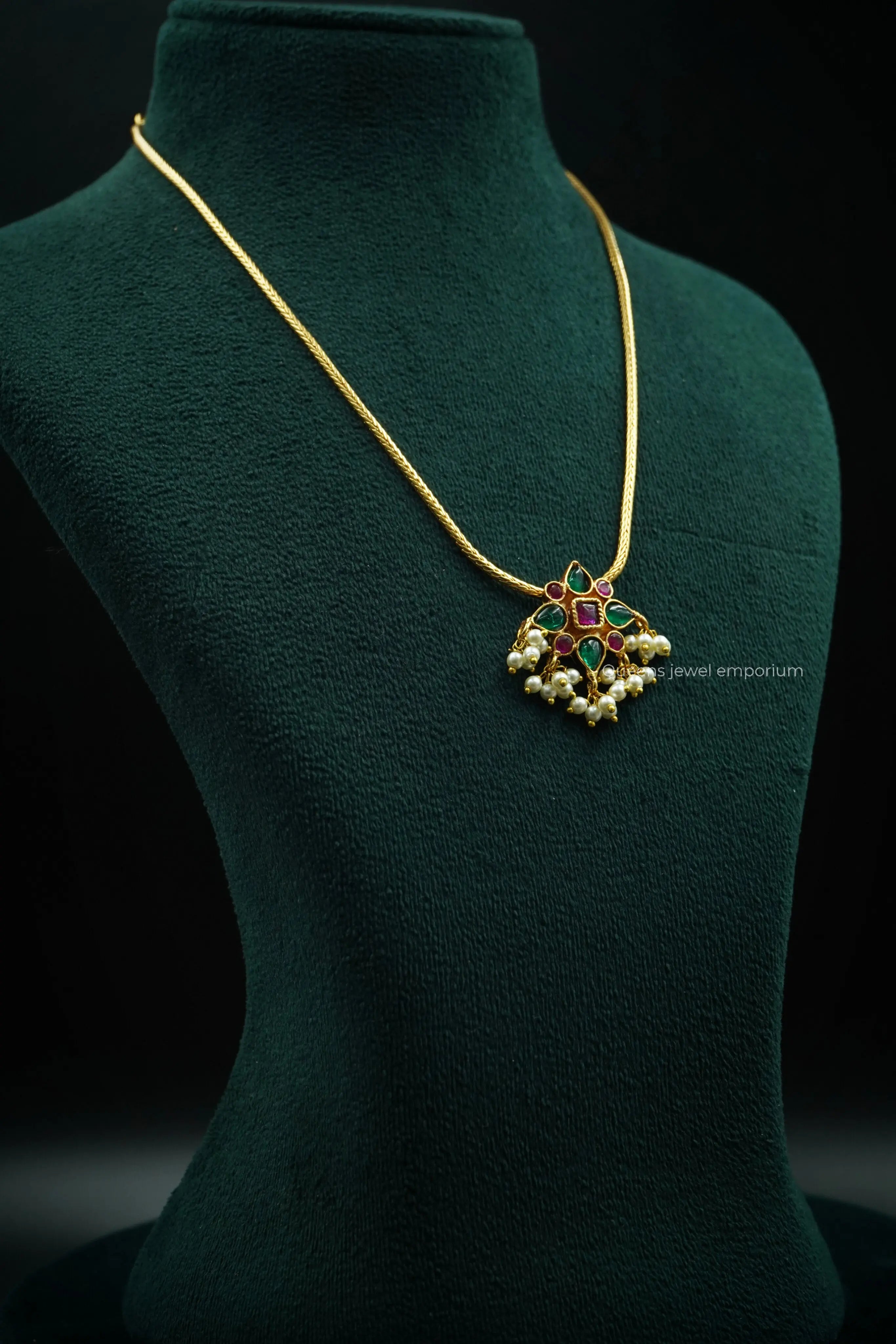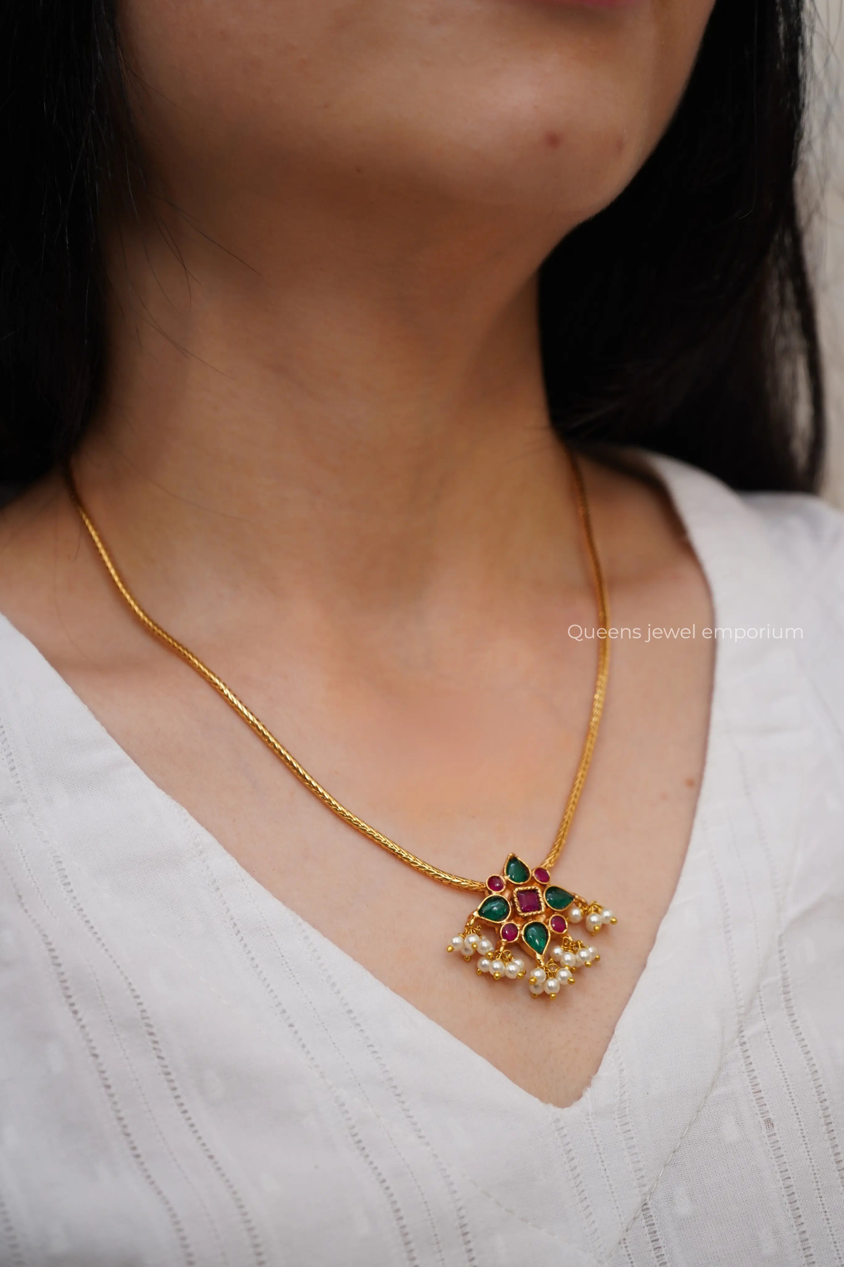 Expertly handmade with traditional South Indian design, the Laksha Necklace is a stunning piece adorned with Kemp stones and a pearl ball hanging. Its simple yet elegant design is complemented by a gold plated and silver alloy construction. Add a touch of sophistication to any outfit with this exquisite necklace.
