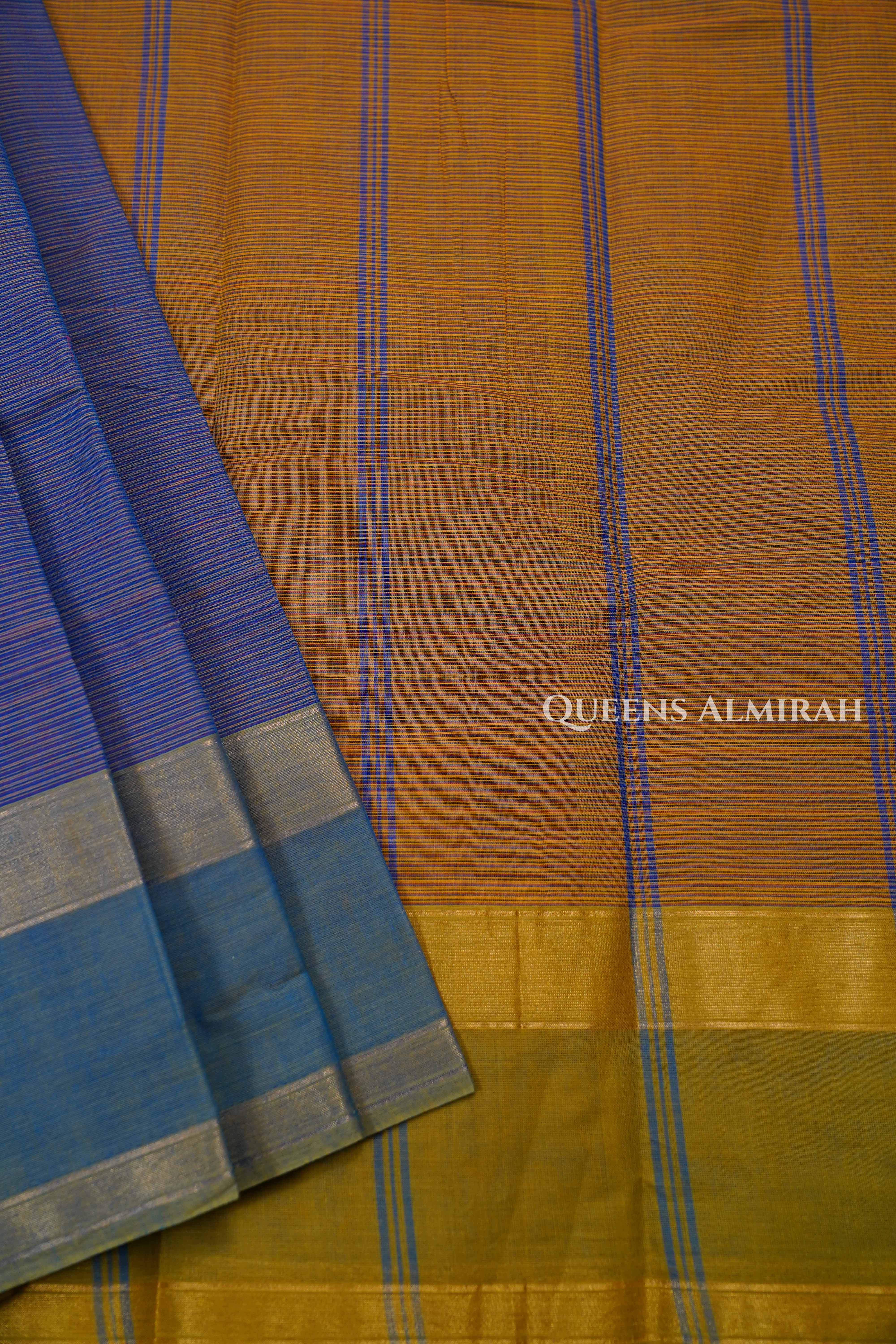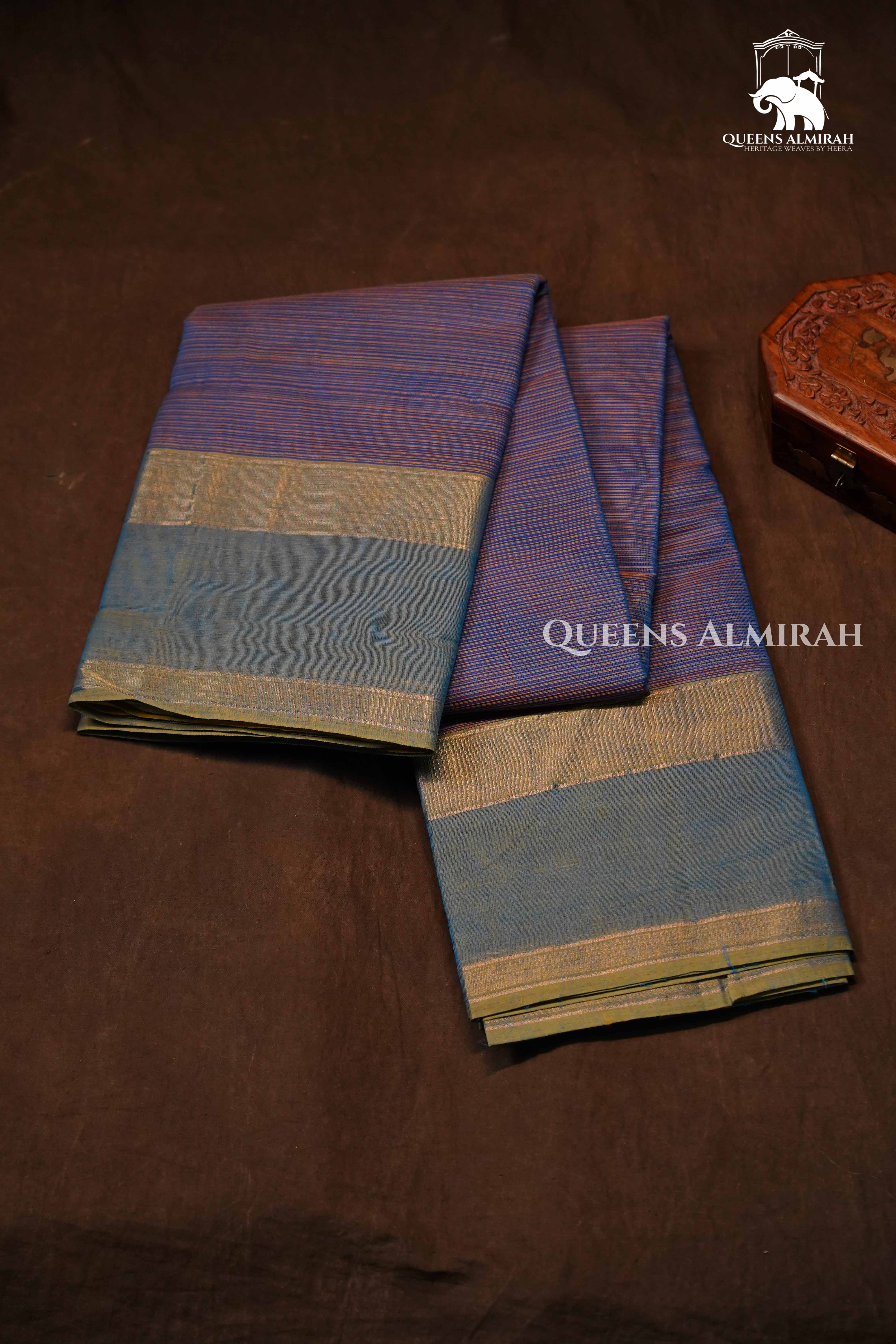 This elegant Chettinad cotton saree comes in a rich Lavender Purple base adorned with fine pinstripes, exuding timeless charm. The muted olive green borders add a subtle yet graceful contrast, enhancing its earthy appeal. Handwoven with traditional craftsmanship, this breathable and lightweight saree is perfect for everyday elegance, casual gatherings, and cultural events.