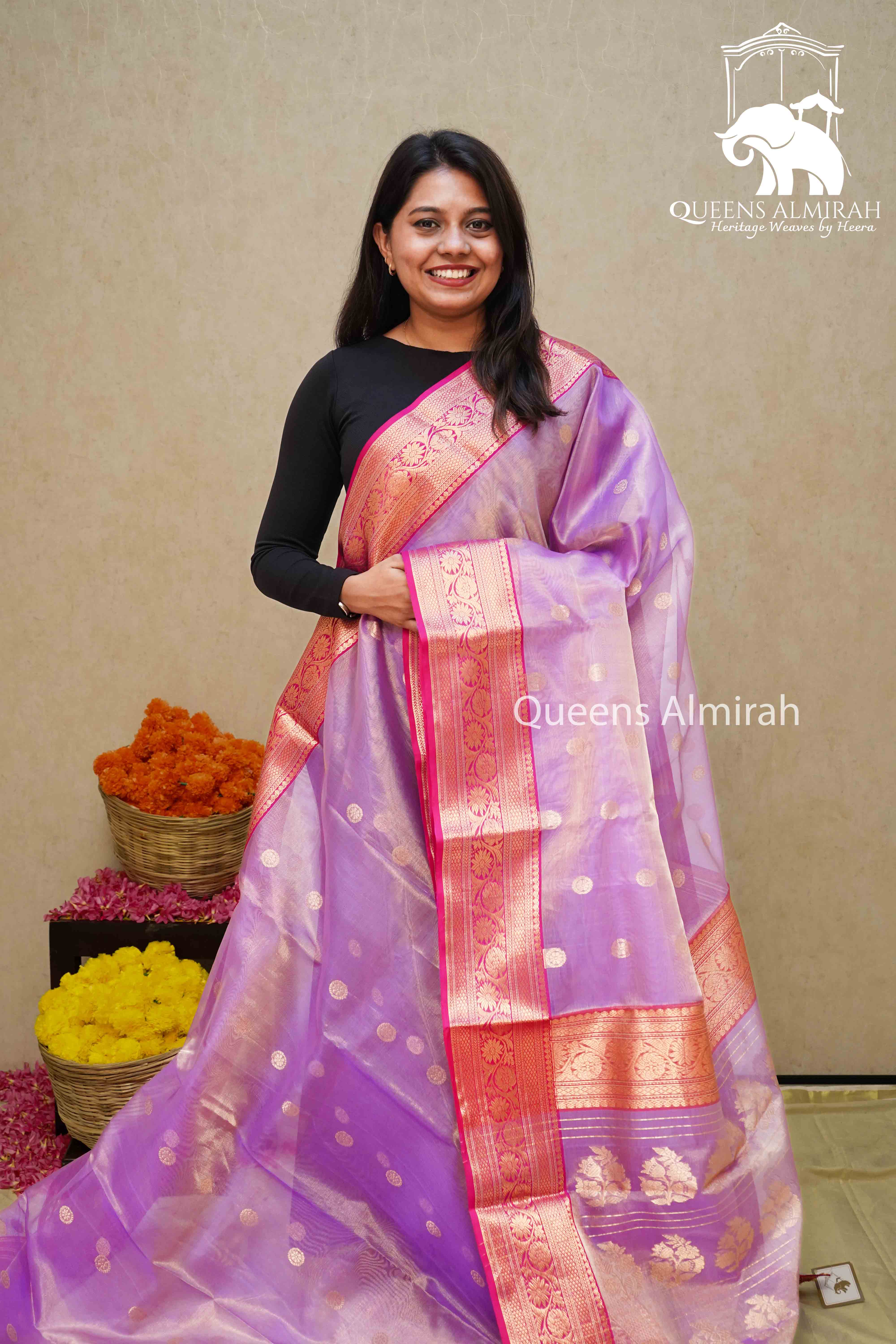 Experience luxury and elegance with our Lavender Purple Handloom Pure Chanderi Silk Saree. Made with intricate Nakshi Zari and Border designs, along with golden mango and butta motifs, this saree is perfect for special occasions. Stand out and make a statement with this exquisite piece.