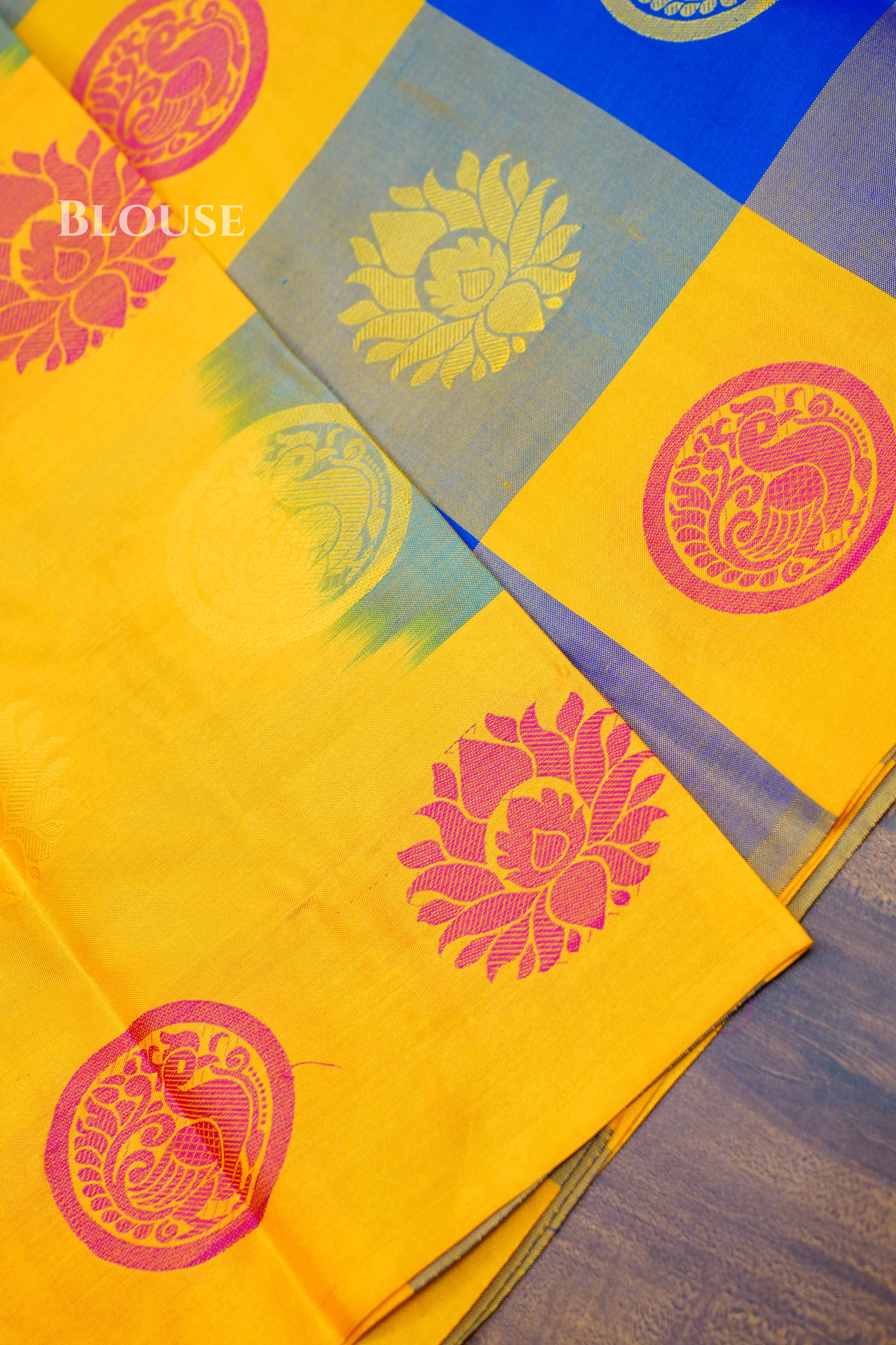 "Elegant Kuravanji silk saree in off-and-on checks of Green and mustard, highlighted with vibrant floral and paisley motifs, paired with a striking green body — perfect for weddings, festive occasions, and cultural celebrations."