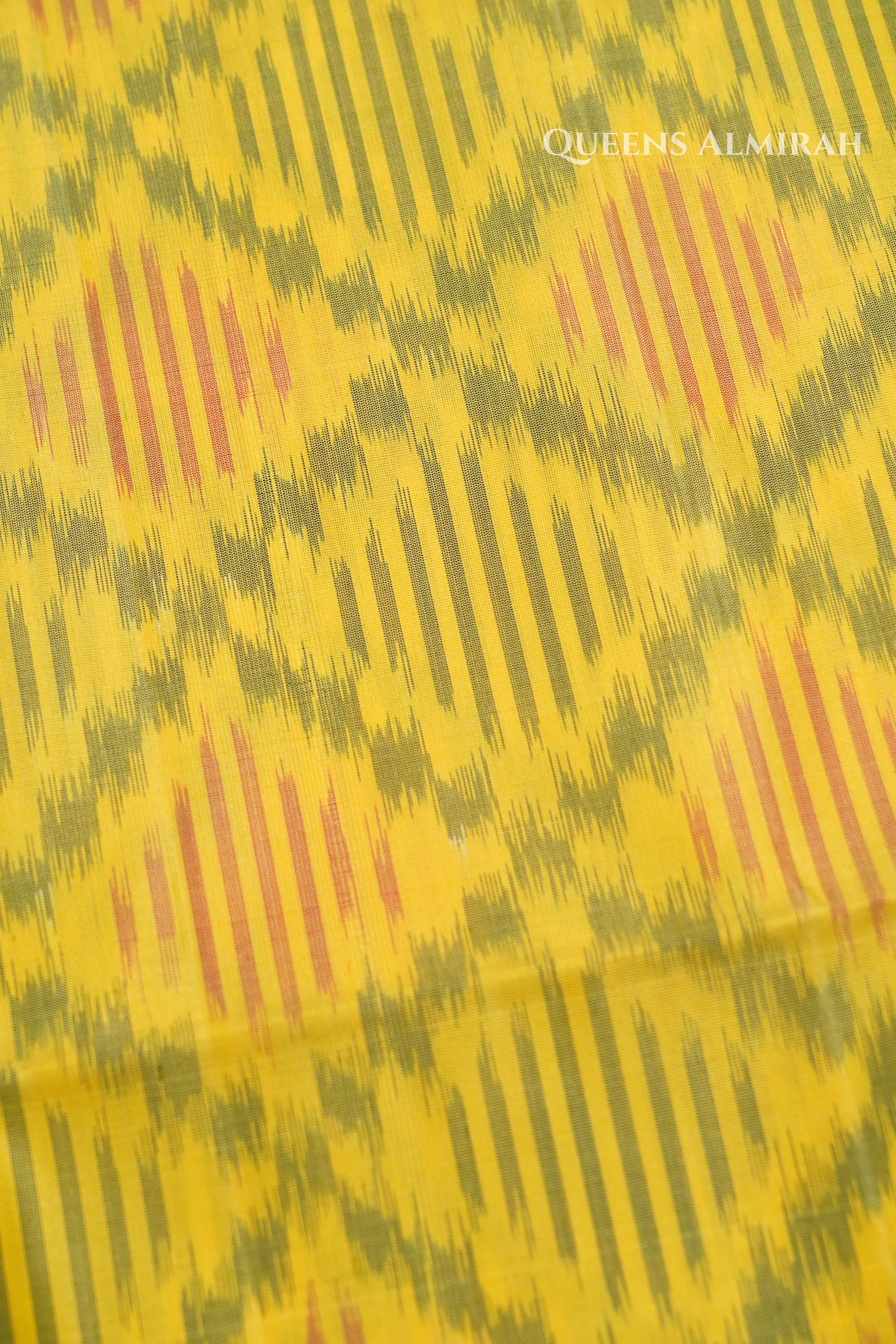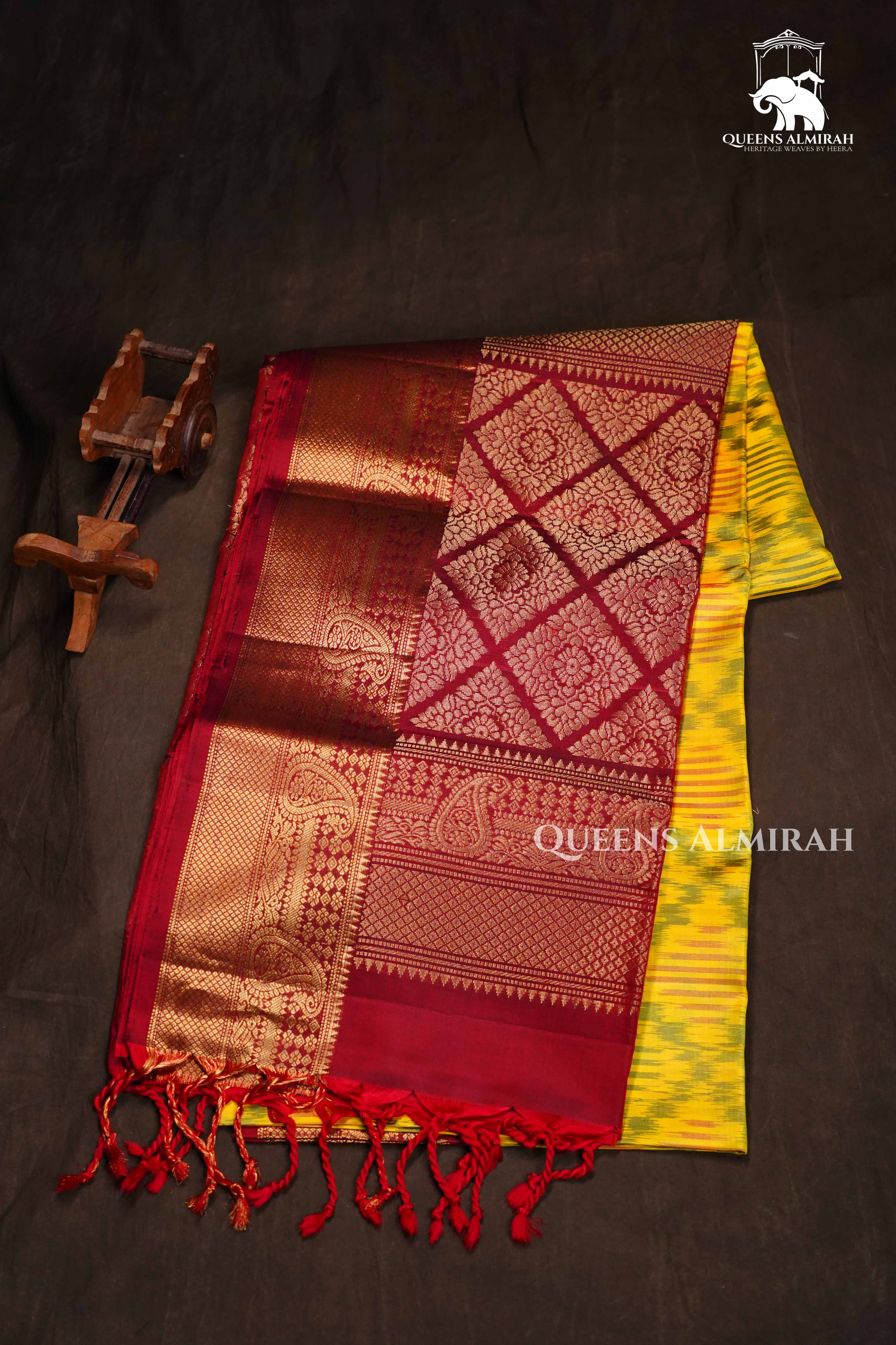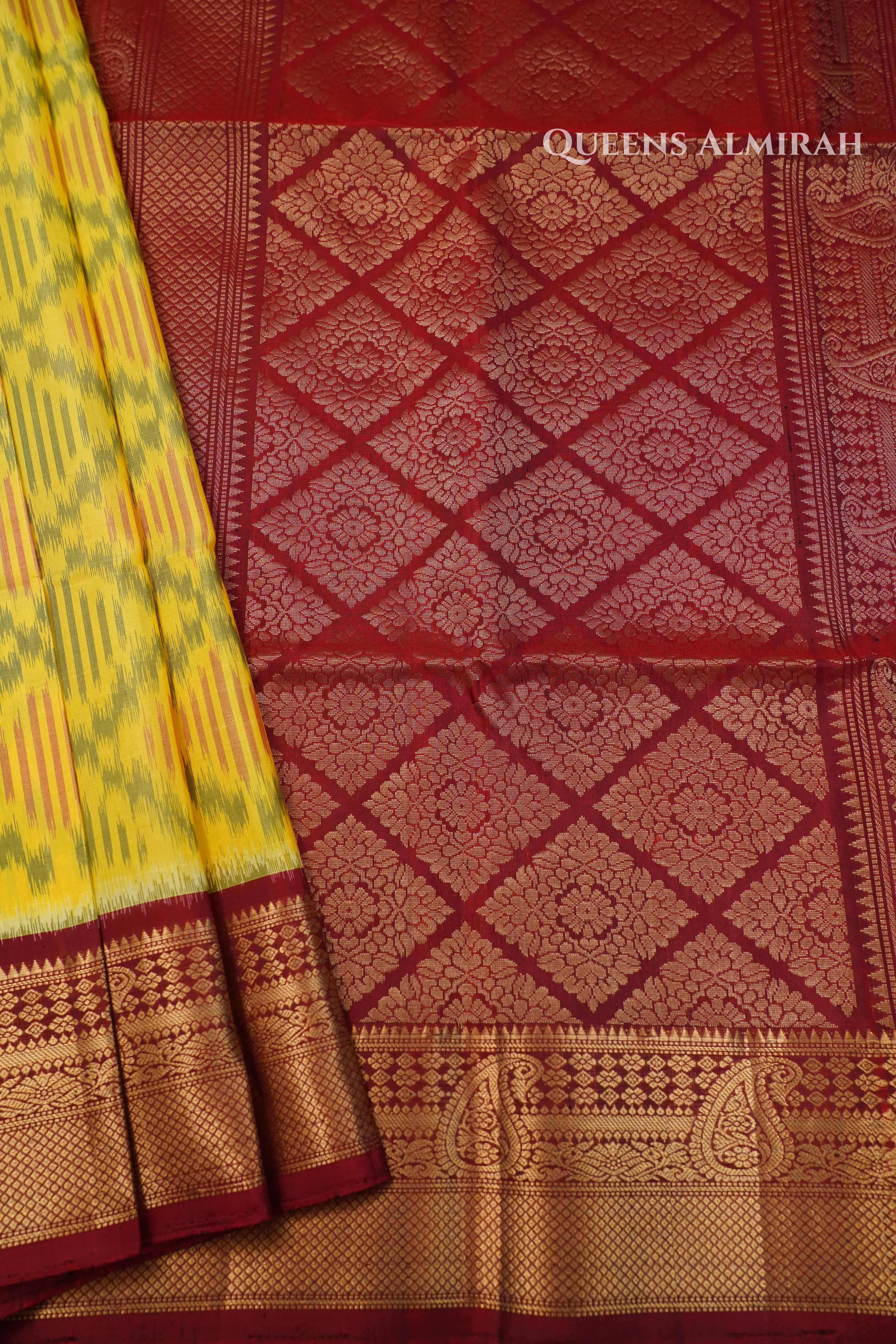 A radiant blend of tradition and artistry, this soft silk saree features a vibrant yellow body with striking Ikat-inspired geometric patterns. The rich maroon border and pallu are woven with intricate gold zari paisley and floral motifs, adding timeless grandeur. Perfect for weddings, festive celebrations, and special occasions.