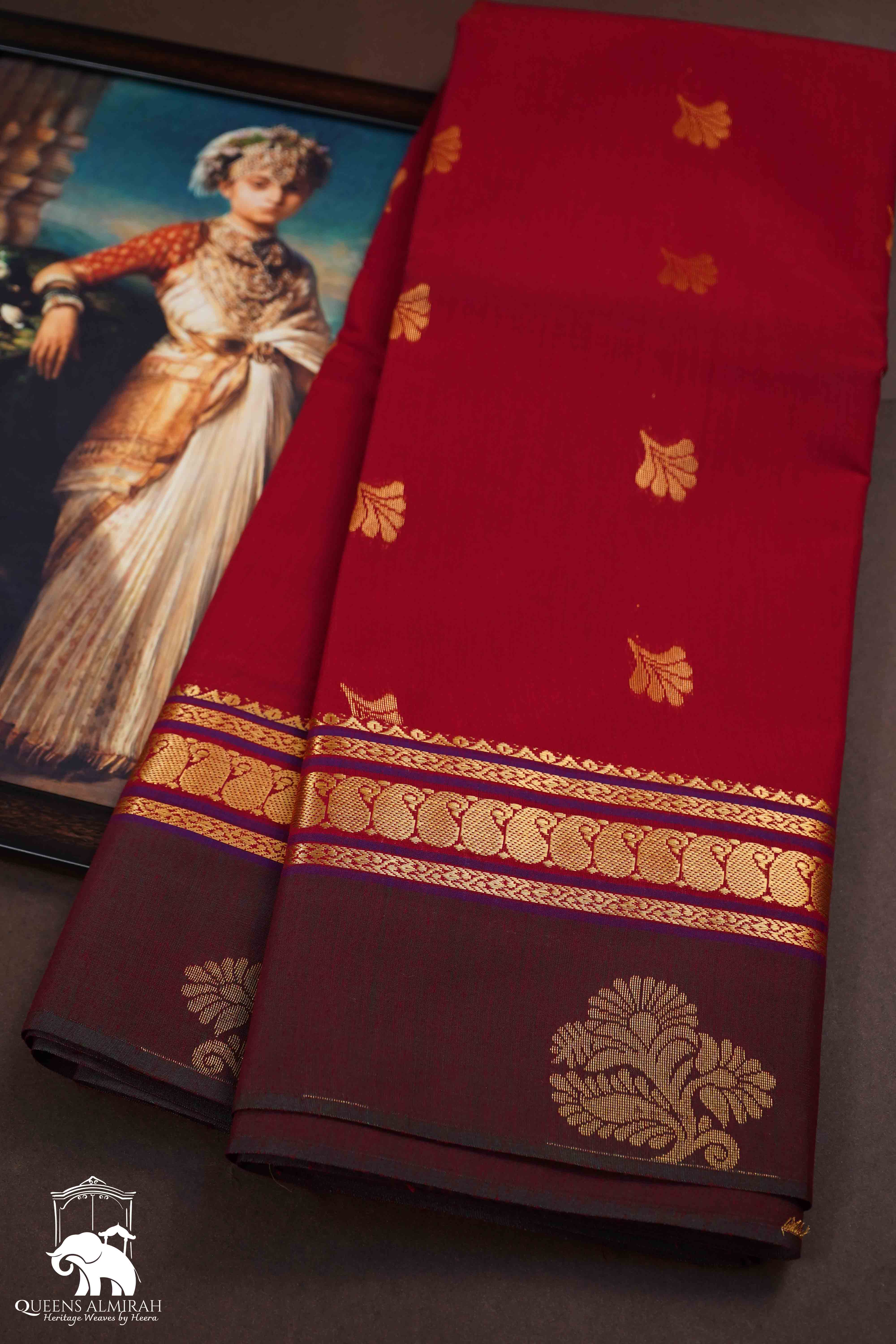 Elevate your wardrobe with the Light Burgundy Pure Silk Cotton saree. Crafted from pure Kanchi silk cotton, this saree features a beautiful golden border and intricate mango designs. With all-over floral motifs, it offers both comfort and style. Upgrade your look with this luxurious and expertly crafted piece.