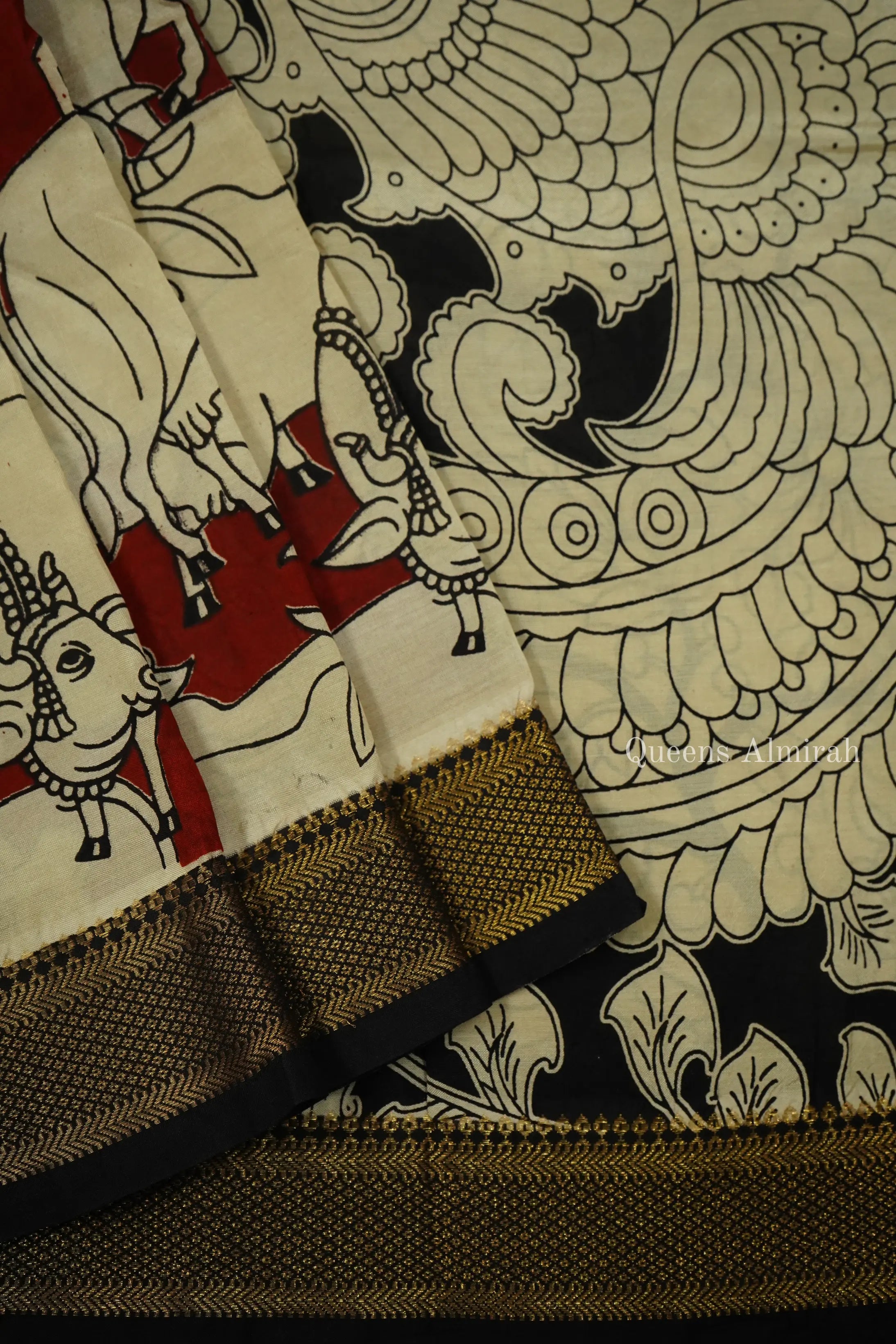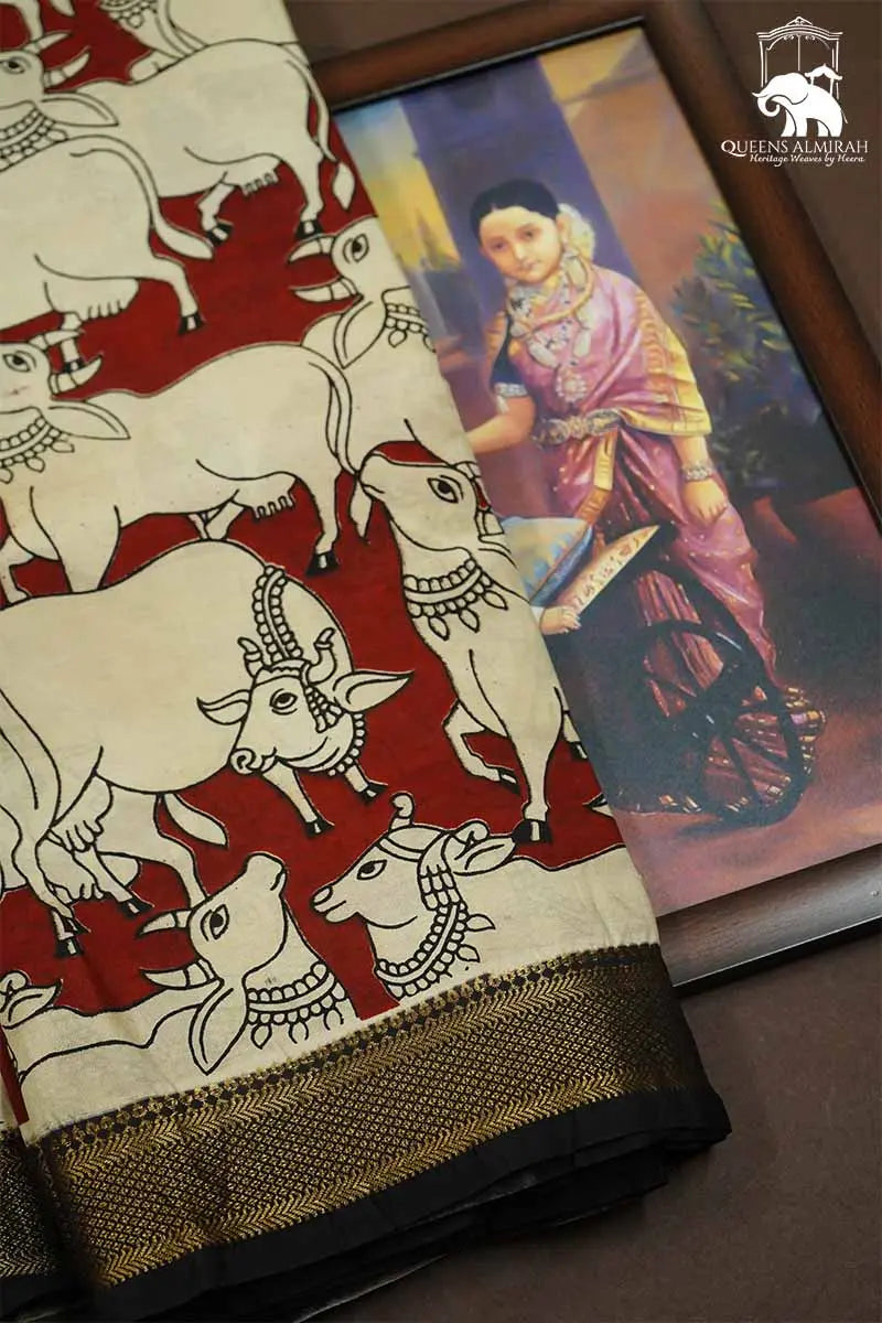 Enhance your wardrobe with this exquisite Light Maroon and Bright Grey Mangalgiri Saree. The soft sheen fabric and rich Kalamkari design add a touch of elegance, while the attached blouse and beautiful Malif cow design make it a versatile choice for any occasion. Elevate your style with this stunning saree.
