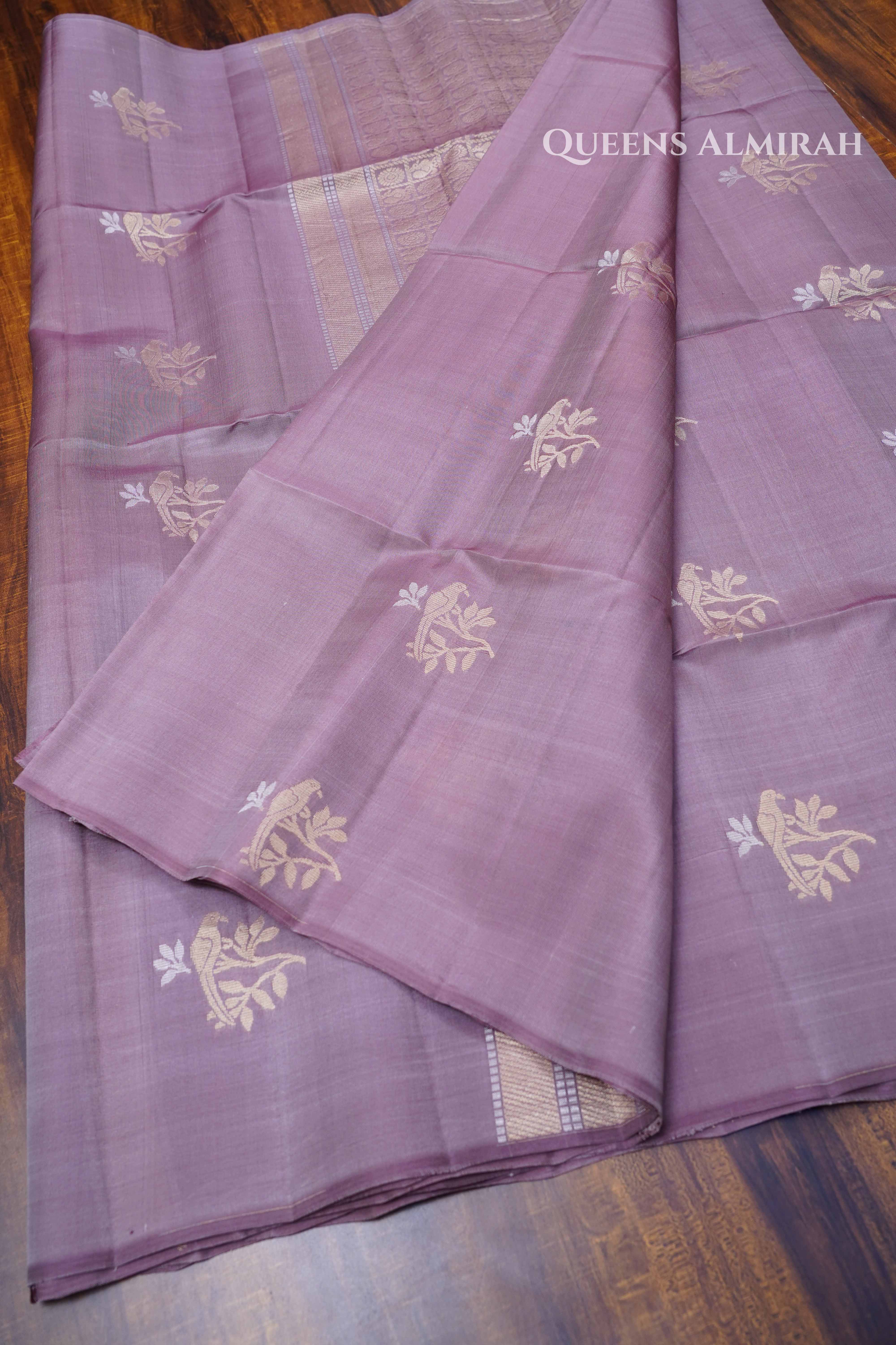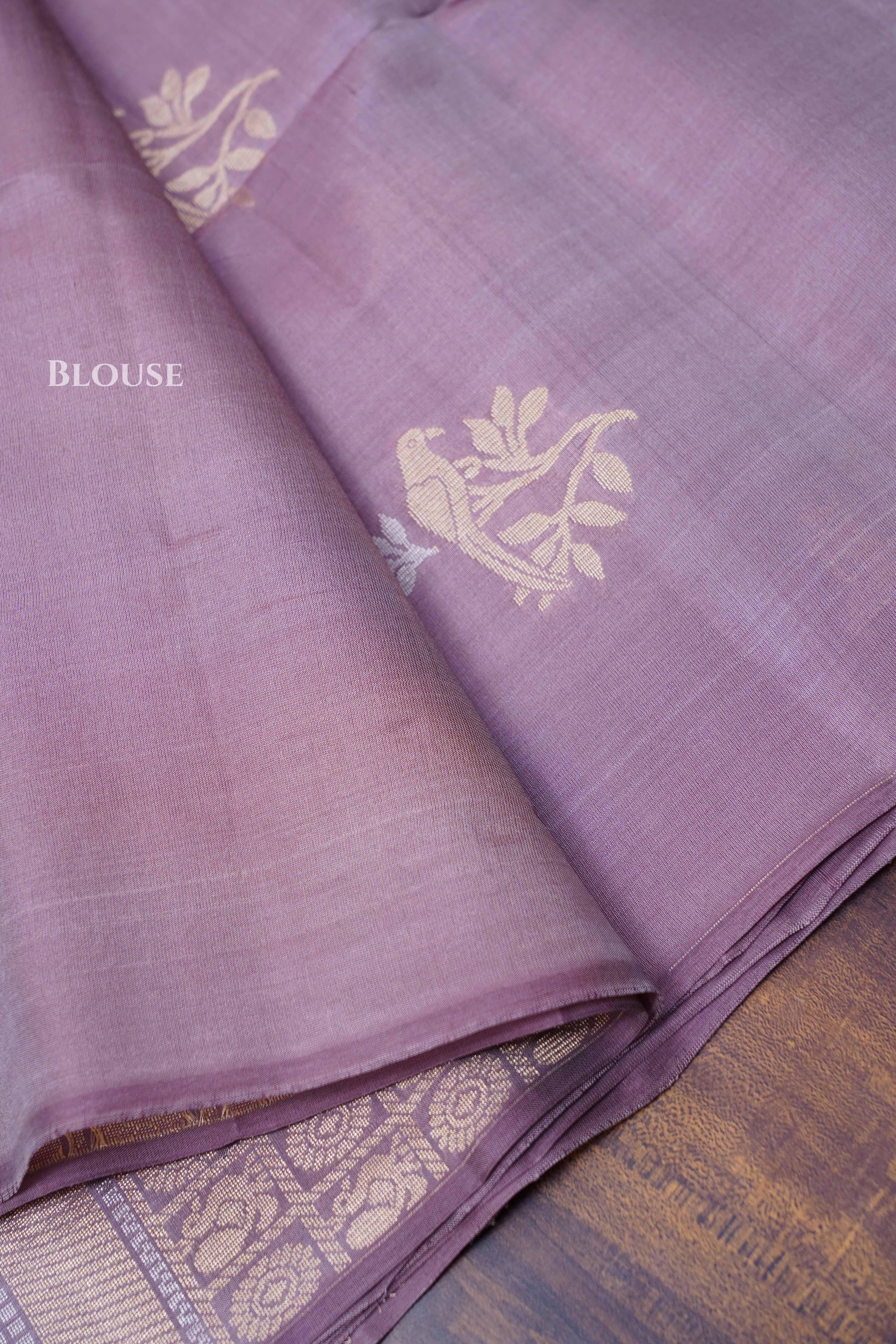 This graceful Light Mauve Pure Kora Soft Silk Saree features delicate silver zari motifs across the body, complemented by a traditional zari border and pallu. Lightweight, elegant, and festive-perfect, it’s a timeless drape from Queens Almirah.