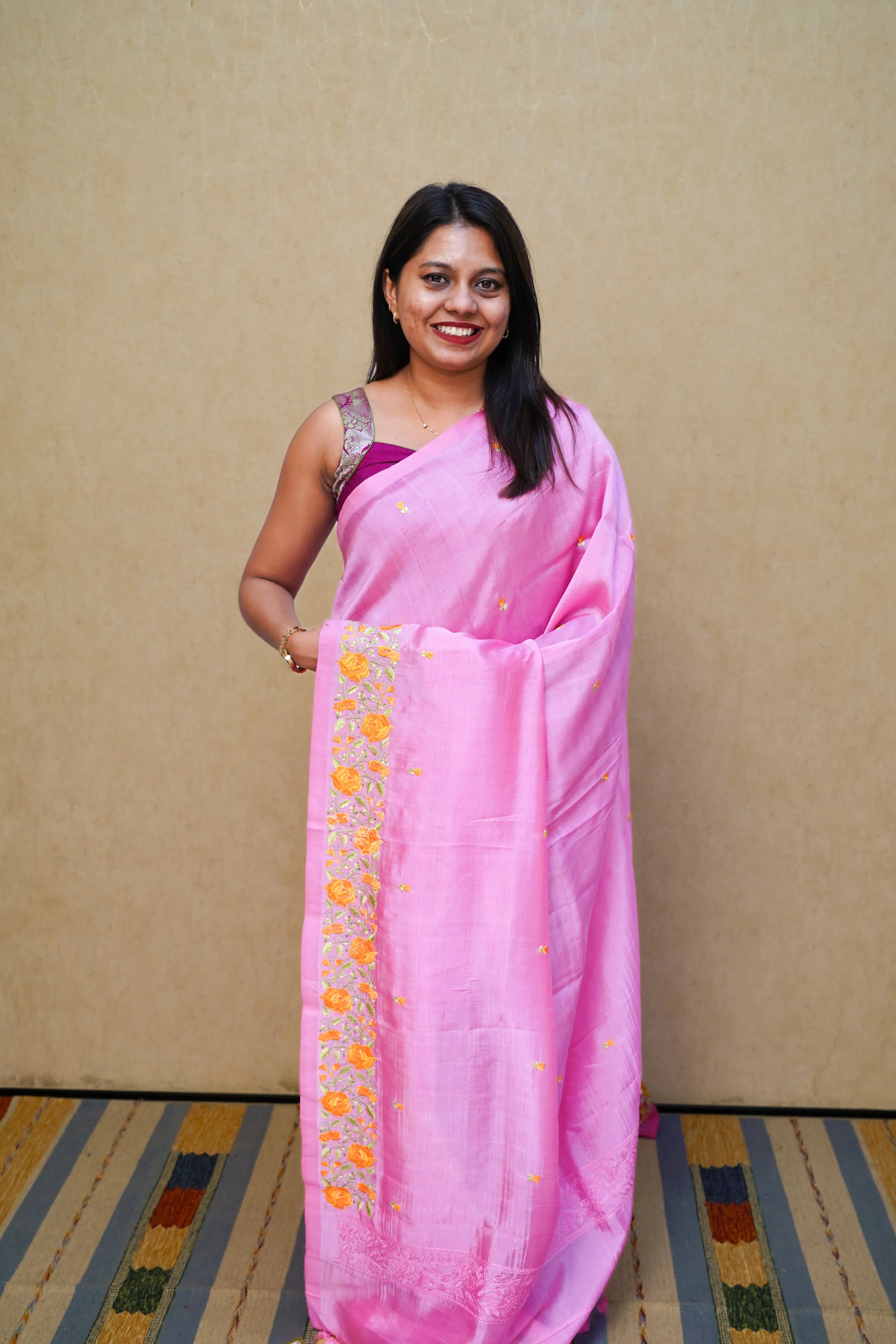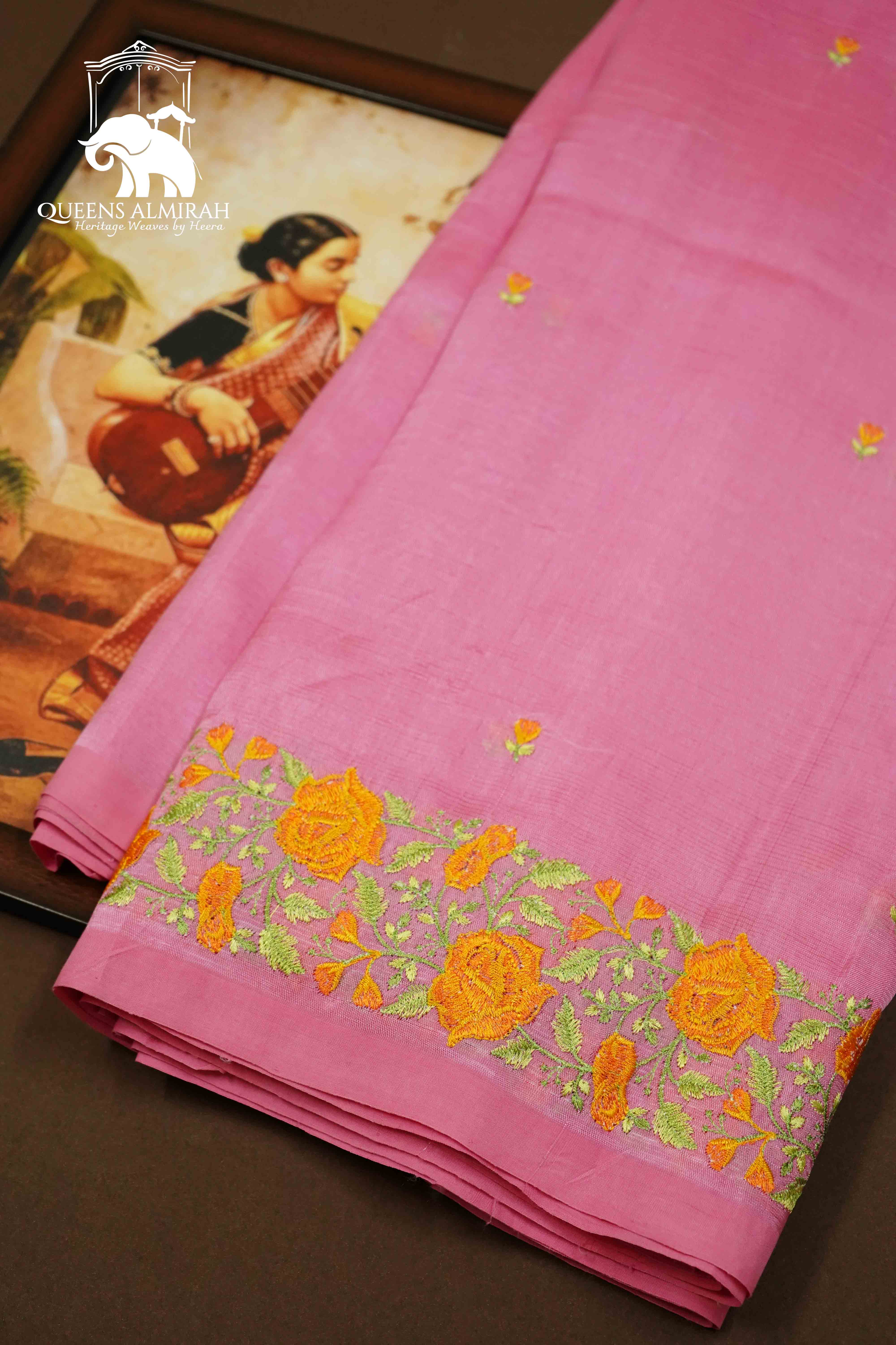 This exquisite Lilac Pink Mangalgiri With Embroidery Saree boasts thread embroidery and a beautiful floral motif, giving it a luxurious and unique appearance. Elevate your wardrobe with this stunning saree that exudes elegance and sophistication.