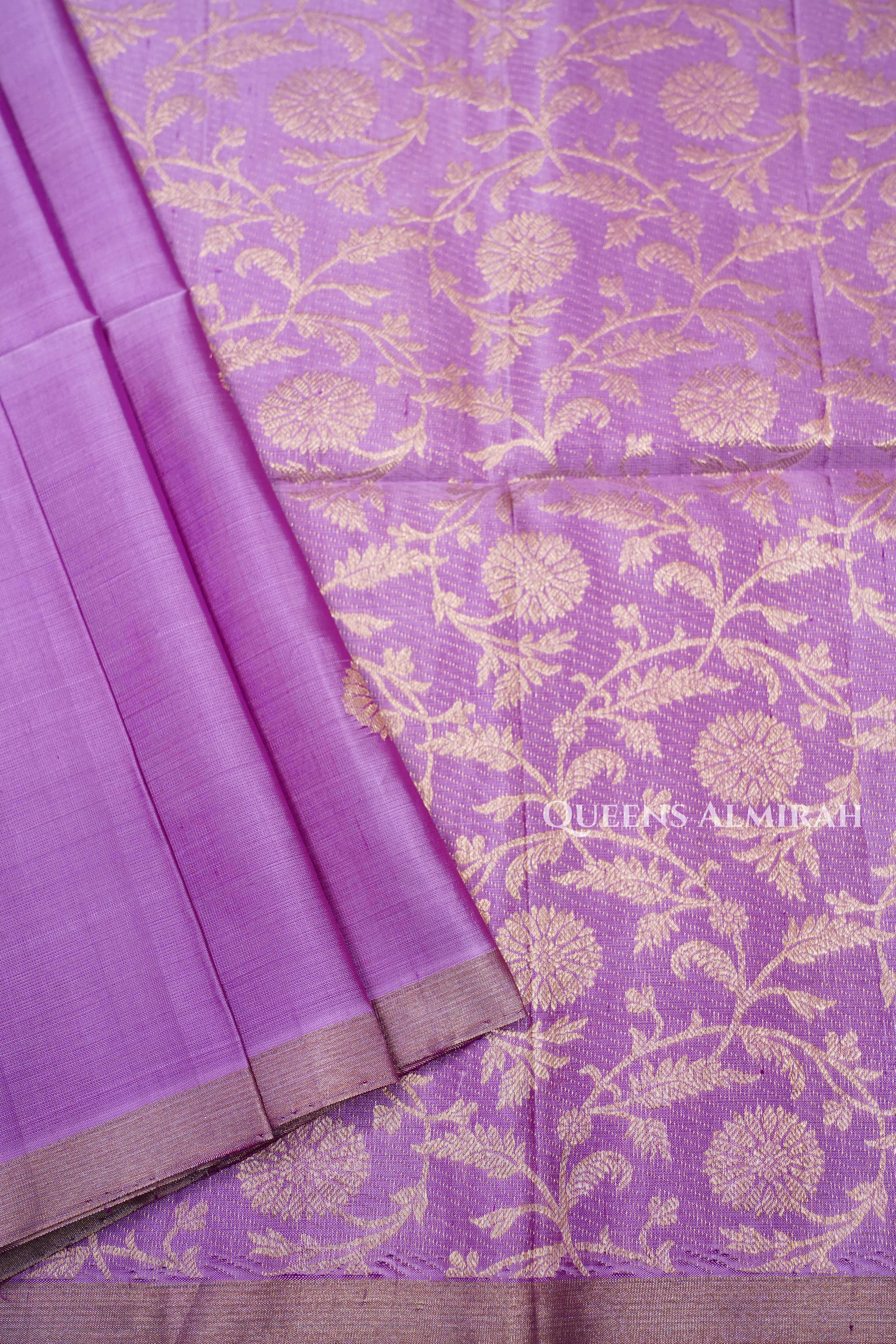 An elegant purple soft silk saree featuring delicate golden buttas across the body, paired with a finely woven zari border and intricate pallu. Finished with soft tassels, this drape beautifully blends richness with subtle charm, perfect for festive and traditional occasions.