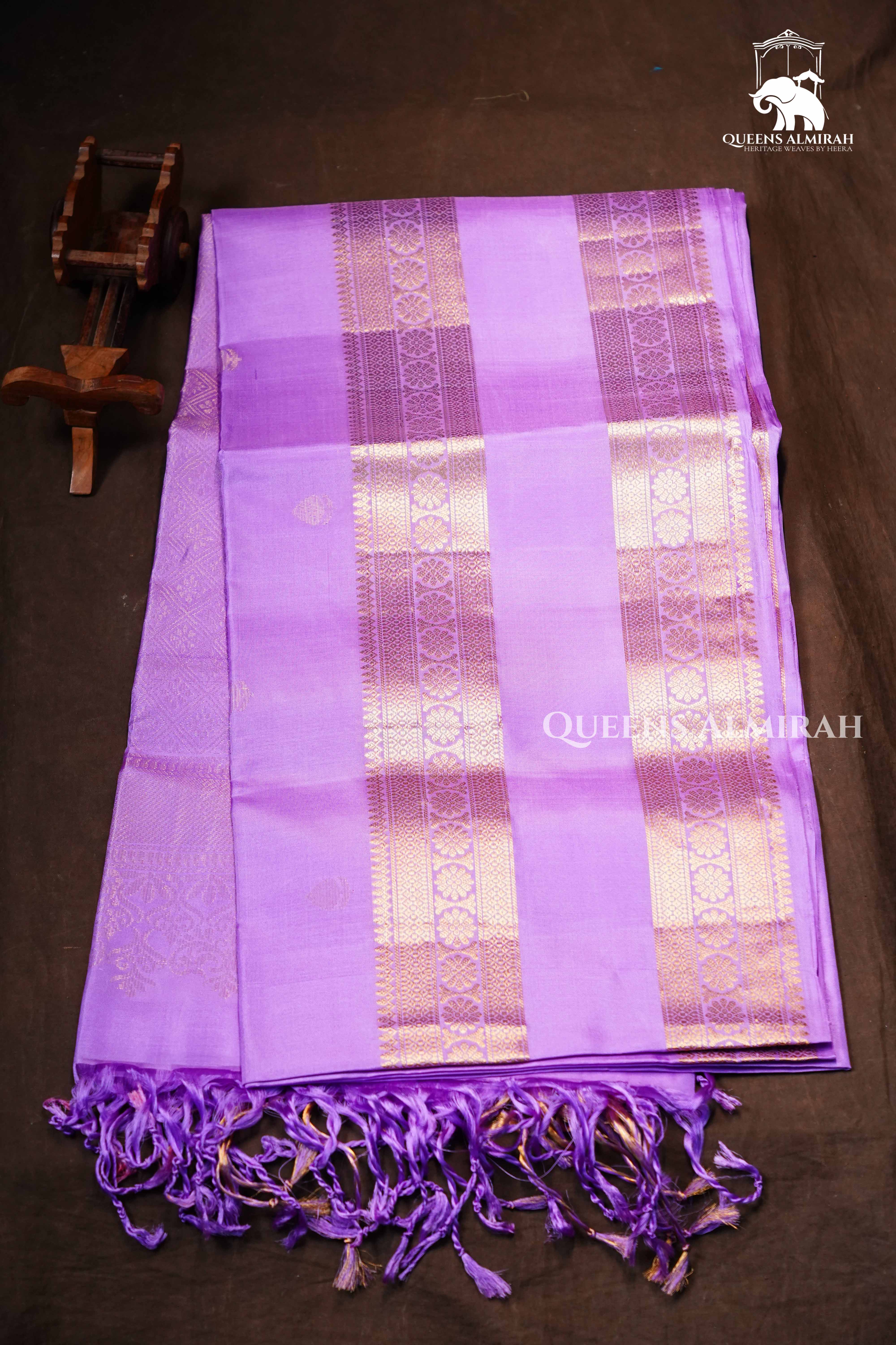 A graceful lavender-hued soft silk saree adorned with delicate gold zari floral motifs along the borders. The smooth, lightweight weave paired with its subtle sheen makes it a charming pick for festive gatherings, weddings, and Navaratri celebrations. Elegant, airy, and effortlessly stylish — this saree is a perfect blend of tradition and sophistication.