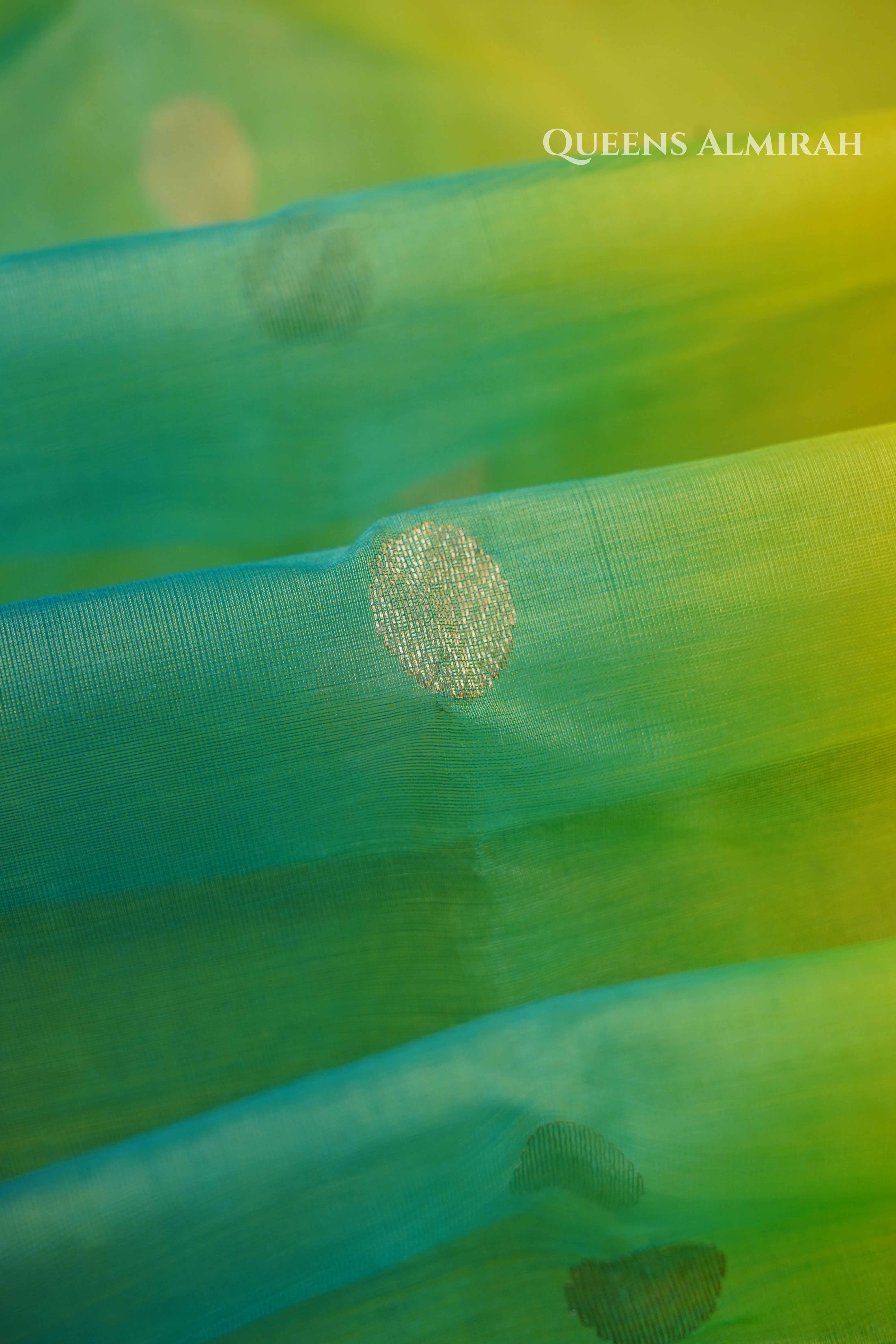 Step into elegance with this Lime Green and Teal Blue Pure chanderi Silk Saree, a radiant blend of tradition and grace. Handwoven in pure silk, the saree features a stunning dual-tone body with subtle gold buttas and a richly woven navy blue zari border adorned with intricate floral and paisley motifs. The pallu complements with elaborate gold zari patterns and delicate vertical lines, enhancing the regal appeal. Ideal for weddings, festivals, and special celebrations, this saree is a timeless addition to your ethnic wardrobe.