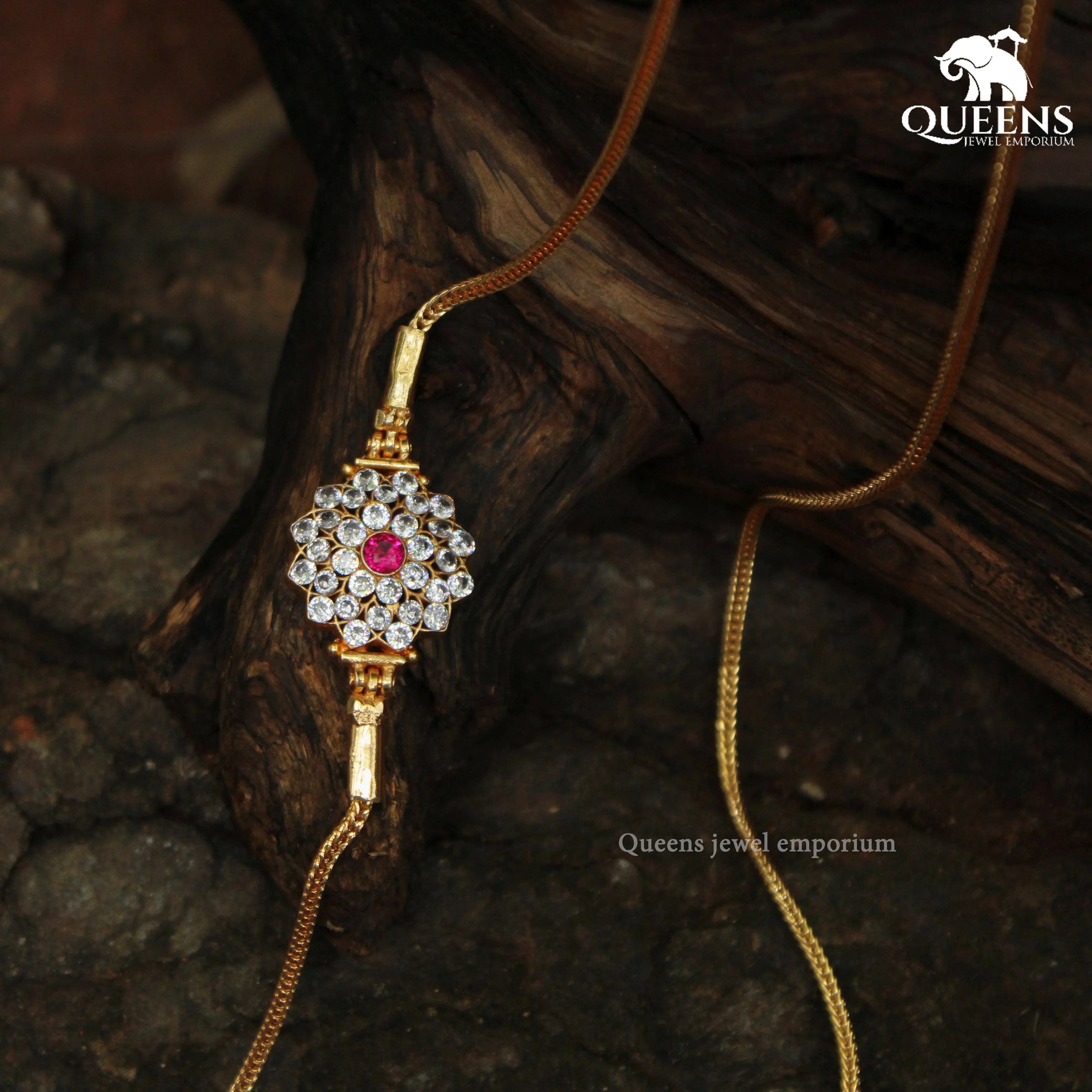 Queen's exclusive collection of simple Mogappu (A single ruby red kemp stone secured by the army of sparkling white zircons gives it the beauty of white lotus )in chains