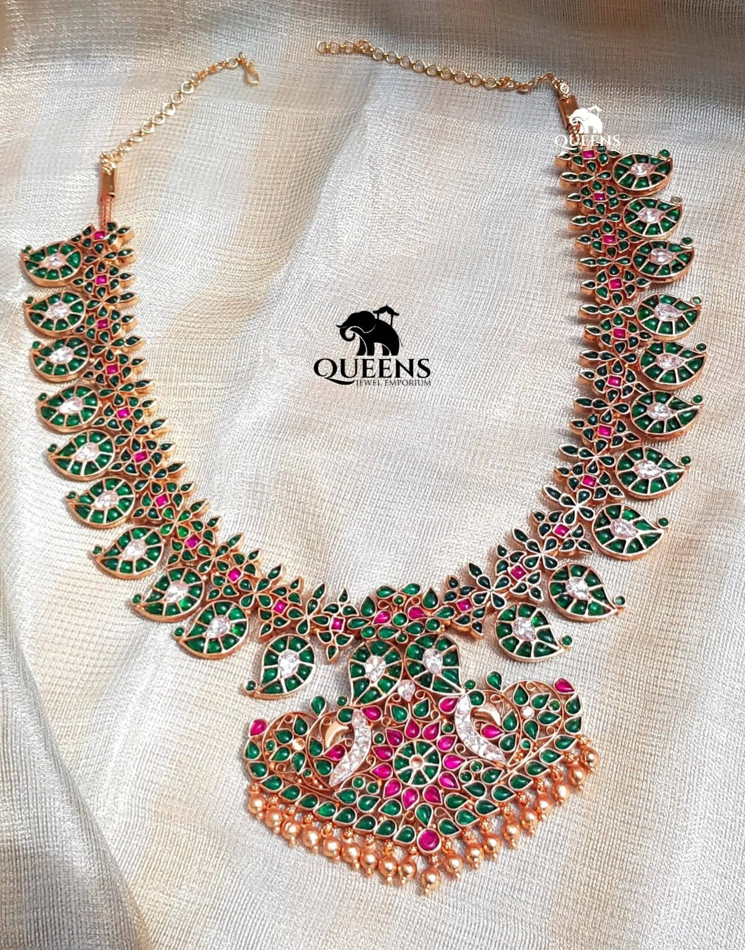 Ever trendy traditional midlength mango malai crafted especially for the special you!His exuberent jewellery is perfect for wedding ceremonies and grand occasions. Crafted with a classic fusion of exquisite craftsmanship and feminine elegance this haram in green kemp is an unique and classy edition.