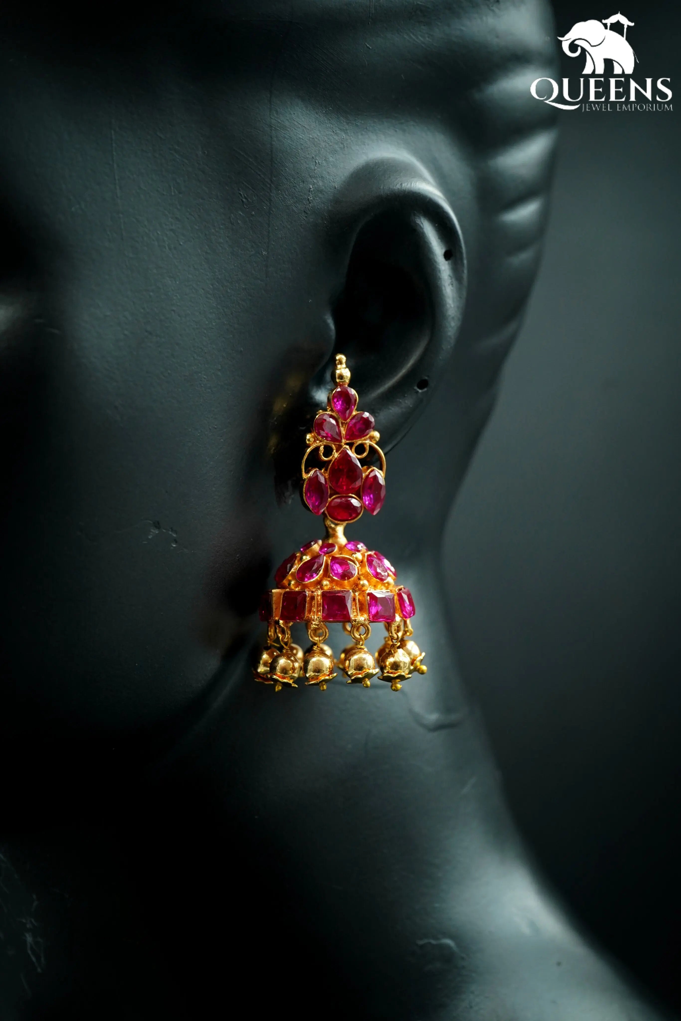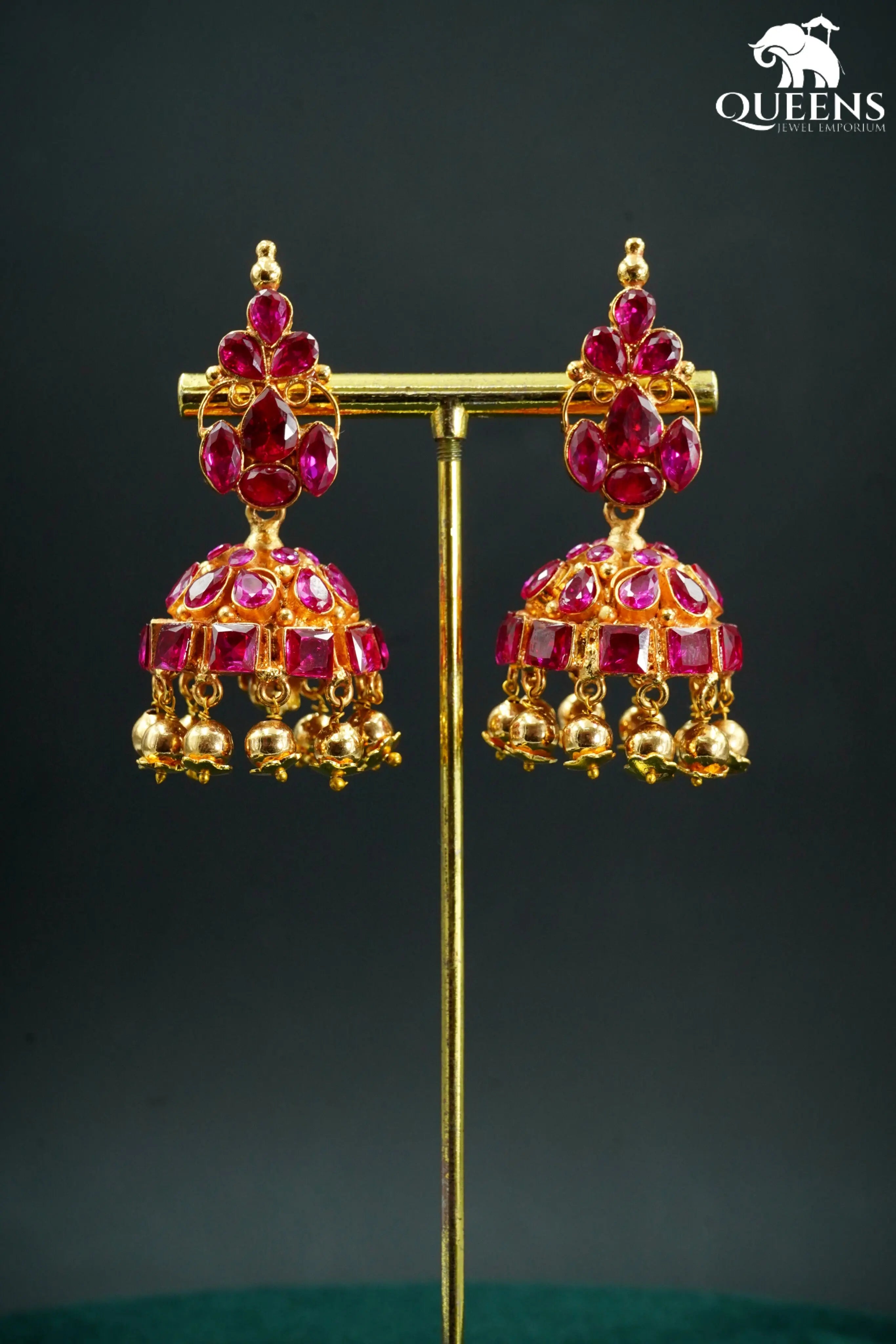 Unveil the captivating beauty of South Indian jewelry with these enchanting jhumkas, crafted from gleaming gold-plated silver alloy. Featuring a stunning combination of sparkling zircon stones and captivating pink stones, these earrings add a touch of playful elegance and vibrant color to any outfit.